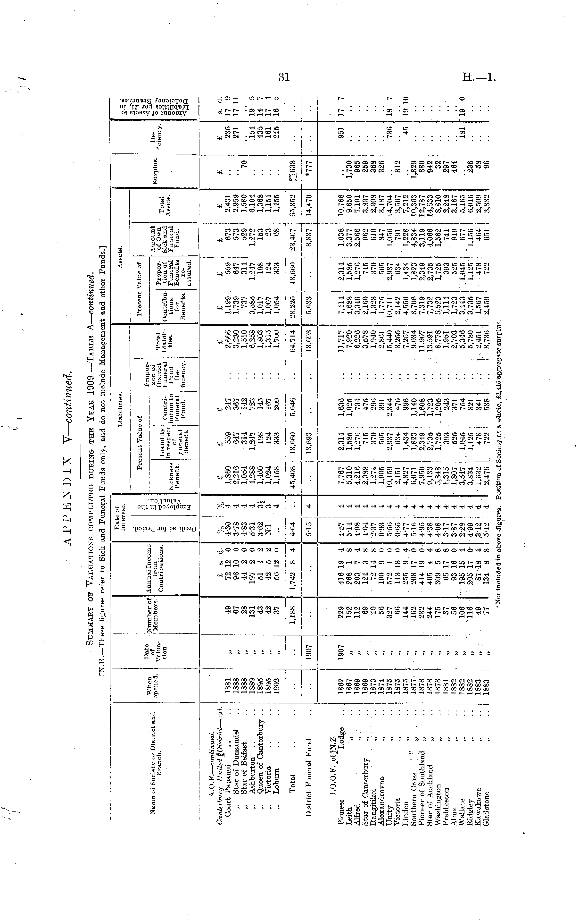 [B .B.— Th. ise figures refer to Sick ,nd Funeral Funds only, and do not include Manageme; t and other Funds.] Rati Intel ! Of 'est. Liabilities. Assets. to alls Name of Society or District and Branch. When opened. Date of Valuation Number of Members. Annual Income from Contributions. C a; 'J a a — o m Liability Contri . Sickness m res t P ect bution to Benefit. Fuaeral Funeral Benefit. Fund " Present Value of Proportion of District Funeral Fund Deficiency. Total Liabilities. ProporContribu- tion of tions Funeral for Benefits Benefits. reassured. Present Value of Amount of Own Sick and Funeral Fund. Total Assets. Surplus. Deficiency. A. O. F.— continued. Canterbury United —ctd. Court Papanui „ Star of Dunsandel „ Star of Belfast ,, Ashburton ,, Queen of Canterbury .. „ Victoria ,, Loburn 1881 1888 1888 1889 1895 1895 1902 49 67 28 131 43 42 37 £ s. d. 72 12 0 96 10 0 44 2 0 197 2 0 51 1 2 42 5 2 56 12 0 0/ ! 0/ /o /o 4-30 4 3-78 4 4-83 4 5-31 4 3-62 31 Nil 3 4 £ 1,860 2,216 1,054 4,288 1,460 1,024 1,158 £ 559 647 314 1,247 198 124 333 £ 247 367 " 142 723 145 167 209 £ 2,666 3,230 1,510 6,258 1,803 1,315 1,700 £ 1,199 1,739 737 3,585 1,017 1,007 1,054 £ 559 647 314 1,247 198 124 333 £ 673 573 529 1,272 153 j 23 68 | £ 2,431 2,959 1,580 6,104 1,368 1,154 1,455 £ "70 £ 235 271 s. d. 17 9 17 11 .154 435 161 245 19 5 14 7 17 4 16 5 Total 1,188 1,742 8 4 4-64 45,408 13,660 5,646 64,714 28,225 13,660 j 23,467 65,352 Q638 District Funeral Fund 1907 5-15 ! 4 13,693 13,693 5,633 8,837 j 14,470 *777 I.O.O.F. pi JN.Z. Pioneer Lodge Leith „ .: Alfred Star of Canterbury „ Rangitikei ,,' "".'". Alexandrovna ,, Unity ,, Victoria ,, Linden ,, .. j Southern Cross J.,. ,,,., Pioneer of Southland ,', Star of Auckland „ Washington „ Prebbleton ,, Alma ,, Wallace „ Ridgley ,, Kawakawa „ Gladstone „ 1862 1867 1869 1869 1873 1874 1875 .. 1875 j 1875 1877 1878 1878 1878 1881 1882 1882 1882 1883 1883 1907 >> 229 152 112 69 40 56 327 66 144 162 232 244 175 37 56 106 116 49 77 416 19 4 268 1 8 203 7 4 124 3 8 72 14 8 100 9 0 572 1 0 118 18 0 255 9 4, 208 17 0 414 19 0 465 4 4 309 5 8 65 17 8 93 16 0 195 15 4 205 17 0 87 18 4 134 8 8 4-57 4 5-14 4 4-98 4 4-04 4 2-37 4 0-93 4 5-56 4 0-65 4 4-77 4 5-16 4 4-95 ; 4 4-38 ; 4 4-08 ; 4 3-17 i 4 3-87 ' 4 2-28 . 4 4-99 4 3-12 4 5-12 ; 4 7,767 5,310 4,216 2,388 1,274 1,905 10,159 2,151 4,827 6,071 7,950 9,133 5,848 1,315 1,807 3,547 3,834 1,632 2,476 2,314 1,636 i .. 11,717 1,585 : 1,025 I .. 7,920 1,276 734 .. 6,226 715 475 .. 3,578 370 296 .. 1,940 565 ' 391 .. 2,861 2,937 j 2,344 .. 15,440 634 | 470 .. 3,255 1,434 I 996 .. 7,257 1,823 1,140 .. 9,034 2,349 1,608 .. 11,907 2,735 : 1,723 .. 13,591 1,725 1,205 .. 8,778 393 243 .. 1,951 525 371 .. 2,703 1,045 754 "".," 5,346 1,125 821 .. 5,780 478 I 341 .. 2,451 722 I 538 .. 3,736 7,414 4,688 3,349 2,160 1,328 1,775 10,711 2,142 4,550 3,706 7,319 7,732 5,523 1,114 1,723 3,443 3,735 1,567 2,459 2,314 : 1,038 ' 10,766 1,585 ; 3,377 9,650 1,276 ! 2,566 7,191 715 I 962 3,837 370 ! 610 2,308 565 | 847 3,187 2,937 ! 1,056 14,704 634 j 791 3,567 1,434 1,228 ! 7,212 1,823 I 4,834 j 10,363 2,349 ! 3,119 ! 12,787 2,735 ! 4,066 i 14,533 1,725 ; 1,562 ! 8,810 393 j 741 2,248 525 I 919 j 3,167 1,045 677 j 5,165 1,125 ■ ' 1,156 ! 6,016 478 , 464 | 2,509 722 i 651 ! 3,832 1,730 965 259 368 326 312 1,329 880 942 32 297 464 951 736 45 17 18' 19 li 181 19 1 236 58 96 *N< it included in aboi e figures. Pi 3Sition of -ociety as a whole, £1,415 aggregate surplus.