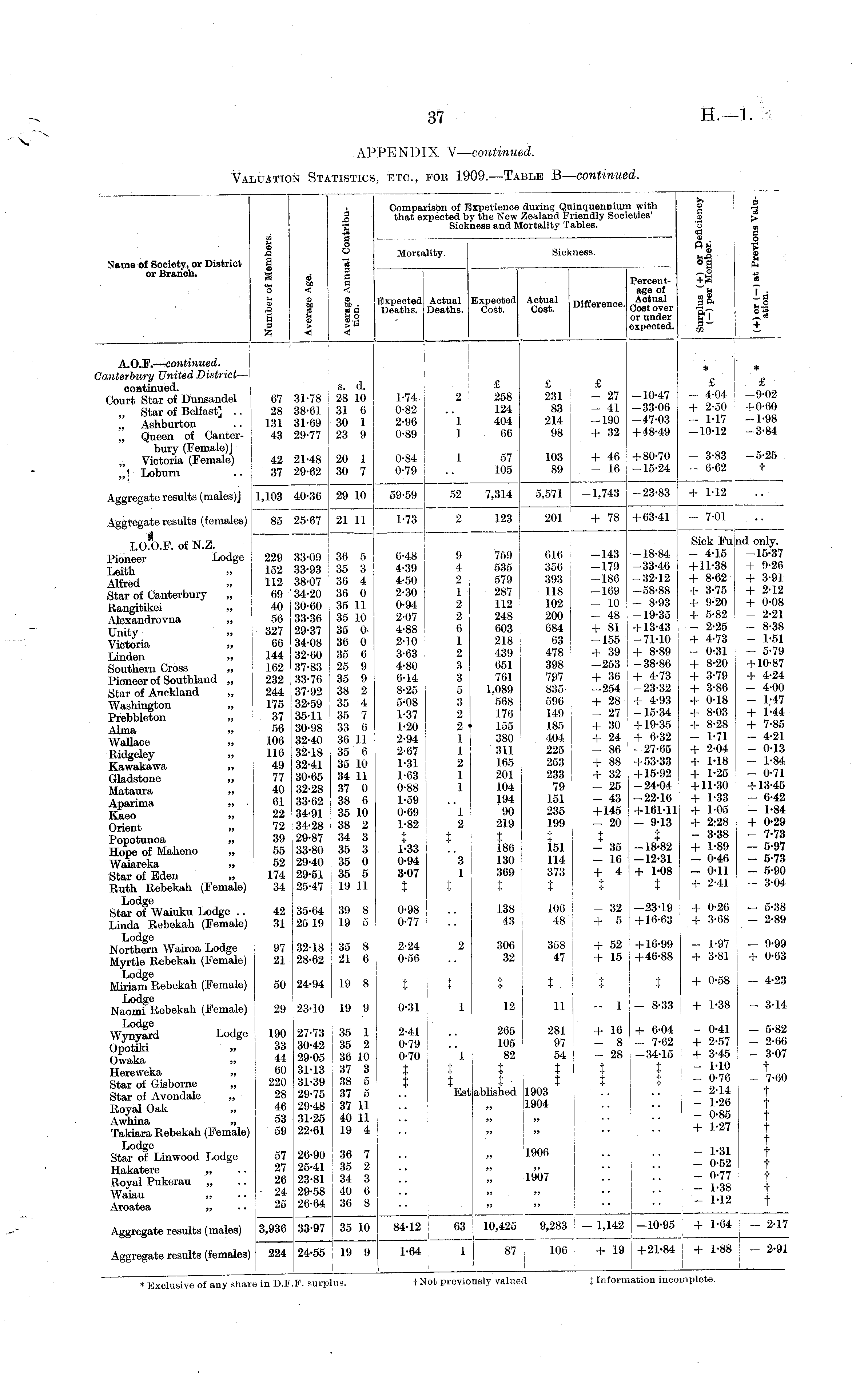 Name of Society, or District or Branch. m © a © ■s © a a -A 'u fl o o < a a a < © oS K J-f o ©.a 5~ Compi that < Morti irison of ixpected 1 Sicl lity. Experience during Quinquennium with iy the New Zealand Friendly Societies' :ness and Mortality Tables. Sickness. © © © Am © °a r~ © +a •I a o> si B > VB p > . © n p-t +3 <3 Id + © © © Expected Deaths. Actual Deaths. Expected Actual Cost. Coat. Difference. Percentage of Actual Cost over or under expected. A.O.F. — continued. Canterbury United District— 1 continued. Court Star of Dunsandel „ Star of Belfast} .. „ Ashburton „ Queen of Canterbury (Female)J „ Victoria (Female) „' Loburn .. 67 28 131 43 31-78 38-61 31-69 29-77 s. d. 28 10 31 6 30 1 23 9 1-74 0-82 2-96 0-89 2 1 1 £ 258 124 404 66 £ 231 83 214 98 £ - 27 - 41 -190 + 32 -10-47 -33-06 -47-03 + 48-49 * £ - 4-04 + 2-50 - 1-17 -10-12 * £ -9-02 + 0-60 -1-98 -3-84 42 37 21-48 29-62 20 1 30 7 0-84 0-79 1 57 105 103 89 + 46 - 16 + 80-70 -15-24 - 3-83 - 6-62 -5-25 t Aggregate results (males)] 1,103 40-36 29 10 59-59 52 7,314 5,571 -1,743 -23-83 + 1-12 Aggregate results (females) g I.O.O.F. of N.Z. Pioneer Lodge LeSth ,. | Alfred Star of Canterbury „ Rangitikei „ Alexandrovna „ Unity >, Victoria „ Linden » Southern Cross „ Pioneer of Southland „ Star of Auckland „ Washington „ Prebbleton „ Alma )> Wallace „ Ridgeley >, Kawakawa „ Gladstone „ Mataura „ Aparima „ Kaeo » Orient » Popotunoa „ Hope of Maheno „ Waiareka » Star of Eden Ruth Rebekah (Female) Lodge Star of Waiuku Lodge .. Linda Rebekah (Female) Lodge Northern Wairoa Lodge Myrtle Rebekah (Female) Lodge Miriam Rebekah (Female) Lodge Naomi Rebekah (Female) Lodge Wynyard Lodge Opotiki » Owaka „ Hereweka „ Star of Oisborne „ Star of Avondale „ Royal Oak „ Awhina » Takiara Rebekah (Female) Lodge Star of Linwood Lodge Hakatere „ Royal Pukerau „ Waiau „ Aroatea „ 85 ! 229 j 152 112 69 40 56 j 327 66 144 162 232 244 175 37 56 106 116 49 77 40 61 22 72 39 55 52 174 34 25-67 ! 33-09 . 33-93 38-07 34-20 30-60 j 33-36 29-37 34-08 I 32-60 37-83 33-76 37-92 32-59 35-11 30-98 32-40 32-18 32-41 30-65 32-28 33-62 34-91 34-28 29-87 33-80 29-40 29-51 25-47 21 11 I I 36 5 35 3 36 4 36 0 35 11 35 10 35 0 36 0 35 6 25 9 j 35 9 38 2 35 4 35 7 33 6 36 11 35 6 35 10 34 11 37 0 38 6 35 10 38 2 34 3 35 3 35 0 35 5 19 11 6-48 4-39 4-50 2-30 0-94 2-07 4-88 2-10 3-63 4-80 6-14 8-25 5-08 1-37 1-20 2-94 2-67 1-31 1-63 0-88 1-59 0-69 1-82 X 1-33 0-94 3-07 X 1-73 9 4 2 1 2 2 6 1 2 3 3 5 3 2 2 + 1 I 1 2 1 1 1 2 X 3 1 759 535 579 287 112 248 603 218 439 651 761 1,089 568 176 155 380 311 165 201 104 194 90 219 X 186 130 369 t -i123 616 356 393 118 102 200 684 63 478 398 797 835 596 149 185 404 225 253 233 79 151 235 199 X 151 114 373 -i201 + 78 -143 -179 -186 -169 - 10 - 48 + 81 -155 + 39 -253 + 36 -254 + 28 - 27 + 30 + 24 - 86 + 88 + 32 - 25 - 43 + 145 - 20 X - 35 - 16 + 4 X + 63-41 SickFu -18-84 - 4-15 -33-46 +11-38 -32-12 + 8-62 -58-88 + 3-75 - 8-93 + 9-20 -19-35 + 5-82 + 13-43 - 2-25 -71-10 + 4-73 + 8-89 - 0-31 -38-86 + 8-20 + 4-73 + 3-79 -23-32 + 3-86 + 4-93 + 0-18 -15-34 + 8-03 + 19-35 + 8-28 + 6-32 - 1-71 -27-65 + 2-04 + 53-33 + 1-18 + 15-92 + 1-25 -24-04 +11-30 -22-16 + 1-33 + 161-11 + 1-05 - 9-13 + 2:28 X - 3-38 -18-82 + 1-89 -12-31 - 0-46 + 1-08 - 0-11 | + 2-41 - 7-01 nd only. -15-37 + 9-26 + 3-91 + 2-12 + 0-08 - 2-21 - 8-38 - 1-51 - 5-79 + 10-87 + 4-24 - 4-00 - 1-47 + 1-44 + 7-85 - 4-21 - 0-13 - 1-84 - 0-71 + 13-45 - 6-42 - 1-84 + 0-29 - 7-73 - 5-97 - 5-73 - 5-90 ' - 3-04 -I42 31 35-64 25 19 39 8 19 5 0-98 0-77 138 43 106 48 - 32 + 5 -23-19 + 0-26 + 16-63 + 3-68 - 5-38 - 2-89 97 21 32-18 28-62 I 35 8 21 6 2-24 0-56 2 306 32 358 47 + 52 + 15 + 16-99 - 1-97 +46-88 + 3-81 - 9-99 + 0-63 50 24-94 19 8 X + X X 4X + 0-58 - 4-23 29 23-10 19 9 0-31 1 12 11 - 1 - 8-33 + 1-38 - 3-14 190 33 44 60 220 28 46 53 59 27-73 30-42 29-05 31-13 31-39 29-75 29-48 31-25 22-61 : 35 1 35 2 36 10 37 3 38 5 37 5 37 11 40 11 19 4 2-41 0-79 0-70 -1X 1 t i Est 265 105 82 X X ablished 281 97 54 X X + 16 - 8 - 28 X X + 6-04 - 0-41 - 7-62 + 2-57 -34-15 + 3-45 x , - i - i° - 0-76 - 2-14 i - 1-26 - 0-85 + 1-27 - 5-82 - 2-66 - 3-07 t - 7-60 t t t t t t t t t t 11903 !l904 >j " 57 27 26 ■ 24 25 26-90 25-41 23-81 29-58 26-64 36 7 35 2 34 3 40 6 36 8 11906 1907 - 1-31 - 0-52 I .. - 0-77 - 1-38 - 1-12 Aggregate results (males) 3,936 33-97 35 10 84-12 63 10,425 9,283 — 1,142 -10-95 + 1-64 - 2-17 Aggregate results (females) 224 24-55 19 9 1-64 87 106 + 19 I +21-84 j + 1-88 i - 2-91 * Kxclusive of any share in D.F.F. surplus. tNot previously valued I Information incomplete.