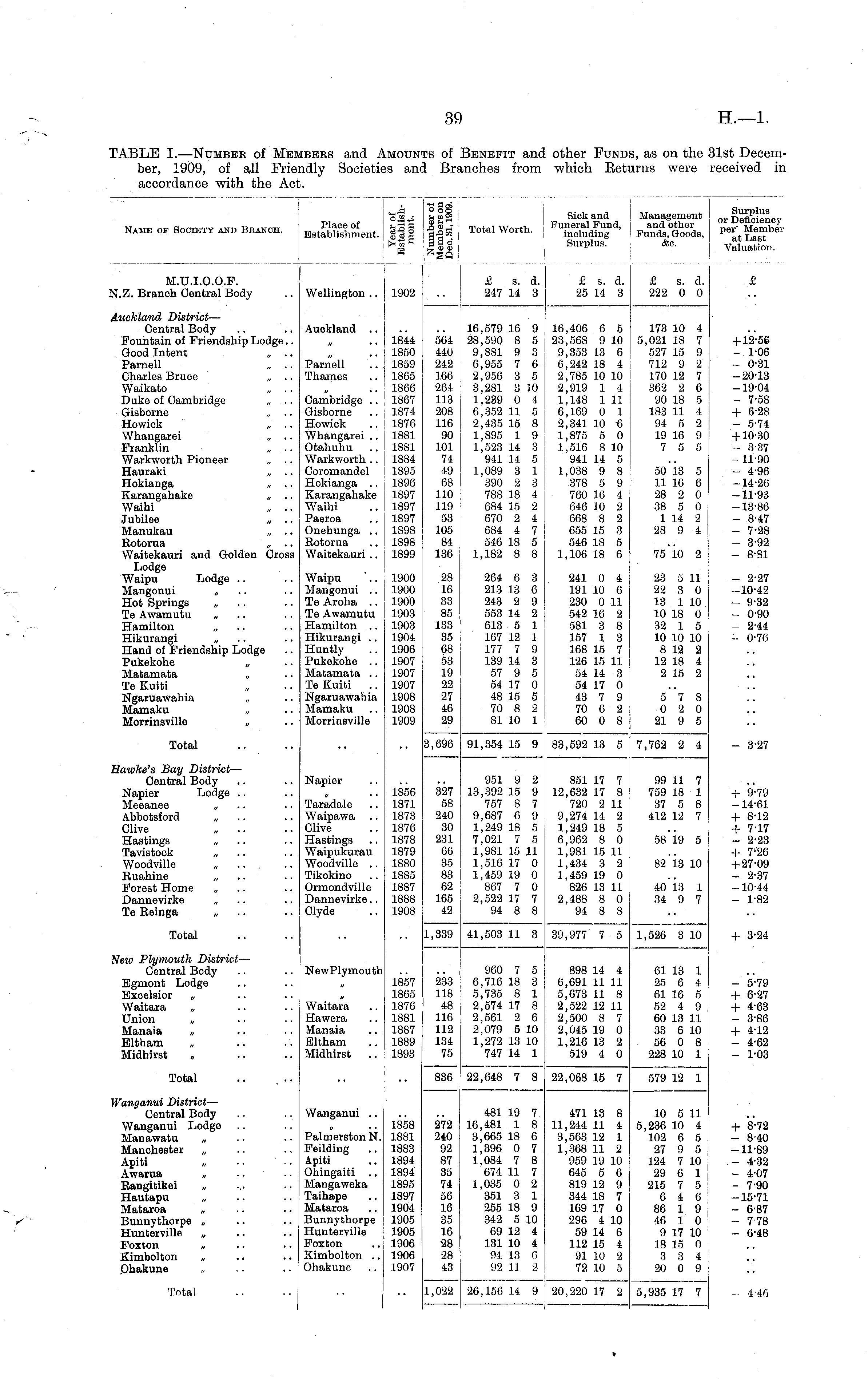 Name of Society and Branch. Jf O oo o.S+j Sj gS Place of fl n <d_j- w rtl 4i, Establishment.! gag f|S Total Woith. ; >)"qq W h P c5 | * ggll Sick and Funeral Fund, including Surplus. Management and other Funds, Goods, <fcc. Surplus or Deficiency per' Member at Last Valuation. M.U.I.O.O.P. N.Z. Branch Central Body £ s. a. Wellington .. j 1902 .. 247 14 3 £ s. a. 25 14 3 £ s. d. 222 0 0 £ Auckland District — Central Body Fountain of Friendship Lodge.. Good Intent „ .. Parnell „ .. Charles Bruce „ .. Waikato „ Duke of Cambridge Gisborne „ .. Howick „ Whangarei „ .. Franklin „ .. Warkworth Pioneer Hauraki „ Hokianga „ .. Karangahake „ .. Waihi „ .. Jubilee „ .. Manukau Rotorua „ .. Waitekauri and Golden Cross Lodge Waipu Lodge Mangonui „ Hot Springs „ Te Awamutu Hamilton „ Hikurangi Hand of Friendship Lodge Pukekohe „ Matamata „ Te Kuiti Ngaruawahia „ Mamaku Morrinsville Auckland ..; .. .. 16,579 16 9 .. J 1844 564 28,590 8 5 .. 1850 440 9,881 9 3 Parnell .. ' 1859 242 6,955 7 6 Thames .. | 1865 j 166 2,956 3 5 .. ! 1866 261 3,281 3 10 Cambridge .. J 1867 113 1,239 0 4 Gisborne .. j 1874 208 ] 6,352 11 5 Howiok .. I 1876 116 2,435 15 8 Whangarei .. i 1881 90 1,895 1 9 Otahuhu .. I 1881 101 1,523 14 3 Warkwortli .. | 1884 74 941 14 5 Coromandel I 1895 49 1,089 3 1 Hokianga .. j 1896 68 390 2 3 Karangahake j 1897 110 788 18 4 Waihi .. ! 1897 119 684 15 2 Paeroa .. I 1897 53 670 2 4 Onehunga .. 1898 i 105 684 4 7 Botorua .. 1898 84 546 18 5 Waitekauri.. 1899 136 1,182 8 8 564 440 242 166 264 113 208 116 90 101 74 49 68 110 119 53 105 84 136 16,579 16 9 28,590 8 5 9,881 9 3 6.955 7 6 2.956 3 5 3,281 3 10 1,239 0 4 0,352 11 5 2,435 15 8 1,895 1 9 1,523 14 3 941 14 5 1,089 3 1 390 2 3 788 18 4 684 15 2 670 2 4 684 4 7 546 18 5 1,182 8 8 16,406 6 5 23,568 9 10 9,353 13 6 6,242 18 4 2,785 10 10 2,919 1 4 1,148 1 11 6,169 0 1 2,341 10 6 1,875 5 0 1,516 8 10 941 14 5 1,038 9 8 378 5 9 760 16 4 646 10 2 668 8 2 655 15 3 546 18 5 1,106 18 6 173 10 4 5,021 18 7 527 15 9 712 9 2 170 12 7 362 2 6 90 18 5 183 11 4 94 5 2 19 16 9 7 5 5 50 13 5 11 16 6 28 2 0 38 5 0 1 14 2 28 9 4 + 12-56 - 1-06 - 0-31 -20-13 -19-04 - 7-58 + 6-28 - 5-74 + 10-30 - 3-37 - 11-90 - 4-96 -14-26 -11-93 -13-86 - 8-47 - 7-28 - 3-92 - 8-S1 75'io 2 Waipu '.. 1900 28 264 6 3 Mangonui .. j 1900 16 213 13 6 Te Aroha .. 1900 33 243 2 9 Te Awamutu I 1903 85 553 14 2 Hamilton .. 1903 133 613 5 1 Hikurangi .. 1904 35 167 12 1 Huntly .. 1906 68 177 7 9 Pukekohe .. 1907 ! 58 139 14 3 Matamata .. 1907 19 57 9 5 Te Kuiti .. 1907 22 54 17 0 Ngaruawahia 1908 27 48 15 5 Mamaku .. 1908 46 70 8 2 Morrinsville 1909 29 81 10 1 28 16 33 85 133 35 68 53 19 22 27 46 29 264 6 3 213 13 6 243 2 9 553 14 2 613 5 1 167 12 1 177 7 9 139 14 3 57 9 5 54 17 0 48 15 5 70 8 2 81 10 1 241 0 4 191 10 6 230 0 11 542 16 2 581 3 8 157 1 3 168 15 7 126 15 11 54 14 3 54 17 0 43 7 9 70 6 2 60 0 8 23 5 11 22 3 0 13 1 10 10 18 0 32 1 5 10 10 10 8 12 2 12 18 4 2 15 2 - 2-27 -10-42 - 9-32 - 0-90 - 2-44 - 0-76 5 7 8 0 2 0 21 9 5 Total .. 3,696 91,354 15 9 3,696 91,354 15 9 83,592 13 5 7,762 2 4 - 3-27 Hawke's Bay District — Central Body Napier Lodge Meeanee „ Abbotsf ord „ Clive Hastings „ Tavistock Woodville „ Ruahine „ Forest Home „ Dannevirke Te Reinga Napier 951 9 2 1 QKfi 3Q7 1Q QQO 1 fi Q .. 1856 327 13,392 15 9 Taradale .. 1871 58 757 8 7 Waipawa .. 1873 240 9,687 6 9 Olive .. 1876 30 1,249 18 5 Hastings .. 1878 231 7,021 7 5 Waipukurau 1879 66 1,981 15 11 Woodville .. 1880 35 1,516 17 0 Tikokino .. 1885 83 1,459 19 0 Ormondville 1887 62 867 7 0 Dannevirke.. 1888 165 2,522 17 7 Clyde .. 1908 42 94 8 8 1856 1871 1873 1876 1878 1879 1880 1885 1887 1888 1908 327 58 240 30 231 66 35 83 62 165 42 951 9 2 13,392 15 9 757 8 7 9,687 6 9 1,249 18 5 7,021 7 5 1,981 15 11 1,516 17 0 1,459 19 0 867 7 0 2,522 17 7 94 8 8 851 17 7 12,632 17 8 720 2 11 9,274 14 2 1,249 18 5 6,962 8 0 1,981 15 11 1,434 3 2 1,459 19 0 826 13 11 2,488 8 0 94 8 8 99 11 7 759 18 1 37 5 8 412 12 7 58 19 5 + 9-79 -14-61 + 8-12 + 7-17 - 2-23 + 7'26 + 27-09 - 2-37 -10-44 - 1-82 82 13 10 4013 1 34 9 7 Total .. 1,339 41,503 11 3 1,339 41,503 11 3 39,977 7 5 1,526 3 10 + 3-24 New Plymouth District — Central Body Egmont Lodge Exoelsior „ Waitara „ Union „ Manaia „ Eltham „ Midhirst „ I NewPlymouth .. .. 960 7 5 law 933 fi 71R 1R 3 1857 233 6,716 18 3 -1 Oflf 1 1 D K 17OK O 1 1865 118 5,735 8 1 Waitara .. 1876 ! 48 2,574 17 8 Hawera .. 1881 I 116 2,561 2 6 Manaia .. 1887 112 2,079 5 10 Eltham .. 1889 134 1,272 13 10 Midhirst .. 1893 75 747 14 1 1857 1865 1876 1881 1887 1889 1893 233 118 48 116 112 134 75 960 7 5 6,716 18 3 5,735 8 1 2,574 17 8 2,561 2 6 2,079 5 10 1,272 13 10 747 14 1 898 14 4 6,691 11 11 5,673 11 8 2,522 12 11 2,500 8 7 2,045 19 0 1,216 13 2 519 4 0 61 13 1 25 6 4 61 16 5 52 4 9 60 13 11 33 6 10 56 0 8 228 10 1 - 5-79 + 6-27 + 4-63 - 3-86 + 4-12 - 4-62 - 1-03 Total 836 22,648 7 8 836 22,648 7 8 22,068 15 7 579 12 1 Wanganui District — Central Body Wanganui Lodge Manawatu „ Manchester „ Apiti „ Awarua „ Eangitikei Hautapu Mataroa Bunnythorpe „ Hunterville „ Foxton „ Kimbolton Phakune Wanganui 481 19 7 1QKQ i 070 Iβ /1Q1 1 Q .. 1858 272 16,481 1 8 PalmerstonN. 1881 240 3,665 18 6 Feilding .. 1883 92 1,396 0 7 Apiti .. 1894 87 1,084 7 8 Obingaiti .. 1894 35 674 11 7 Manga weka 1895 74 1,035 0 2 Taihape .. 1897 56 351 3 1 Mataroa .. 1904 16 255 18 9 Bunnythorpe 1905 35 342 5 10 Hunterville 1905 16 69 12 4 Foxton .. 1906 28 131 10 4 Kimbolton .. 1906 28 94 13 6 Ohakune .. 1907 43 92 11 2 1858 1881 1883 1894 1894 1895 1897 1904 1905 1905 1906 1906 1907 272 240 92 87 35 74 56 16 35 16 28 28 43 481 19 7 16,481 1 8 3,665 18 6 1,396 0 7 1,084 7 8 674 11 7 1,035 0 2 351 3 1 255 18 9 342 5 10 69 12 4 131 10 4 94 13 6 92 11 2 471 13 8 11,244 11 4 3,563 12 1 1,368 11 2 959 19 10 645 5 6 819 12 9 344 18 7 169 17 0 296 4 10 59 14 6 112 15 4 91 10 2 72 10 5 10 5 11 5,236 10 4 102 6 5 27 9 5 124 7 10 29 6 1 215 7 5 6 4 6 86 1 9 4