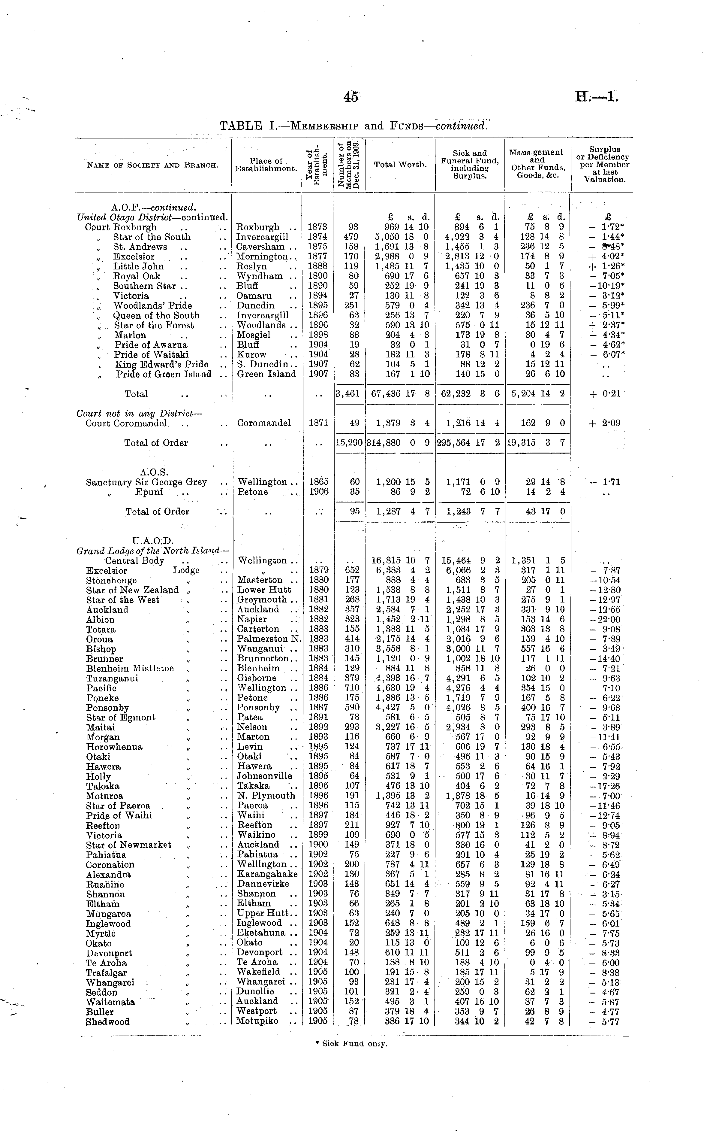 Name of Society and Bbanch. , <w aos H O O O n»3 Sick and Place of u ~a Total Worth Funeral Fund, Establishment. %%% "§•§£ Total Worth. including t*» a agg Surplus. H 55Sq Mana gement Surplus or Deficiency Other Funds, P er Member Goods, &c. ,. f 'I?* Valuation. A.O.F.— continued. United Otago District —continued. Court Roxburgh Star of the South St. Andrews Excelsior .. „ Little John Royal Oak Southern Star Victoria Woodlands' Pride Queen of the South Star of the Forest Marion Pride of Awarua Pride of Waitaki King Edward's Pride „ Pride of Green Island .. Roxburgh .. Invercargill Caversham .. Mornington.. Roslyn Wyndham .. j Bluff Oamaru Dunedin Invercargill Woodlands .. Mosgiel Bluff Kurow S. Dunedin.. Green Island 1873 1874 1875 1877 1888 1890 1890 1894 1895 1896 1896 1898 1904 1904 1907 1907 93 479 158 170 119 80 59 27 251 63 32 88 19 28 62 83 £ s. d. 969 14 10 5,050 18 0 1,691 13 8 2,988 0 9 1,485 11 7 690 17 6 252 19 9 130 11 8 579 0 4 256 13 7 590 13. 10 204 4 3 32 0 1 182 11 3 104 5 1 167 1 10 £ s. d. 894 6 1 4,922 3 4 1,455 1 3 2,813 12 0 1,435 10 0 657 10 3 241 19 3 122 3 6 342 13 4 220 7 9 575 0 11 173 19 8 31 0 7 178 8 11 88 12 2 140 15 0 £ s. d. 75 8 9 128 14 8 236 12 5 174 8 9 50 1 7 33 7 3 11 0 6 8 8 2 236 7 0 36 5 10 15 12 11 30 4 7 0 19 6 4 2 4 15 12 11 26 6 10 £ - 1-72* - 1-44* - 8-48* + 4-02* + 1-26* - 7-05* -10-19* - 3-12* - 5-99* - 5-11* +2-37* - 4-34* - 4-62* - 6-07* Total 3,461 67,436 17 8 62,232 3 6 5,204 14 2 + 0-21 ~iourt not in any District — Court Coromandel Coromandel 1871 + 2-09 49 1,379 3 4 1,216 14 4 162 9 0 Total of Order 15,290 314,880 0 9 295,564 17 2 19,315 3 7 A.O.S. Sanctuary Sir George Grey „ Epuni Wellington .. Petone . .. 1865 1906 60 35 1,200 15 5 86 9 2 - 1-71 1,171 0 9 72 6 10 29 14 8 14 2 4 Total of Order 95 1,287 4 7 1,243 7 7 43 17 0 U.A.O.D. Irand Lodge of the North Island — Central Body .. Excelsior Lodge Stonehenge Star of New Zealand „ Star of the West Auckland „ Albion Totara „ Oroua Bishop „ Brunner Blenheim Mistletoe Turanganui „ Pacific Poneke Ponsonby „ Star of Egmont Maitai Morgan „ Horowhenua .. „ Otaki Hawera Holly Takaka „ '.. Moturoa Star of Paeroa Pride of Waihi Reefton Victoria Star of Newmarket Pahiatua Coronation Alexandra Ruahine Shannon Eltham Mungaroa .'.'.» Inglewood Myrtle „ Qkato Devonport Te Aroha „ Trafalgar Whangarei Seddon Waitemata ,, . ■ ■ Buller Shed wood Wellington .. Masterton .. Lower Hutt Greymouth .. Auckland .. Napier Carterton Palmerston N. Wanganui .. Brunnerton.. Blenheim .. Gisborne Wellington .. Petone Ponsonby .. Patea Nelson Marton Levin Otaki Hawera Johnsonville Takaka N. Plymouth Paeroa Waihi Reefton Waikino Auckland .. Pahiatua Wellington .. Karangahake Dannevirke Shannon Eltham Upper Hutt.. Inglewood .. Eketahuna .. Okato Devonport .. Te Aroha Wakefield .. Whangarei .. Dunollie Auckland Westport Motupiko .. 1879 1880 1880 1881 1882 1882 1883 1883 1883 1883 1884 1884 1886 1886 1887 1891 1892 1893 1895 1895 1895 1895 1895 1896 1896 1897 1897 1899 1900 1902 1902 1902 1903 1903 1903 | 1903 1903 1904 1904 1904 1904 1905 1905 1905 1905 1905 1905 652 177 123 268 357 323 155 414 310 145 129 379 710 175 590 78 293 116 124 84 84 64 107 191 115 184 211 109 149 75 200 130 143 76 66 63 152 72 20 148 70 100 93 101 152 87 78 16,815 10 7 6,383 4 2 888 4 4 1,538 8 8 1,713 19 4 2,584 7 1 1,452 2 11 1,388 11 5 2,175 14 4 3,558 8 1 1,120 0 9 884 11 8 4,393 16 7 4,630 19 4 1,886 13 5 4,427 5 0 581 6 5 3,227 16 5 660 6 9 737 17 11 587 7 0 617 18 7 531 9 1 476 13 10 1,395 13 2 742 13 11 446 18 2 927 7 10 690 0 5 371 18 0 227 9 6 787 4 11 367 5 1 651 14 4 349 7 7 265 1 8 240 7 0 648 8 8 259 13 11 115 13 0 610 11 11 188 8 10 191 15 8 231 17 4 321 2 4 495 3 1 379 18 4 386 17 10 15,464 9 2 6,066 2 3 683 3 5 1,511 8 7 1,438 10 3 2,252 17 3 1,298 8 5 1,084 17 9 2,016 9 6 3,000 11 7 1,002 18 10 858 11 8 4,291 6 5 4,276 4 4 1,719 7 9 4,026 8 5 505 8 7 2,934 8 0 567 17 0 606 19 7 496 11 3 553 2 6 500 17 6 404 6 2 1,378 18 5 702 15 1 350 8 9 800 19 1 577 15 3 330 16 0 201 10 4 657 6 3 285 8 2 559 9 5 317 9 11 201 2 10 205 10 0 489 2 1 232 17 11 109 12 6 511 2 6 188 4 10 185 17 11 200 15 2 259 0 3 407 15 10 353 9 7 344 10 2 1,351 1 5 317 1 11 205 0 11 27 0 1 275 9 1 331 9 10 153 14 6 303 13 8 159 4 10 557 16 6 117 1 11 26 0 0 102 10 2 354 15 0 167 5 8 400 16 7 75 17 10 293 8 5 92 9 9 130 18 4 90 15 9 64 16 1 30 11 7 72 7 8 16 14 9 39 18 10 96 9 5 126 8 9 112 5 2 41 2 0 25 19 2 129 18 8 81 16 11 92 4 11 31 17 8 63 18 10 34 17 0 159 6 7 26 16 0 6 0 6 99 9 5 0 4 0 5 17 9 31 2 2 62 2 1 87 7 3 26 8 9 42 7 8 - 7-87 -10-54 -12-80 -12-97 -12-55 -22-00 - 9-08 - 7-89 - 3-49 -14-40 - 7-21' - 9-63 - 7-10 - 6-22 - 9-63 - 5-11 - 3-89 -11-41 - 6-55 - 5-43 - 7-92 - 2-29 -17-26 - 7-00 -11-46 -12-74 - 9-05 - 8-94 - 8-72 - 5-62 - 6-49 - 6-24 - 6-27 - 3-15 - 5-34 - 5-65 - 6-01 - 7-75 - 5-73 - 8-33 - 6-00 - 8-38 - 5-13 - 4-67 - 5-87 - 4-77 - 5-77 * Si. ;k Fund only.