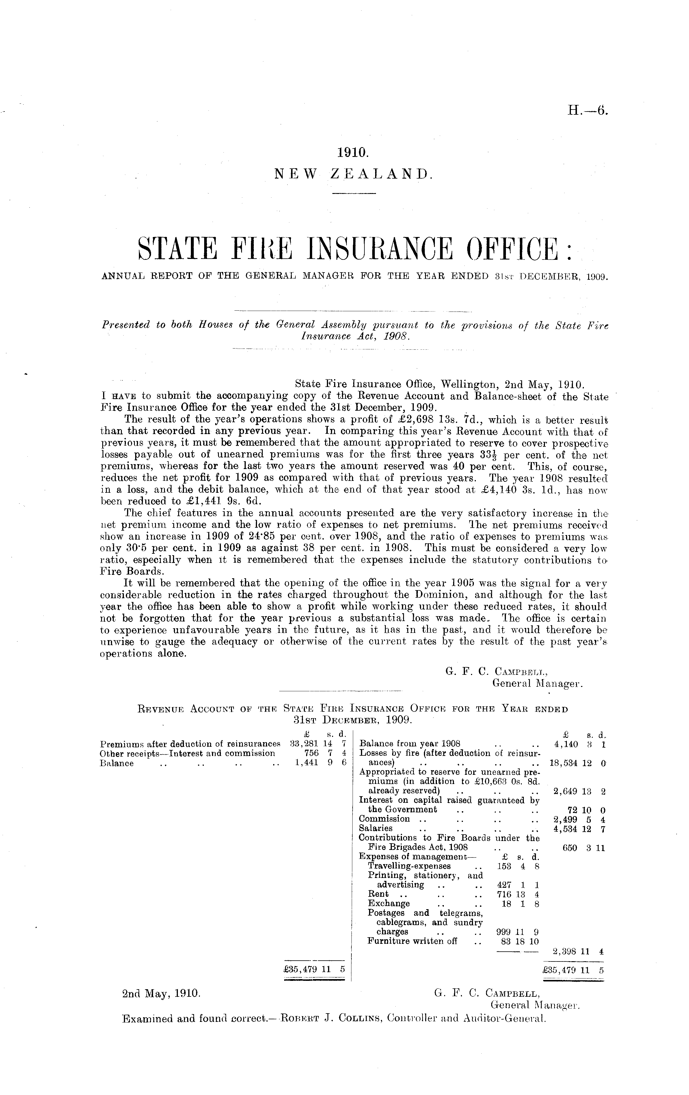 State Fire Insurance Office, Wellington, 2nd May, 1910. I have to submit the accompanying copy of the Revenue Account and Balance-sheet of the State Fire Insurance Office for the year ended the 31st December, 1909. The result of the year's operations shows a profit of £2,698 13s. 7d., which is a better result than that recorded in any previous year. In comparing this year's Revenue Account with that of previous years, it must be remembered that the amount appropriated to reserve to cover prospective losses payable out of unearned premiums was for the first three years 33J per cent, of the net premiums, whereas for the last two years the amount reserved was 40 per cent. This, of course, reduces the net profit for 1909 as compared with that of previous years. The year 1908 resulted in a loss, and the debit balance, which a.t the end of that year stood at £4,140 3s. Id., has now been reduced to £1,441 9s. 6d. The chief features in the annual accounts presented are the very satisfactory increase in the net premium income and the low ratio of expenses to net premiums, llie net premiums received show an increase in 1909 of 2485 per cent, over 1908, and the ratio of expenses to premiums was only 30"5 per cent, in 1909 as against 38 per cent, in 1908. This must be considered a very low ratio, especially when it is remembered that the expenses include the statutory contributions to Fire Boards. It will be remembered that the opening of the office in the year 1905 was the signal for a very considerable reduction in the rates charged throughout the Dominion, and although for the last year the office has been able to show a profit while working under these reduced rates, it should not be forgotten that for the year previous a substantial loss was made. The office is certain to experience unfavourable years in the future, as it has in the past, and it would therefore be unwise to gauge the adequacy or otherwise of the current rates by the result of the past year's operations alone. G. F. C. Campbell, General Manager.