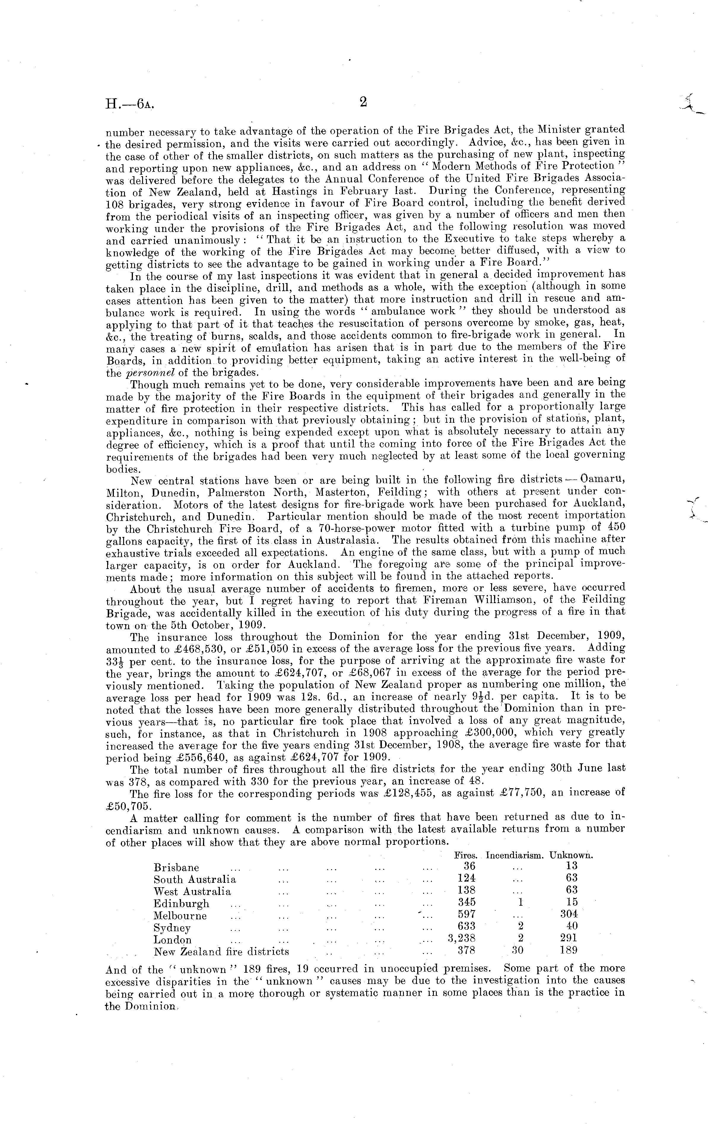 number necessary to take advantage of the operation of the Fire Brigades Act, the Minister granted the desired permission, and the visits were carried out accordingly. Advice, &c, has been given in the case of other of the smaller districts, on such matters as the purchasing of new plant, inspecting and reporting upon new appliances, &c, and an address on " Modern Methods of Fire Protection " was delivered before the delegates to the Annual Conference of the United Fire Brigades Association of New Zealand, held at Hastings in February last. During the Conference, representing 108 brigades, very strong evidence in favour of Fire Board control, including the benefit derived from the periodical visits of an inspecting officer, was given by a number of officers and men then working under the provisions of the Fire Brigades Act, and the following resolution was moved and carried unanimously: " That it be an instruction to the Executive to take steps whereby a knowledge of the working of the Fire Brigades Act may become better diffused, with a view to getting districts to see the advantage to be gained in working under a Fire Board." In the course of my last inspections it was evident that in general a decided improvement has taken place in the discipline, drill, and methods as a whole, with the exception (although in some cases attention has been given to the matter) that more instruction and drill in rescue and ambulance work is required. In using the words " ambulance work " they should be understood as applying to that part of it that teaches the resuscitation of persons overcome by smoke, gas, heat, &o.j the treating of burns, scalds, and those accidents common to fire-brigade work in general. In many cases a new spirit of emulation has arisen that is in part due to the members of the Fire Boards, in addition to providing better equipment, taking an active interest in the well-being of the personnel of the brigades. Though much remains yet to be done, very considerable improvements have been and are being made by the majority of the Fire Boards in the equipment of their brigades and generally in the matter of fire protection in their respective districts. This has called for a proportionally large expenditure in comparison with that previously obtaining; but in the provision of stations, plant, appliances, &c, nothing is being expended except upon what is absolutely necessary to attain any degree of efficiency, which is a proof that until the coming into force of the Fire Brigades Act the requirements of the brigades had been very much neglected by at least some of the local governing bodies. New central stations have been or are being built in the following fire districts ■ — Oamaru, Milton, Dunedin, Palmerston North, Masterton, Feilding; with others at present under consideration. Motors of the latest designs for fire-brigade work have been purchased for Auckland, Christchurch, and Dunedin. Particular mention should be made of the most recent importation by the Christchurch Fire Board, of a 70-horse-power motor fitted with a turbine pump of 450 gallons capacity, the first of its class in Australasia. The results obtained from this machine after exhaustive trials exceeded all expectations. An engine of the same class, but with a pump of much larger capacity, is on order for Auckland. The foregoing are some of the principal improvements made; more information on this subject will be found in the attached reports. About the usual average number of accidents to firemen, more or less severe, have occurred throughout the year, but I regret having to report that Fireman Williamson, of the Feilding Brigade, was accidentally killed in the execution of his duty during the progress of a fire in that town on the sth October, 1909. The insurance loss throughout the Dominion for the year ending 31st December, 1909, amounted to £468,530, or £51,050 in excess of the average loss for the previous five years. Adding 33 \ per cent, to the insurance loss, for the purpose of arriving at the approximate fire waste for the year, brings the amount to £624,707, or £68,067 in excess of the averagefor the period previously mentioned. Taking the population of New Zealand proper as numbering one million, the average loss per head for 1909 was 12s. 6d., an increase of nearly 9Jd. per capita. It is to be noted that the losses have been more generally distributed throughout the Dominion than in previous years —that is, no particular fire took place that involved a loss of any great magnitude, such, for instance, as that in Christchurch in 1908 approaching £300,000, which very greatly increased the average for the five years ending 31st December, 1908, the average fire waste for that period being £556,640, as against £624,707 for 1909. The total number of fires throughout all the fire districts for the year ending 30th June last was 378, as compared with 330 for the previous year, an increase of 48. The fire loss for the corresponding periods was £128,455, as against £77,75€, an increase of £50,705. A matter calling for comment is the number of fires that have been returned as due to incendiarism and unknown causes. A comparison with the latest available returns from a number of other places will show that they are above normal proportions. Fires. Incendiarism. Unknown. Brisbane ... ... ... .... ■•• 36 ... 13 South Australia ... ... .... ... 124 ... 63 West Australia ... ... ... ... 138 ... 63 Edinburgh ... ... ... ... ... 345 1 15 Melbourne ... ... ... ... "... 597 ... 304 Sydney 633 2 40 London .... . . ... .... 3,238 2 291 . .. New Zealand fire districts ... ... ... 378 30 189 And of the " unknown " 189 fires, 19 occurred in unoccupied premises. Some part of the more excessive disparities in the "unknown" causes may be due to the investigation into the causes being carried out in a more thorough or systematic manner in some places than is the practice in the Dominion,