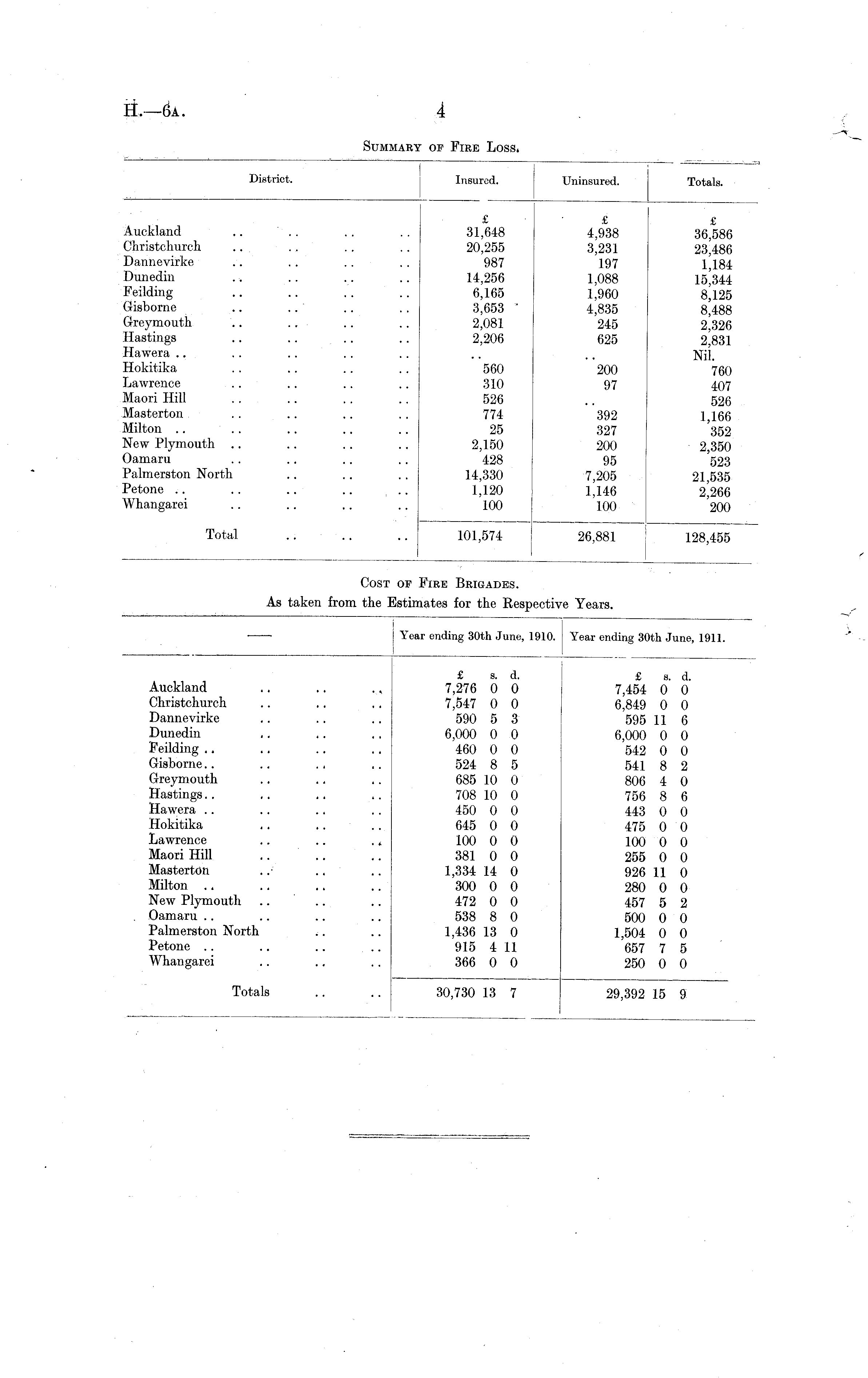District. Insured. Uninsured. Totals. Auckland Christchurch Dannevirke Dunedin Feilding Gisborne Greymouth Hastings Hawera Hokitika £ 31,648 20,255 987 14,256 6,165 3,653 ■ 2,081 2,206 f 4,938 3,231 197 1,088 1,960 4,835 245 625 £ 36,586 23,486 1,184 15,344 8,125 8,488 2,326 2,831 Nil. 760 407 526 1,166 352 2,350 523 21,535 2,266 200 560 310 526 774 25 2,150 428 14,330 1,120 100 200 97 Lawrence Maori Hill Masterton Milton New Plymouth Oamaru Palmerston North 392 327 200 95 7,205 1,146 100 Petone Whangarei Total 101,574 26,881 128,455