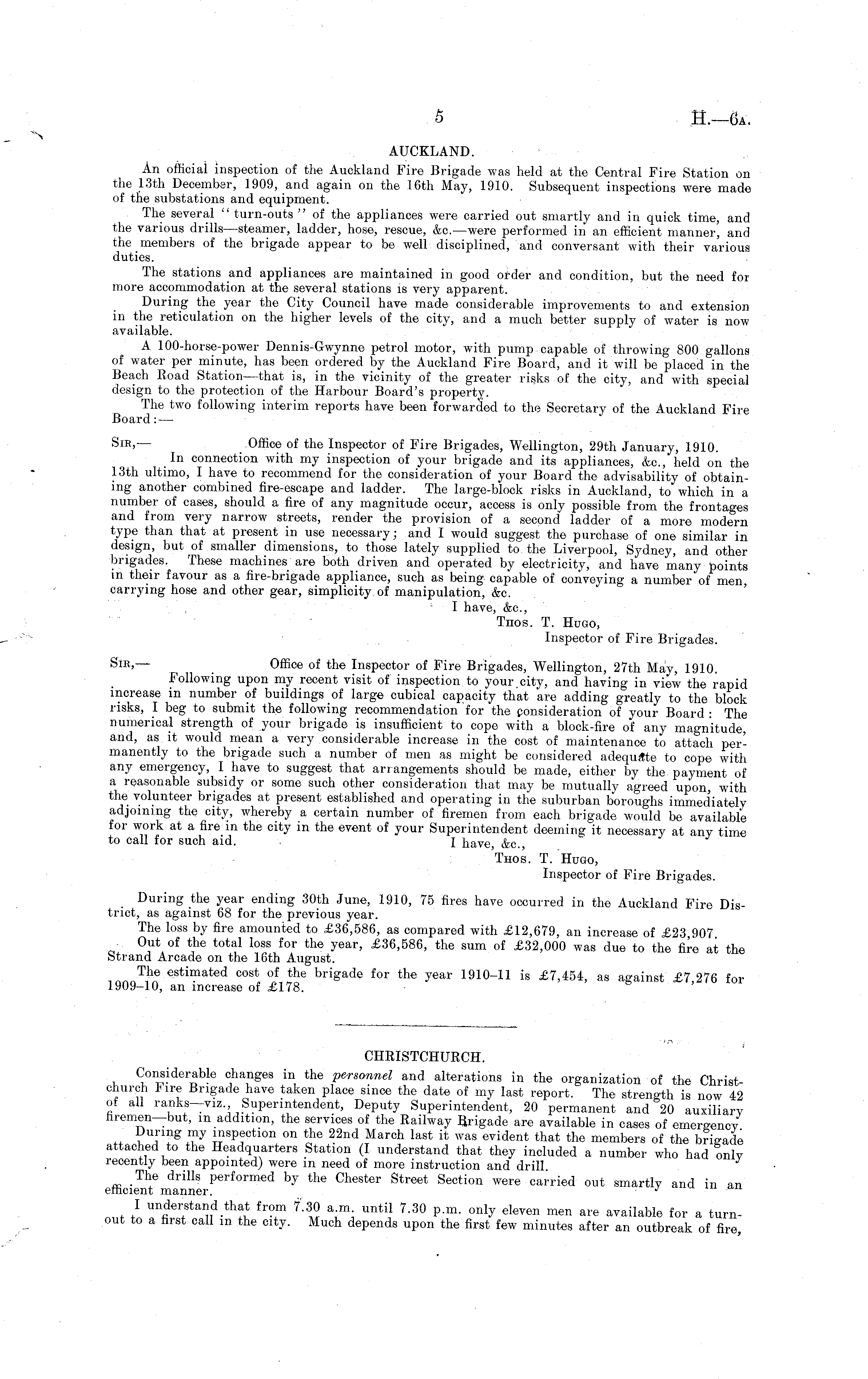 AUCKLAND. An official inspection of the Auckland Fire Brigade was held at the Central Fire Station on the 13th December, 1909, and again on the 16th May, 19.10. Subsequent inspections were made of the substations and equipment. The several " turn-outs " of the appliances were carried out smartly and in quick time, and the various drills—steamer, ladder, hose, rescue, &c— were performed in an efficient manner, and the members of the brigade appear to be well disciplined, and conversant with their various duties. The stations and appliances are maintained in good order and condition, but the need for more accommodation at the several stations is very apparent. During the year the City Council have made considerable improvements to and extension in the reticulation on the higher levels of the city, and a much better supply of water is now available. A 100-horse-power Dennis-Gwynne petrol motor, with pump capable of throwing 800 gallons of water per minute, has been ordered by the Auckland Fire Board, and it will be placed in the Beach Road Station—that is, in the vicinity of the greater risks of the city, and with special design to the protection of the Harbour Board's property. The two following interim reports have been forwarded to the Secretary of the Auckland Fire Board : — SlH > — Office of the Inspector of Fire Brigades, Wellington, 29th January, 1910. In connection with my inspection of your brigade and its appliances, &c, held on the 13th ultimo, I have to recommend for the consideration of your Board the advisability of obtaining another combined fire-escape and ladder. The large-block risks in Auckland, to which in a number of cases, should a fire of any magnitude occur, access is only possible from the frontages and from very narrow streets, render the provision of a second ladder of a more modern type than that at present in use necessary; and I would suggest the purchase of one similar in design, but of smaller dimensions, to those lately supplied to. the Liverpool, Sydney, and other brigades. These machines are both driven and operated by electricity, and have many points in their favour as a fire-brigade appliance, such as being capable of conveying a number of men carrying hose and other gear, simplicity of manipulation, &c. I have, &c, Tuos. T. Hugo, Inspector of Fire Brigades. Siß,— Office of the Inspector of Fire Brigades, Wellington, 27th May, 1910. Following upon my recent visit of inspection to your city, and having in view the rapid increase in number of buildings of large cubical capacity that are adding greatly to the block risks, I beg to submit the following recommendation for the consideration of your Board • The numerical strength of your brigade is insufficient to cope with a block-fire of any magnitude and, as it would mean a very considerable increase in the cost of maintenance to attach permanently to the brigade such a number of men as might be considered adequate to cope with any emergency, I have to suggest that arrangements should be made, either by the payment of a reasonable subsidy or some such other consideration that may be mutually agreed upon, with the volunteer brigades at present established and operating in the suburban boroughs immed'iately adjoining the city, whereby a certain number of firemen from each brigade would be available for work at a fire in the city in the event of your Superintendent deeming it necessary at any time to call for such aid. I have, &c, Thos. T. Hugo, Inspector of Fire Brigades. During the year ending 30th June, 1910, 75 fires have occurred in the Auckland Fire District, as against 68 for the previous year. The loss by fire amounted to £36,586, as compared with £12,679, an increase of £23 907 - Out of the total loss for the year, £36,586, the sum of £32,000 was due to the fire at the Strand Arcade on the 16th August. The estimated cost of the brigade for the year 1910-11 is £7,454, as against £7 276 for 1909-10, an increase of £178. '