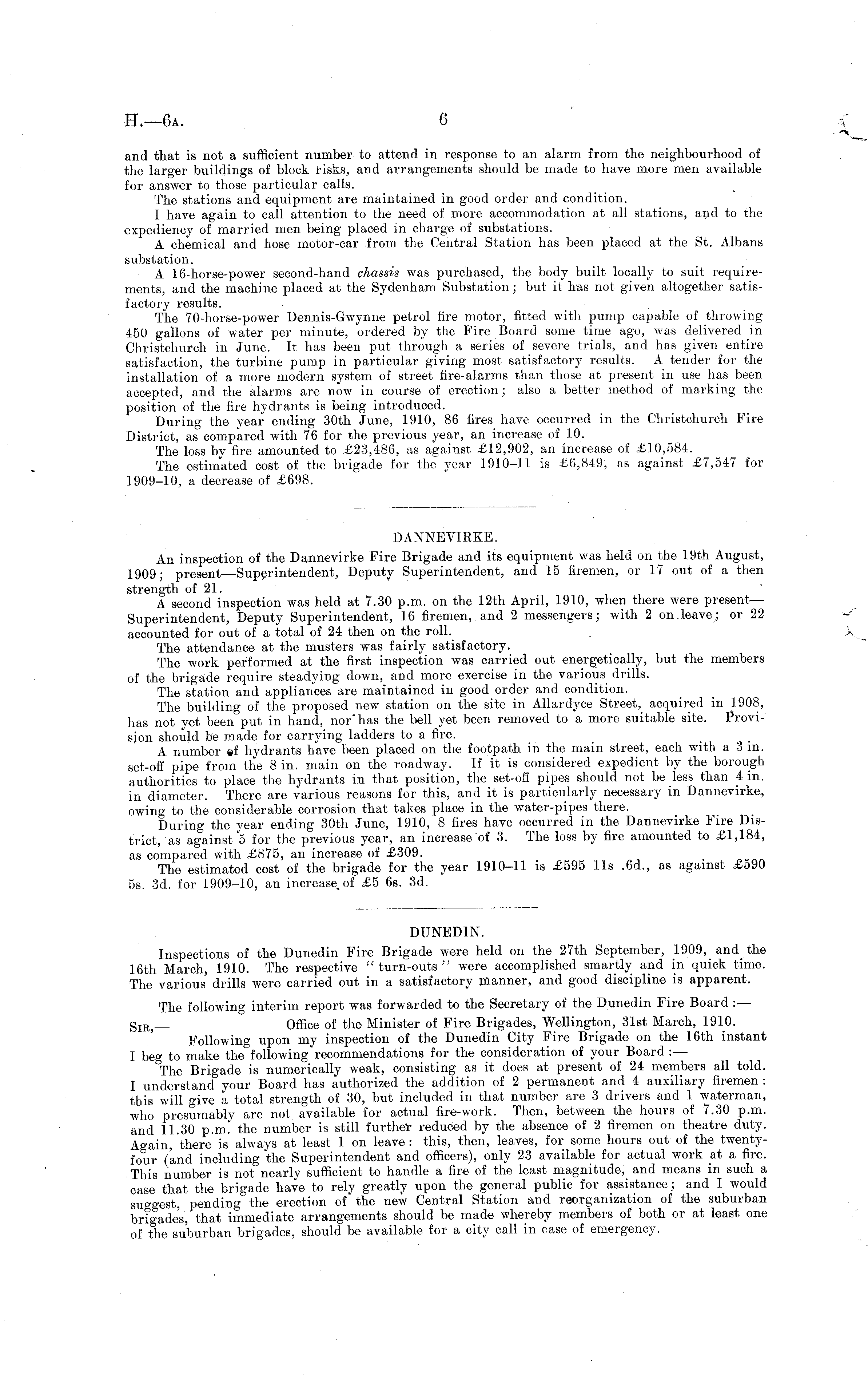 and that is not a sufficient number to attend in response to an alarm from the neighbourhood of the larger buildings of block risks, and arrangements should be made to have more men available for answer to those particular calls. The stations and equipment are maintained in good order and condition. I have again to call attention to the need of more accommodation at all stations, and to the expediency of married men being placed in charge of substations. A chemical and hose motor-car from the Central Station has been placed at the St. Albans substation. A 16-horse-power second-hand chassis was purchased, the body built locally to suit requirements, and the machine placed at the Sydenham Substation; but it has not given altogether satisfactory results. The 70-horse-power Dennis-Gwynne petrol fire motor, fitted with pump capable of throwing 450 gallons of water per minute, ordered by the Fire Board some time ago, was delivered in Christchurch in June. It has been put through a series of severe trials, and has given entire satisfaction, the turbine pump in particular giving most satisfactory results. A tender for the installation of a more modern system of street fire-alarms than those at present in use has been accepted, and the alarms are now in course of erection; also a better method of marking the position of the fire hydrants is being introduced. During the year ending 30th June, 1910, 86 fires have occurred in the Christchurch Fire District, as compared with 76 for the previous year, an increase of 10. The loss by fire amounted to £23,486, as against £12,902, an increase of £10,584. The estimated cost of the brigade for the year 1910-11 is £6,849, as against £7,547 for 1909-10, a decrease of £698.