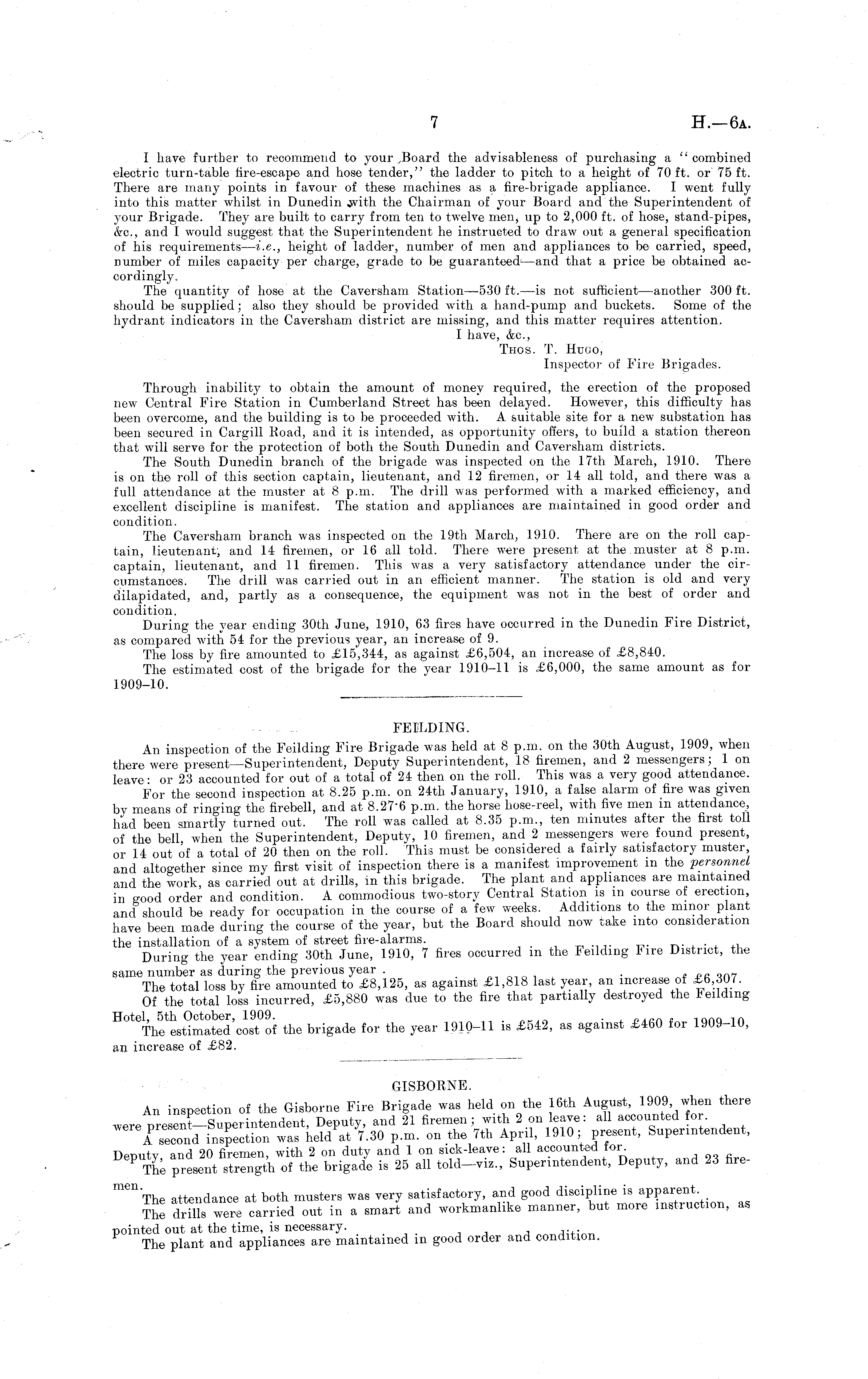 I have further to recommend to your .Board the advisableness of purchasing a " combined electric turn-table fire-escape and hose tender," the ladder to pitch to a height of 70 ft. or 75 ft. There are many points in favour of these machines as a fire-brigade appliance. I went fully into this matter whilst in Dunedin .with the Chairman of your Board and the Superintendent of your Brigade. They are built to carry from ten to twelve men, up to 2,000 ft. of hose, stand-pipes, etc., and I would suggest that the Superintendent he instructed to draw out a general specification of his requirements — i.e., height of ladder, number of men and appliances to be carried, speed, number of miles capacity per charge, grade to be guaranteed- —and that a price be obtained accordingly. The quantity of hose at the Caversham Station—s3o ft.—is not sufficient —another 300 ft. should be supplied; also they should be provided with a hand-pump and buckets. Some of the hydrant indicators in the Caversham district are missing, and this matter requires attention. I have, &c, Thos. T. Hugo, Inspector of Fire Brigades. Through inability to obtain the amount of money required, the erection of the proposed new Central Fire Station in Cumberland Street has been delayed. However, this difficulty has been overcome, and the building is to be proceeded with. A suitable site for a new substation has been secured in Cargill Road, and it is intended, as opportunity offers, to build a station thereon that will serve for the protection of both the South Dunedin and Caversham districts. The South Dunedin branch of the brigade was inspected on the 17th March, 1910. There is on the roll of this section captain, lieutenant, and 12 firemen, or 14 all told, and there was a full attendance at the muster at 8 p.m. The drill was performed with a marked efficiency, and excellent discipline is manifest. The station and appliances are maintained in good order and condition. The Caversham branch was inspected on the 19th March, 1910. There are on the roll captain, lieutenant, and 14 firemen, or 16 all told. There were present at the muster at 8 p.m. captain, lieutenant, and 11 firemen. This was a very satisfactory attendance under the circumstances. The drill was carried out in an efficient manner. The station is old and very dilapidated, and, partly as a consequence, the equipment was not in the best of order and condition. During the year ending 30th June, 1910, 63 fires have occurred in the Dunedin Fire District, as compared with 54 for the previous year, an increase of 9. The loss by fire amounted to £15,344, as against £6,504, an increase of £8,840. The estimated cost of the brigade for the year 1910-11 is £6,000, the same amount as for 1909-10.