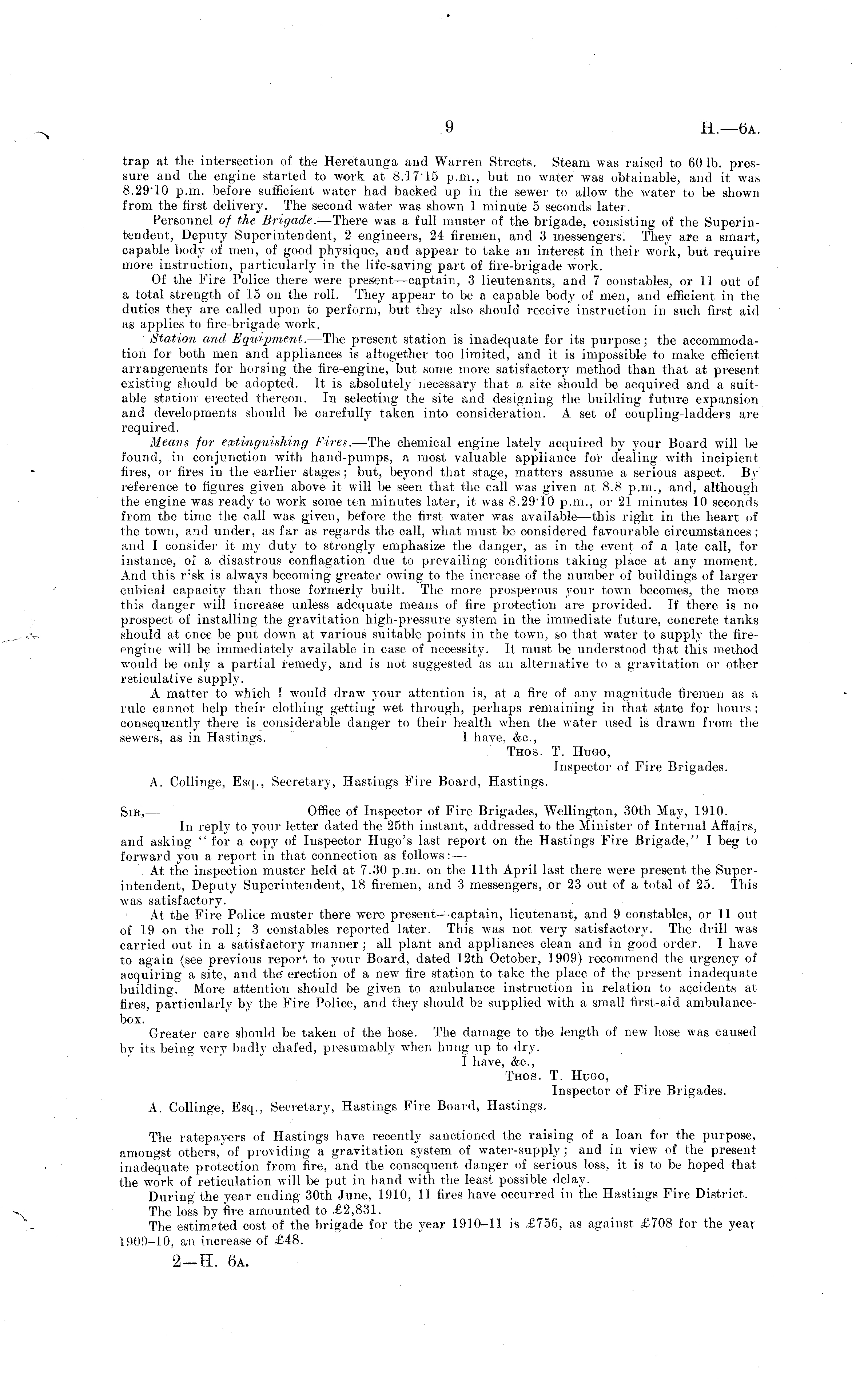 trap at the intersection of the Heretaunga and Warren Streets. Steam was raised to 60 lb. pressure and the engine started to work at 8,17:15 p.m., but no water was obtainable, and it was 8.29'10 p.m. before sufficient water had backed up in the sewer to allow the water to be shown from the first delivery. The second water was shown 1 minute 5 seconds later. Personnel of the Brigade:- —There was a full muster of the brigade, consisting of the Superintendent, Deputy Superintendent, 2 engineers, 24 firemen, and 3 messengers. They are a smart, capable body of men, of good physique, and appear to take an interest in their work, but require more instruction, particularly in the life-saving part of fire-brigade work. Of the Fire Police there were present—captain, 3 lieutenants, and 7 constables, or 11 out of a total strength of 15 on the roll. They appear to be a capable body of men, and efficient in the duties they are called upon to perform, but they also should receive instruction in such first aid as applies to fire-brigade work. Station and Equipment. —The present station is inadequate for its purpose; the accommodation for both men and appliances is altogether too limited, and it is impossible to make efficient arrangements for horsing the fire-engine, but some more satisfactory method than that at present existing should be adopted. It is absolutely necessary that a site should be acquired and a suitable station erected thereon. In selecting the site and designing the building future expansion and developments should be carefully taken into consideration. A set of coupling-ladders are required. Means for extinguishing Fires. —The chemical engine lately acquired by your Board will be found, in conjunction with hand-pumps, a most valuable appliance for dealing with incipient fires, or fires in the earlier stages; but, that stage, matters assume a serious aspect. By reference to figures given above it will be seen that the call was given at 8.8 p.m., and, although the engine was ready to work some ten minutes later, it was 8.29'10 p.m., or 21 minutes 10 seconds from the time the call was given, before the first water was available—this right in the heart of the town, and under, as far as regards the call, what must be considered favourable circumstances; and I consider it my duty to strongly emphasize the danger, as in the event of a late call, for instance, of a disastrous conflagation due to prevailing conditions taking place at any moment. And this r : sk is always becoming greater owing to the increase of the number of buildings of larger cubical capacity than those formerly built. The more prosperous your town becomes, the more tliis danger will increase unless adequate means of fire protection are provided. If there is no prospect of installing the gravitation high-pressure system in the immediate future, concrete tanks should at once be put down at various suitable points in the town, so that water to supply the fireengine will be immediately available in case of necessity. It must be understood that this method would be only a partial remedy, and is not suggested as an alternative to a gravitation or other reticulative supply. A matter to which I would draw your attention is, at a fire of sluj magnitude firemen as a rule cannot help their clothing getting wet through, perhaps remaining in that state for hours ; consequently there is considerable danger to their health when the water used is drawn from the sewers, as in Hastings. I have, <fec, Titos. T. Hugo, Inspector of Fire Brigades. A. Collinge, Esq., Secretary, Hastings Fire Board, Hastings. Sih, — Office of Inspector of Fire Brigades, Wellington, 30th May, 1910. In reply to your letter dated the 25th instant, addressed to the Minister of Internal Affairs, and asking " for a copy of Inspector Hugo's last report on the Hastings Fire Brigade," I beg to forward you a report in that connection as follows: — At the inspection muster held at 7.30 p.m. on the 11th April last there were present the Superintendent, Deputy Superintendent, 18 firemen, and 3 messengers, or 23 out of a total of 25. This was satisfactory. At the Fire Police muster there were present —captain, lieutenant, and 9 constables, or 11 out of 19 on the roll; 3 constables reported later. This was not very satisfactory. The drill was carried out in a satisfactory manner ; all plant and appliances clean and in good order. I have to again (see previous report to your Board, dated 12th October, 1909) recommend the urgency of acquiring a site, and the" erection of a new fire station to take the place of the present inadequate building. More attention should be given to ambulance instruction in relation to accidents at fires, particularly by the Fire Police, and they should be supplied with a small first-aid ambulancebox. Greater care should be taken of the hose. The damage to the length of new hose was caused by its being very badly chafed, presumably when hung up to dry. I have, &c, Teos. T. Hugo, Inspector of Fire Brigades. A. Collinge, Esq., Secretary, Hastings Fire Board, Hastings. The ratepayers of Hastings have recently sanctioned the raising of a loan for the purpose, amongst others," of providing a gravitation system of water-supply; and in view of the present inadequate protection from fire, and the consequent clanger of serious loss, it is to be hoped that the work of reticulation will be put in hand with the least possible delay. During the year ending 30th June, 1910, II fires have occurred in the Hastings Fire District. The loss by fire amounted to £2,831. The estimated cost of the brigade for the year 1910-11 is £756, as against £708 for the year 1909-10, an increase of £48.