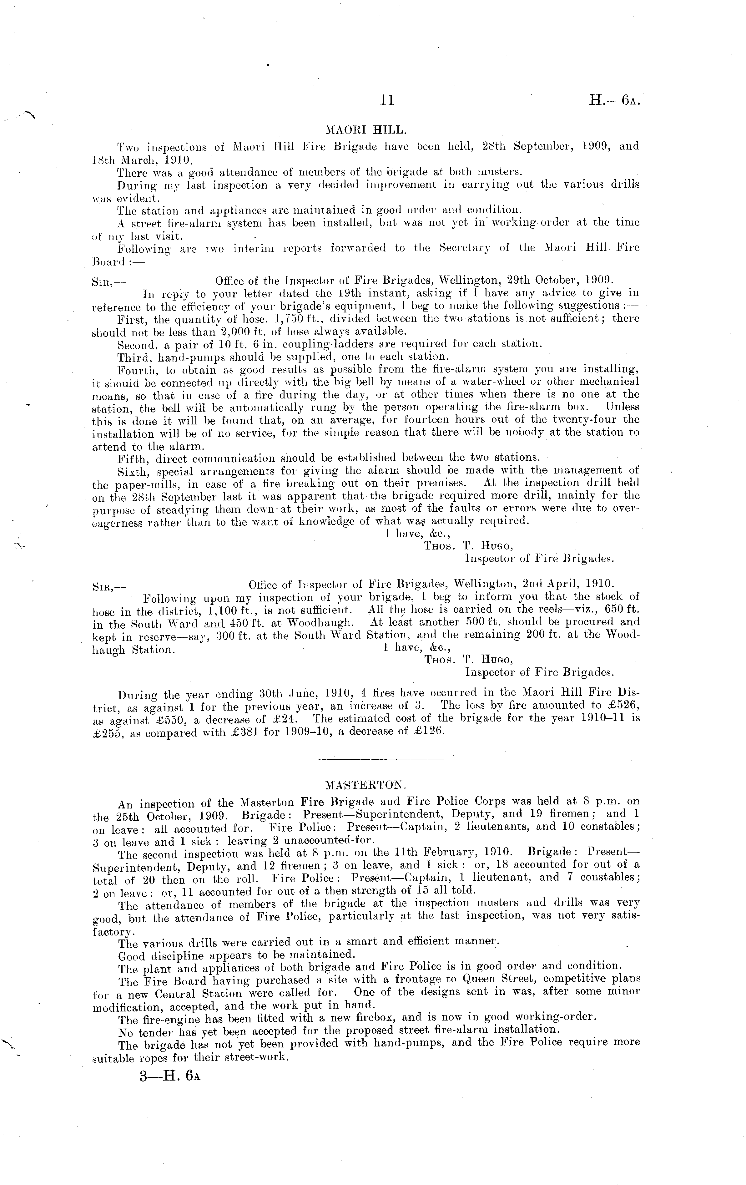MASTERTON. An inspection of the Masterton Fire Brigade and Fire Police Corps was held at 8 p.m. on the 25th October, 1909. Brigade: Present—Superintendent, Deputy, and 19 firemen; and 1 on leave: all accounted for. Fire Police: Present —Captain, 2 lieutenants, and 10 constables; 3 on leave and 1 sick : leaving 2 unaccounted-for. The second inspection was held at 8 p.m. on the 11th February, 1910. Brigade: Present — Superintendent, Deputy, and 12 firemen; 3on leave, and 1 sick: or, 18 accountedfor out of a total of 20 then on the roll. Fire Police: Present —Captain, 1 lieutenant, and 7 constables; 2 on leave : or, 11 accounted for out of a then strength of 15 all told. The attendance of members of the brigade at the inspection musters and drills was very good, but the attendance of Fire Police, particularly at the last inspection, was not very satisfactory. The various drills were carried out in a smart and efficient manner. Good discipline appears to be maintained. The plant and appliances of both brigade and Fire Police is in good order and condition. The Fire Board having purchased a site with a frontage to Queen Street, competitive plans for a new Central Station were called for. One of the designs sent in was, after some minor modification, accepted, and the work put in hand. The fire-engine has been fitted with a new firebox, and is now in good working-order. No tender has yet been accepted for the proposed street fire-alarm installation. The brigade has not yet been provided with hand-pumps, and the Fire Police require more suitable ropes for their street-work.