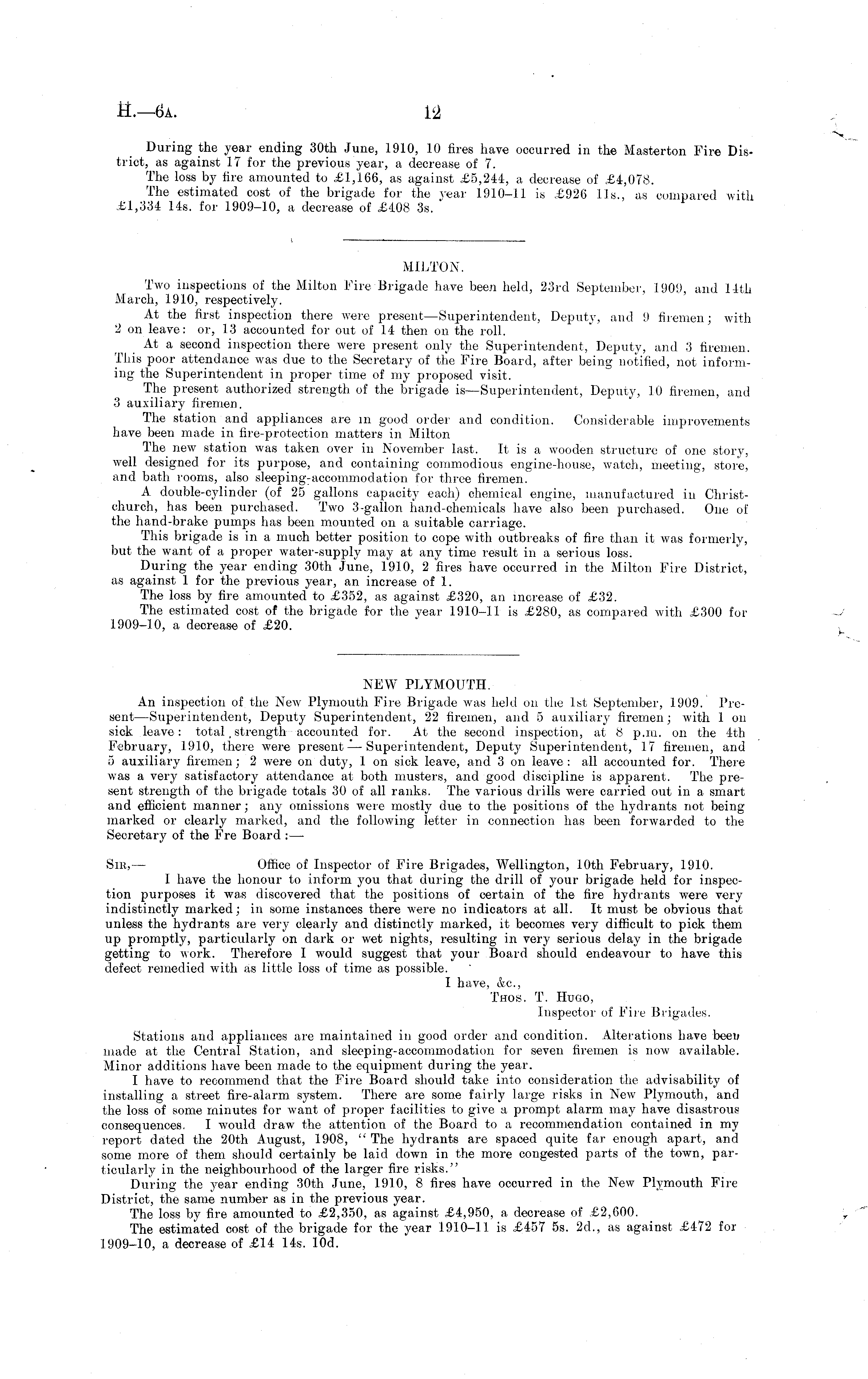MILTON. Two inspections of the Milton Fire Brigade have been held, 23rd September, 1909, and 14th March, 1910, respectively. At the first inspection there were present —Superintendent, Deputy, and 9 firemen; with 2 on leave: or, 13 accounted for out of 14 then on the roll. At a second inspection there were present only the Superintendent, Deputy, and 3 firemen. This poor attendance was due to the Secretary of the Fire Board, after being notified, not informing the Superintendent in proper time of my proposed visit. The present authorized strength of the brigade is—Superintendent, Deputy, 10 firemen, and 3 auxiliary firemen. The station and appliances are in good order and condition. Considerable improvements have been made in fire-protection matters in Milton The new station was taken over in November last. It is a wooden structure of one story, well designed for its purpose, and containing commodious engine-house, watch, meeting, store, and bath rooms, also sleeping-accommodation for three firemen. A double-cylinder (of 25 gallons capacity each) chemical engine, manufactured in Christchurch, has been purchased. Two 3-gallon hand-chemicals have also been purchased. One of the hand-brake pumps has been mounted on a suitable carriage. This brigade is in a much better position to cope with outbreaks of fire than it was formerly, but the want of a proper water-supply may at any time result in a serious loss. During the year ending 30th June, 1910, 2 fires have occurred in the Milton Fire District, as against 1 for the previous year, an increase of 1. The loss by fire amounted to £352, as against £320, an increase of £32. The estimated cost of the brigade for the year 1910-11 is £280, as compared with £300 for 1909-10, a decrease of £20.
