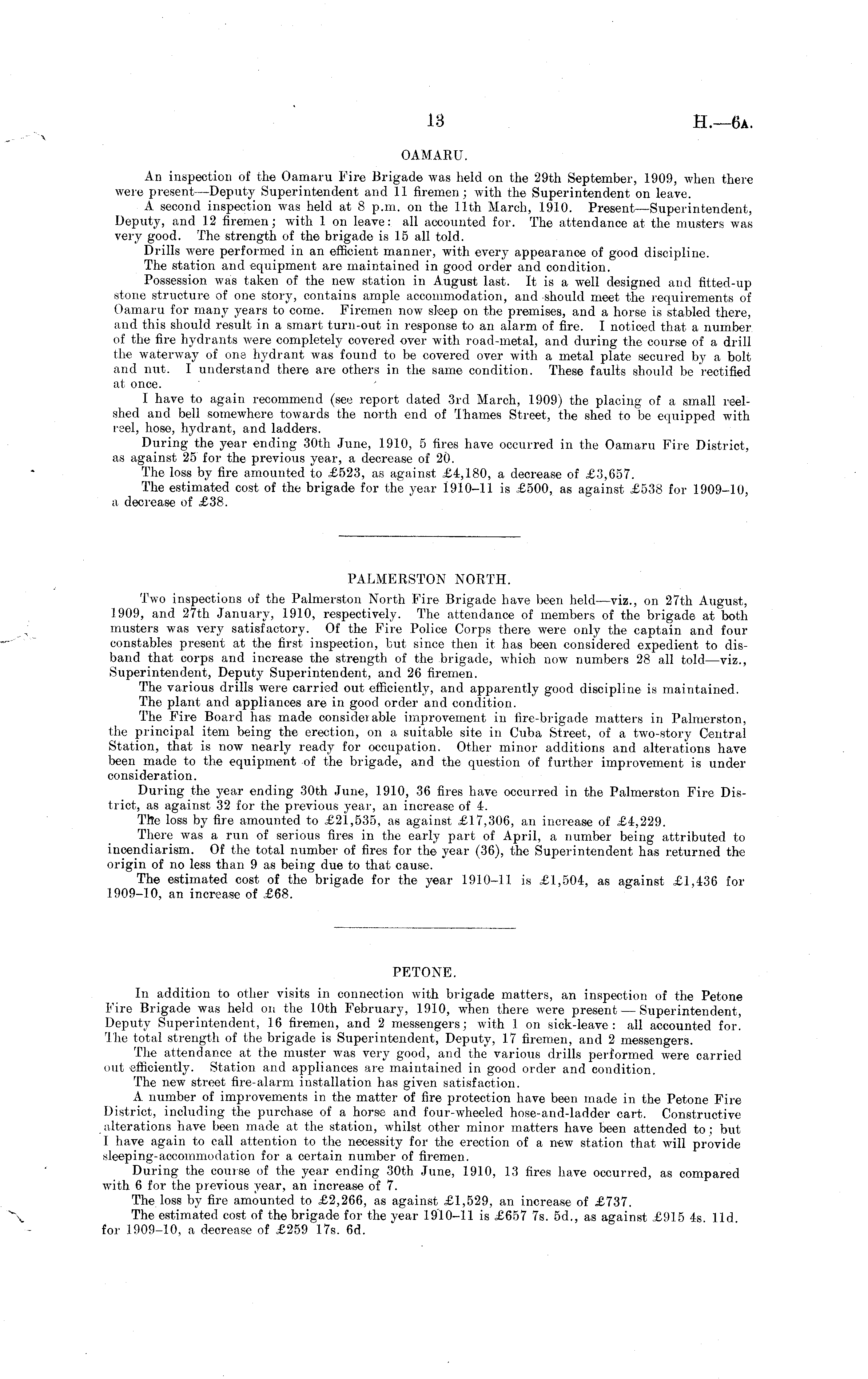 PALMERSTON NORTH. Two inspections of the Palmerston North Fire Brigade have been held—viz., on 27th August, 1909, and 27th January, 1910, respectively. The attendance of members of the brigade at both musters was very satisfactory. Of the Fire Police Corps there were only the captain and four constables present at the first inspection, but since then it has been considered expedient to disband that corps and increase the strength of the brigade, which now numbers 28 all told —viz., Superintendent, Deputy Superintendent, and 26 firemen. The various drills were carried out efficiently, and apparently good discipline is maintained. The plant and appliances are in good order and condition. The Fire Board has made considerable improvement in fire-brigade matters in Palmerston, the principal item being the erection, on a suitable site in Cuba Street, of a two-story Central Station, that is now nearly ready for occupation. Other minor additions and alterations have been made to the equipment of the brigade, and the question of further improvement is under consideration. During the year ending 30th June, 1910, 36 fires have occurred in the Palmerston Fire District, as against 32 for the previous year, an increase of 4. The loss by fire amounted to £21,535, as against £17,306, an increase of £4,229. There was a run of serious fires in the early part of April, a number being attributed to incendiarism. Of the total number of fires for the year (36), the Superintendent has returned the origin of no less than 9 as being due to that cause. The estimated cost of the brigade for the year 1910-11 is £1,504, as against £1,436 for 1909-10, an increase of £68.