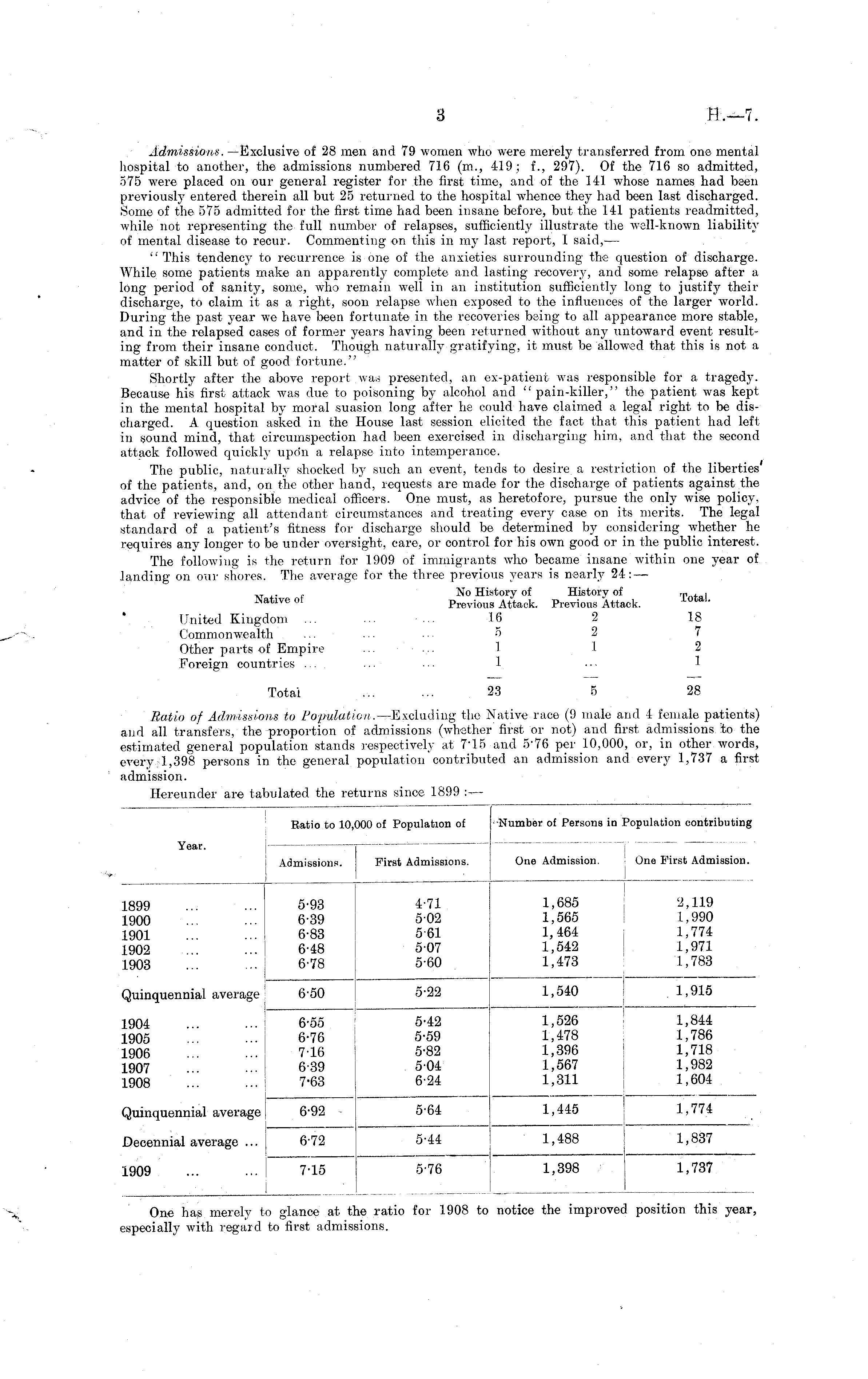 Admissions. —Exclusive of 28 men and 79 women who were merely transferred from one mental hospital to another, the admissions numbered 716 (m., 419; f., 297). Of the 716 so admitted, 575 were placed on our general register for the first time, and of the 141 whose names had been previously entered therein all but 25 returned to the hospital whence they had been last discharged. Some of the 575 admitted for the first time had been insane before, but the 141 patients readmitted, while not representing the full number of relapses, sufficiently illustrate the well-known liability of mental disease to recur. Commenting on this in my last report, I said, — ''This tendency to recurrence is one of the anxieties surrounding the question of discharge. While some patients make an apparently complete and lasting recover}-, and some relapse after a long period of sanity, some, who remain well in an institution sufficiently long to justify their discharge, to claim it as a right, soon relapse when exposed to the influences of the larger world. During the past year we have been fortunate in the recoveries being to all appearance more stable, and in the relapsed cases of former years having been returned without any untoward event resulting from their insane conduct. Though naturally gratifying, it must be allowed that this is not a matter of skill but of good fortune." Shortly after the above report was presented, an ex-patient was responsible for a tragedy. Because his first attack was due to poisoning by alcohol and " pain-killer," the patient was kept in the mental hospital by moral suasion long after he could have claimed a legal right to be discharged. A question asked in the House last session elicited the fact that this patient had left in sound mind, that circumspection had been exercised in discharging him, and that the second attack followed quickly updn a relapse into intemperance. The public, naturally shocked by such an event, tends to desire a restriction of the liberties of the patients, and, on the other hand, requests are made for the discharge of patients against fte advice of the responsible medical officers. One must, as heretofore, pursue the only wise policy, that of reviewing all attendant circumstances and treating every case on its merits. The legal standard of a patient's fitness for discharge should be determined by considering whether he requires any longer to be under oversight, care, or control for his own good or in the public interest. The following is the return for 1909 of immigrants who became insane within one year of landing on our shores. The average for the three previous years is nearly 24: — „ ~ , No History of History of r ,, ~ Native ot Previous Attack. Previous Attack. iotaL United Kingdom ... ... 16 2 18 Commonwealth ... ■'■ ■ ■ • ■ 5 2 7 Other parts of Empire ... ... 1 1 Foreign countries ... ... ■•■ 1 ••■ 1 Total 23 5 28 Ratio of Admissions to Population. —Excluding the Native race (9 male and 4 female patients) and all transfers, the proportion of admissions (whether first or not) and first admissions 'to the estimated general population stands respectively at 715 and 5-76 per 10,000, or, in other words, every 1,398 persons in the general population contributed an admission and every 1,737 a first admission. Hereunder are tabulated the returns since 1899 :-r—
