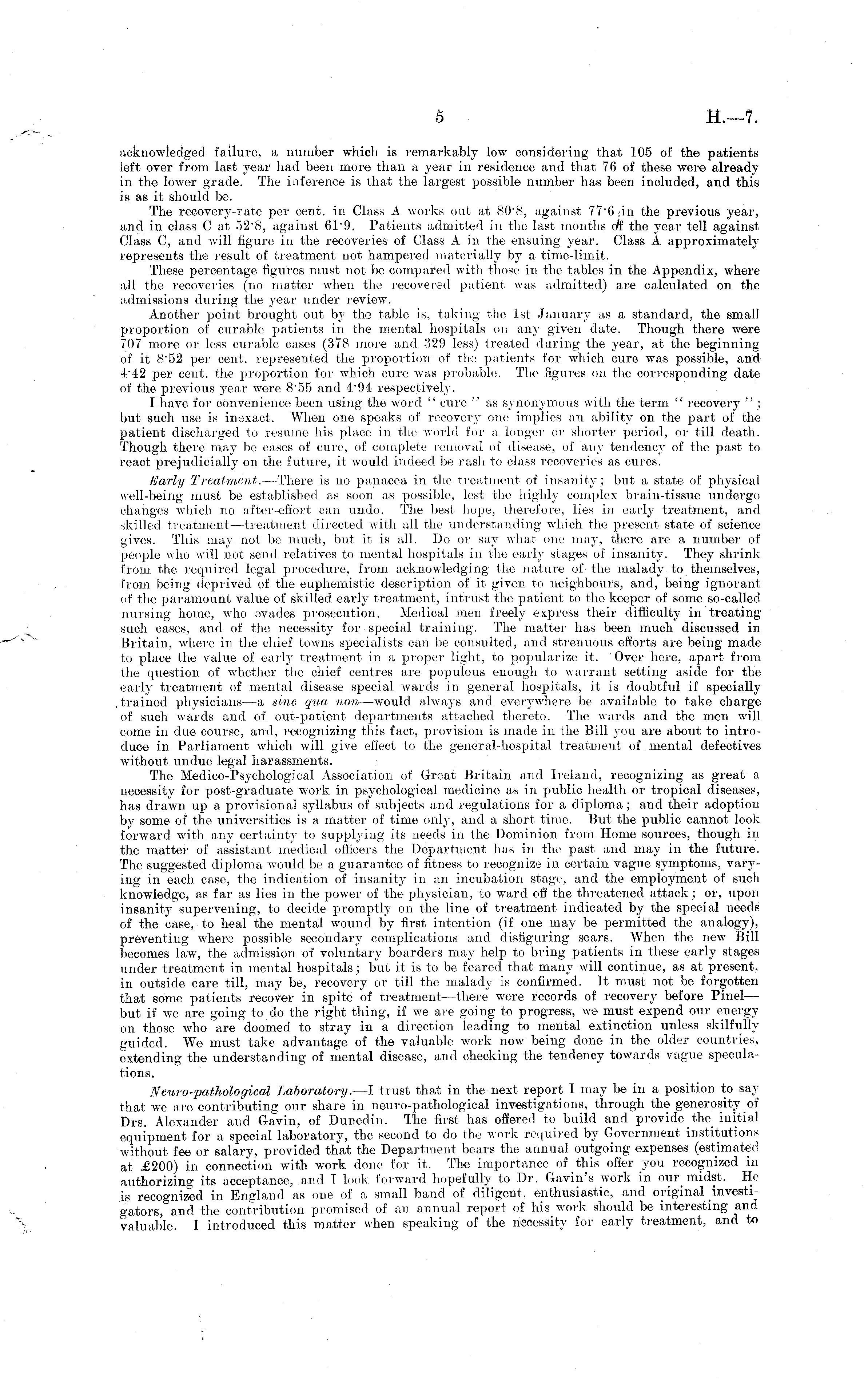 acknowledged failure, a number which is remarkably low considering that 105 of the patients left over from last year had been more than a year in residence and that 76 of these were already in the lower grade. The inference is that the largest possible number has been included, and this is as it should be. The recovery-rate per cent, in Class A works out at 808, against 77'6jin the previous year, and in class Cat 528, against 619. Patients admitted in the last months of the year tell against Class C, and will figure in the recoveries of Class A in the ensuing year. Class A approximately represents the result of treatment not hampered materially by a time-limit. These percentage figures must not be compared with those in the tables in the Appendix, where all the recoveries (no matter when the recovered patient was admitted) are calculated on the admissions during the year under review. Another point brought out by the table is, taking the Ist January as a standard, the small proportion of curable patients in the mental hospitals on anj T given date. Though there were 707 more or less curable cases (378 more and 329 less) treated during the year, at the beginning of it 852 per cent, represented the proportion of the patients for which euro was possible, and 442 per cent, the proportion for which cure was probable. The figures on the corresponding date of the previous year were 855 and 494 respectively. I have for convenience been using the word " cure " as synonymous with the term " recovery " ; but such use is inexact, When one speaks of recovery one implies an ability on the part of the patient discharged to resume his place in the world for a longer or shorter period, or till death. Though there may be cases of cure, of complete removal of disease, of any tendency of the past to react prejudicially on the future, it would indeed be rash to class recoveries as cures. Early Treatment .—There is no panacea in the treatment of insanity; but a state of physical well-being must be established as soon as possible, lest the highly complex brain-tissue undergo changes which no after-effort can undo. The best hope, therefore, lies in early treatment, and skilled treatment —treatment directed with all the understanding which the present state of science gives. This may not be much, but it is all. Do or say what one may, there are a number of people who will not send relatives to mental hospitals in the early stages of insanity. They shrink from the required legal procedure, from acknowledging the nature of the malady to themselves, from being deprived of the euphemistic description of it given to neighbours, and, being ignorant of the paramount value of skilled early treatment, intrust the patient to the keeper of some so-called nursing home, who evades prosecution. Medical men freely express their difficulty in treating such cases, and of the necessity for special training. The matter has been much discussed in Britain, where in the chief towns specialists can be consulted, and strenuous efforts are being made to place the value of early treatment in a proper light, to popularize it. Over here, apart from the question of whether the chief centres are populous enough to warrant setting aside for the early treatment of mental disease special wards in general hospitals, it is doubtful if specially trained physicians —a sine qua. non —would always and everywhere be available to take charge of such wards and of out-patient departments attached thereto. The wards and the men will come in due course, and, recognizing this fact, provision is made in the Bill you are about to introduce in Parliament which will give effect to the general-hospital treatment of mental defectives without, undue legal harassments. The Medico-Psychological Association of Great Britain and Ireland, recognizing as great a uecessitj- for post-graduate work in psychological medicine as in public health or tropical diseases, has drawn up a provisional syllabus of subjects and regulations for a diploma; and their adoption by some of the universities is a matter of time only, and a short time. But the public cannot look forward with any certainty to supplying its needs in the Dominion from Home sources, though in the matter of assistant medical officers the Department has in the past and may in. the future. The suggested diploma would be a guarantee of fitness to recognize in certain vague symptoms, varying in each case, the indication of insanity in an incubation stage, and the employment of such knowledge, as far as lies in the power of the physician, to ward off the threatened attack; or, upon insanity supervening, to decide promptly on the line of treatment indicated by the special needs of the case, to heal the mental wound by first intention (if one may be permitted the analogy), preventing where possible secondary complications and disfiguring scars. When the new Bill becomes law, the admission of voluntary boarders may help to bring patients in these early stages under treatment in mental hospitals; but it is to be feared that many will continue, as at present, in outside care till, may be, recovery or till the malady is confirmed. It must not be forgotten that some patients recover in spite of treatment—there were records of recovery before Pinel— but if we are going to do the right thing, if we are going to progress, we must expend our energy on those who are doomed to stray in a direction leading to mental extinction unless skilfully guided. We must take advantage of the valuable work now being done in the older countries, extending the understanding of mental disease, and checking the tendency towards vague speculations. Neuro-pathological Laboratory. —l trust that in the next report I may be in a position to say that we are contributing our share in neuro-pathological investigations, through the generosity of Drs. Alexander and Gavin, of Dunedin. Tlie first has offered to build and provide the initial equipm
