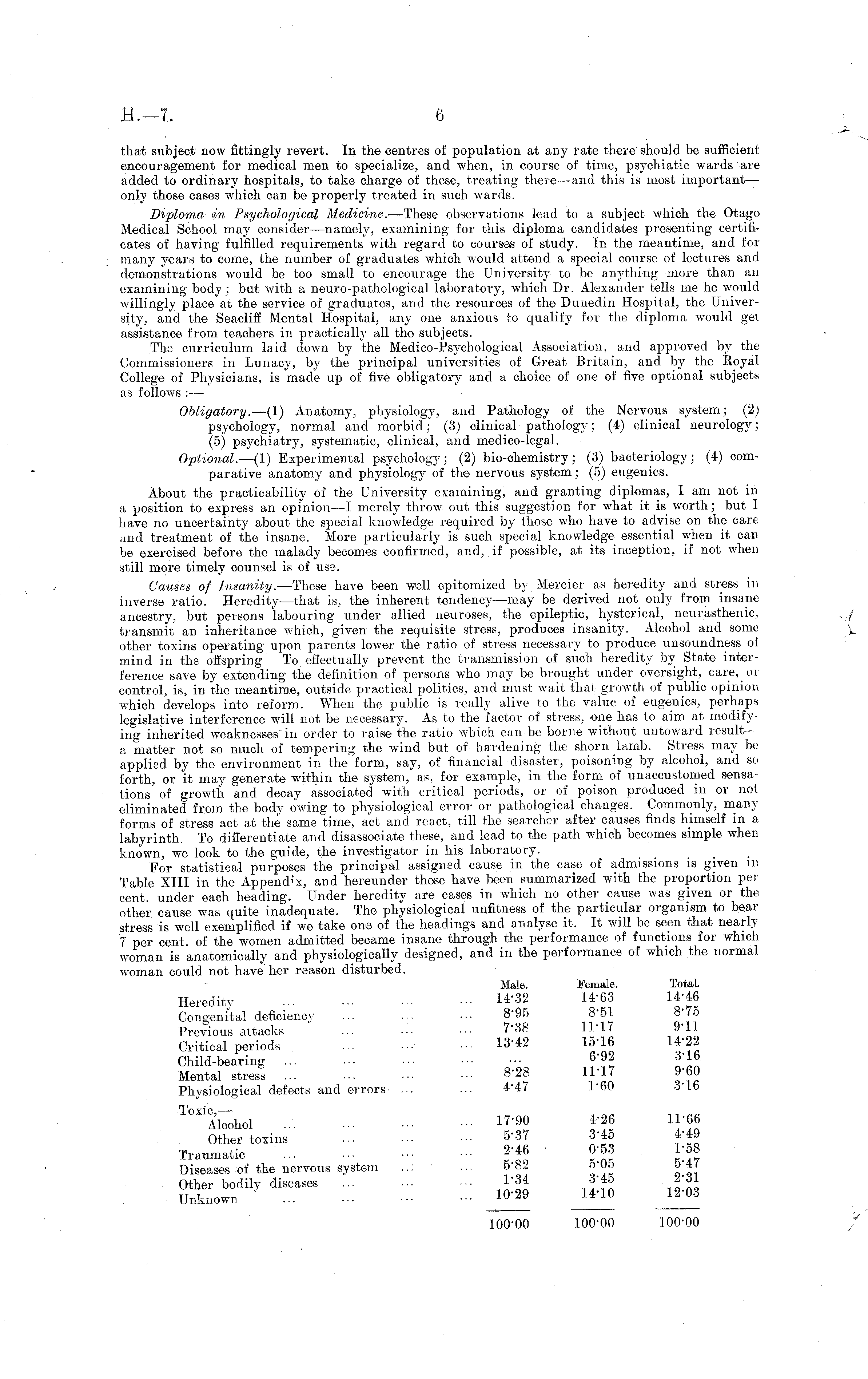 that subject now fittingly revert. In the centres of population at any rate there should be sufficient encouragement for medical men to specialize, and when, in course of time, psychiatic wards are added to ordinary hospitals, to take charge of these, treating there —and this is most important— only those cases which can be properly treated in such wards. Diploma in Psychological Medicine. —These observations lead to a subject which the Otago Medical School may consider—namely, examining for this diploma candidates presenting certificates of having fulfilled requirements with regard to courses of study. In the meantime, and for many years to come, the number of graduates which would attend a special course of lectures and demonstrations would be too small to encourage the University to be anything more than an examining body; but with a neuro-pathological laboratory, which Dr. Alexander tells me he would willingly place at the service of graduates, and the resources of the Dunedin Hospital, the University, and the Seacliff Mental Hospital, any one anxious to qualify for the diploma would get assistance from teachers in practically all the subjects. The curriculum laid down by the Medico-Psychological Association, and approved by the Commissioners in Lunacy, by the principal universities of Great Britain, and by the Royal College of Physicians, is made up of five obligatory and a choice of one of five optional subjects as follows .-— Obligatory. —(l) Anatomy, physiology, and Pathology of the Nervous system; (2) psychology, normal and morbid; (3) clinical pathology; (4) clinical neurology; (5) psychiatry, systematic, clinical, and medico-legal. Optional. —(l) Experimental psychology; (2) bio-chemistry; (3) bacteriology; (4) comparative anatomy and physiology of the nervous system ; (5) eugenics. About the practicability of the University examining, and granting diplomas, I am not in a position to express an opinion—l merely throw out this suggestion for what it is worth; but I have no uncertainty about the special knowledge required by those who have to advise on the care and treatment of the insane. More particularly is such special knowledge essential when it can be exercised before the malady becomes confirmed, and, if possible, at its inception, if not when still more timely counsel is of use. Causes of Insanity. —These have been well epitomized by Mercier as heredity and stress in inverse ratio. Heredity —that is, the inherent tendency—may be derived only from insane ancestry, but persons labouring under allied neuroses, the epileptic, hysterical, neurasthenic, transmit an inheritance which, given the requisite stress, produces insanity. Alcohol and some \ other toxins operating upon parents lower the ratio of stress necessary to produce unsoundness of mind in the offspring To effectually prevent the transmission of such heredity by State interference save by extending the definition of persons who may be brought under oversight, care, or control, is, in the meantime, outside practical politics, and must wait that growth of public opinion which develops into reform. When the public is really alive to the value of eugenics, perhaps legislative interference will not be necessary. As to the factor of stress, one has to aim at modifying inherited weaknesses in order to raise the ratio which can be borne without untoward result--a matter not so much of tempering the wind but of hardening the shorn lamb. Stress may be applied by the environment in the form, say, of financial disaster, poisoning by alcohol, and so forth, or it may generate within the system, as, for example, in the form of unaccustomed sensations of growth and decay associated with critical periods, or of poison produced in or not eliminated from the body owing to physiological error or pathological changes. Commonly, many forms of stress act at the same time, act and react, till the searcher after causes finds himself in a labyrinth. To differentiate and disassociate these, and lead to the path which becomes simple when known, we look to the guide, the investigator in his laboratory. For statistical purposes the principal assigned cause in the case of admissions is given m Table XIII in the Appendix, and hereunder these have been summarized with the proportion per cent, under each heading. Under heredity are cases in which no other cause was given or the other cause was quite inadequate. The physiological unfitness of the particular organism to bearstress is well exemplified if we take one of the headings and analyse it. It will be seen that nearly 7 per cent of the women admitted became insane through the performance of functions for which woman is anatomically and physiologically designed, and in the performance of which the normal woman could not have her reason disturbed. Male. Female. Total. Heredity 14-32 14-63 14-46 Congenital deficiency ... ... ••• 8"95 8-51 8-75 Previous attacks " 738 11-17 9"1 I Critical periods , •■• 1342 lo'l6 H'22 Child-bearing ... ... ••• 6 9 ? f*° Mental stress 8"28 IM7 9-60 Physiological defects and errors ... ... 4-47 U6O 316 Alcohol ... 17-90 4-26 11-66 Other toxins 5-87 345 4"49 Traumatic ?-46 053 I'sß Diseases of the nervous system ..: ... 0 - »2 o 05 a it SLIT 5 ' di ~" ::. ■:: :» » S 100-00 100-00 100-00