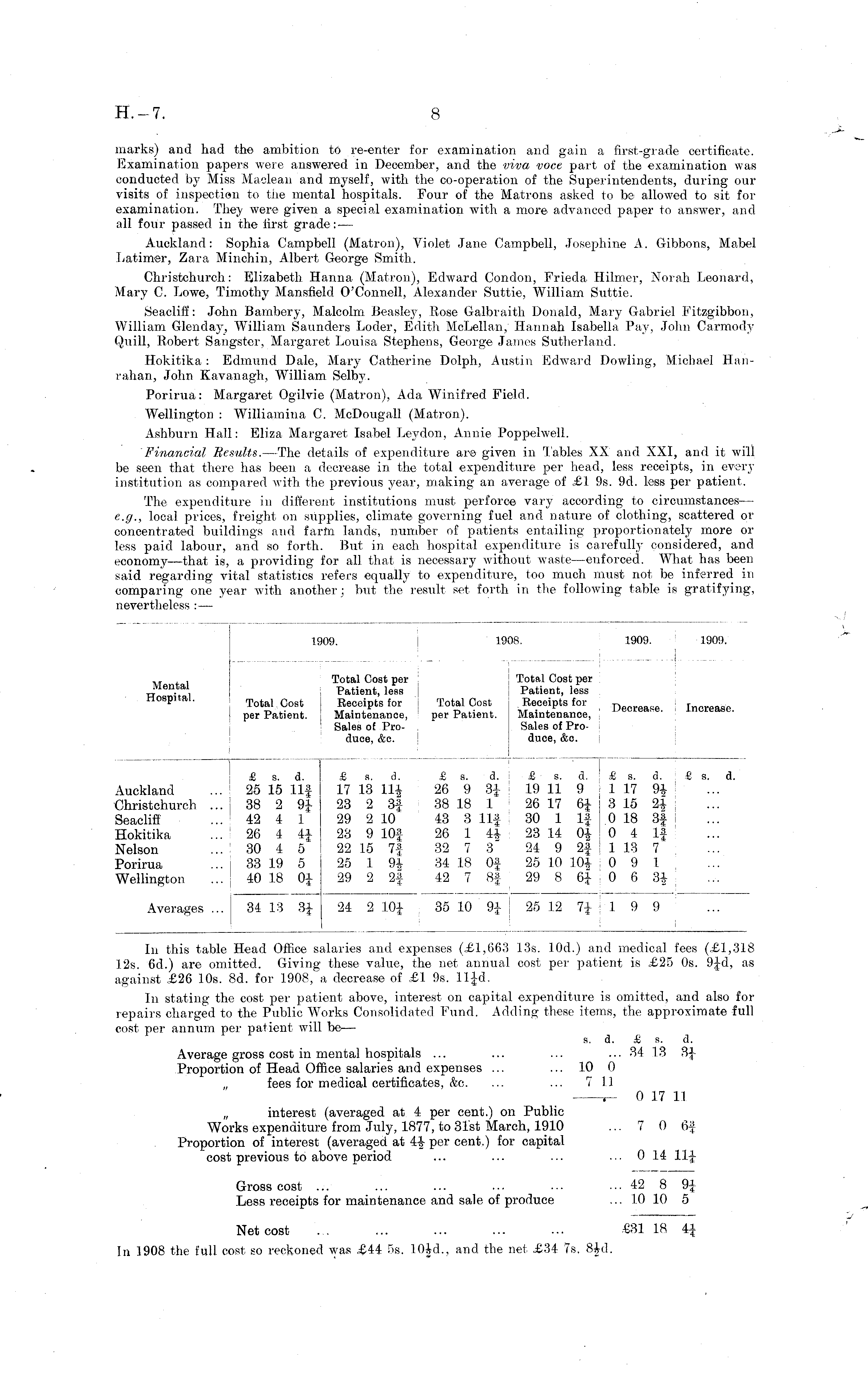 marks) and had the ambition to re-enter for examination and gain a first-grade certificate. Examination papers were answered in December, and the viva voce part of the examination was conducted by Miss Maclean and myself, with the co-operation of the Superintendents, during our visits of inspection to the mental hospitals. Four of the Matrons asked to be allowed to sit for examination. They were given a special examination with a more advanced paper to answer, and all four passed in the first grade: — Auckland: Sophia Campbell (Matron), Violet Jane Campbell, Josephine A. Gibbons, Mabel Latimer, Zara Minchin, Albert George Smith. Christchurch: Elizabeth Hanna (Matron), Edward Condon, Frieda Hilmer, Norah Leonard, Mary C. Lowe, Timothy Mansfield O'Connell, Alexander Suttie, William. Suttie. Seacliff: John Bambery, Malcolm Beasley, Rose Galbraith Donald, Mary Gabriel Fitzgibbon, William Glenday, William Saunders Loder, Edith McLellan, Hannah Isabella Pay, John Carmody Quill, Robert Sangstcr, Margaret Louisa Stephens, George James Sutherland. Hokitika : Edmund Dale, Mary Catherine Dolph, Austin Edward Dowling, Michael Hanrahan, John Kavanagh, William Selby. Porirua: Margaret Ogilvie (Matron), Ada Winifred Field. Wellington : Williamina C. McDougall (Matron). Ashburn Hall: Eliza Margaret Isabel Leydon, Annie Poppelwell. Financial Results. —The details of expenditure are given in Tables XX and XXI, and it will be seen that there has been a decrease in the total expenditure per head, less receipts, in every institution as compared with the previous year, making an average of ,£1 9s. 9d. less per patient. The expenditure in different institutions must perforce vary according to circumstances-— e.g., local prices, freight on supplies, climate governing fuel and. nature of clothing, scattered or concentrated buildings and farm lands, number of patients entailing proportionately more or less paid labour, and so forth. But in each hospital expenditure is carefully considered, and economy—that is, a providing for all that is necessary without waste —enforced. What has been said regarding vital statistics refers equally to expenditure, too much must not be inferred in comparing one year with another ; but the result set forth in the following table is gratifying, nevertheless :—