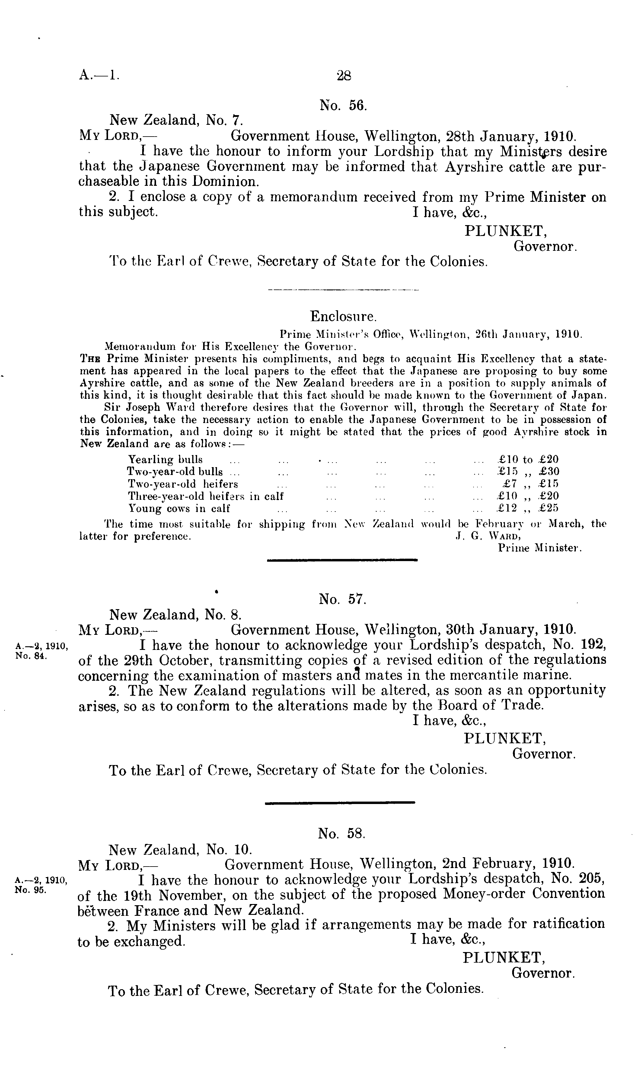 No. 56. New Zealand, No. 7. My Lord, — Government House, Wellington, 28th January, 1910. I have the honour to inform your Lordship that my Ministers desire that the Japanese Government may be informed that Ayrshire cattle are purchaseable in this Dominion. 2. I enclose a copy of a memorandum received from my Prime Minister on this subject. I have, &c, PLUNKET, Governor. To the Earl of Crewe, Secretary of State for the Colonies.