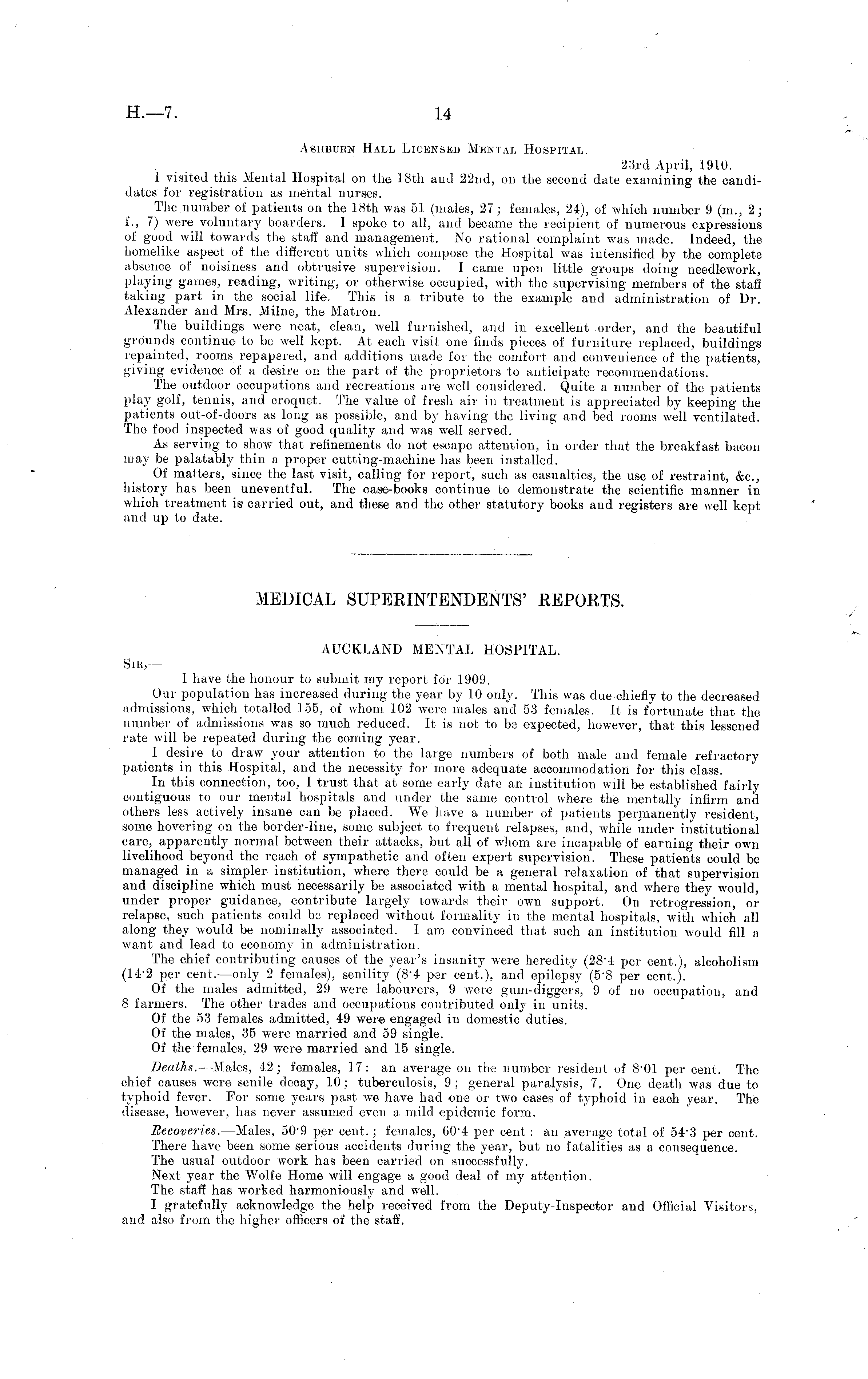 MEDICAL SUPERINTENDENTS' REPORTS. AUCKLAND MENTAL HOSPITAL. Sir, — 1 have the honour to submit my report for 1909. Our population has increased during the year by 10 only. This was due chiefly to the decreased admissions, which totalled 155, of whom 102 were males and 53 females. It is fortunate that the number of admissions was so much reduced. It is not to be expected, however, that this lessened rate will be repeated during the coming year. I desire to draw your attention to the large numbers of both male and female refractory patients in this Hospital, and the necessity for "more adequate accommodation for this class. In this connection, too, I trust that at some early date an institution will be established fairly contiguous to our mental hospitals and under the same control where the mentally infirm and others less actively insane can be placed. We have a number of patients permanently resident, some hovering on the border-line, some subject to frequent relapses, and, while under institutional care, apparently normal between their attacks, but all of whom are incapable of earning their own livelihood beyond the reach of sympathetic and often expert supervision. These patients could be managed in a simpler institution, where there could be a general relaxation of that supervision and discipline which must necessarily be associated with a mental hospital, and where they would, under proper guidance, contribute largely towards their own support, On retrogression, or relapse, such patients could be replaced without formality in the mental hospitals, with which all along they would be nominally associated. I am convinced that such an institution would fill a want and lead to economy in administration. The chief contributing causes of the year's insanity were heredity (284 per cent.), alcoholism (142 per cent. —only 2 females), senility (B'4 per cent.), and epilepsy (sB per cent.). Of the males admitted, 29 were labourers, 9 were gum-diggers, 9 of no occupation, and 8 farmers. The other trades and occupations contributed only in units. Of the 53 females admitted, 49 were engaged in domestic duties. Of the males, 35 were married and 59 single. Of the females, 29 were married and 15 single. Deaths. —Males, 42; females, 17: an average on the number resident of S'OI per cent. The chief causes were senile decay, 10; tuberculosis, 9; general paralysis, 7. One death was due to typhoid fever. For some years past we have had one or two cases of typhoid in each year. The disease, however, has never assumed even a mild epidemic form. Recoveries. —Males, 50-9 per cent, ; females, 604 per cent: an average total of 543 per cent. There have been some serious accidents during the year, but no fatalities as a consequence. The usual outdoor work has been carried on successfully. Next year the Wolfe Home will engage a good deal of my attention. The staff has worked harmoniously and well. I gratefully acknowledge the help received from the Deputy-Inspector and Official Visitors, and also from the higher officers of the staff.