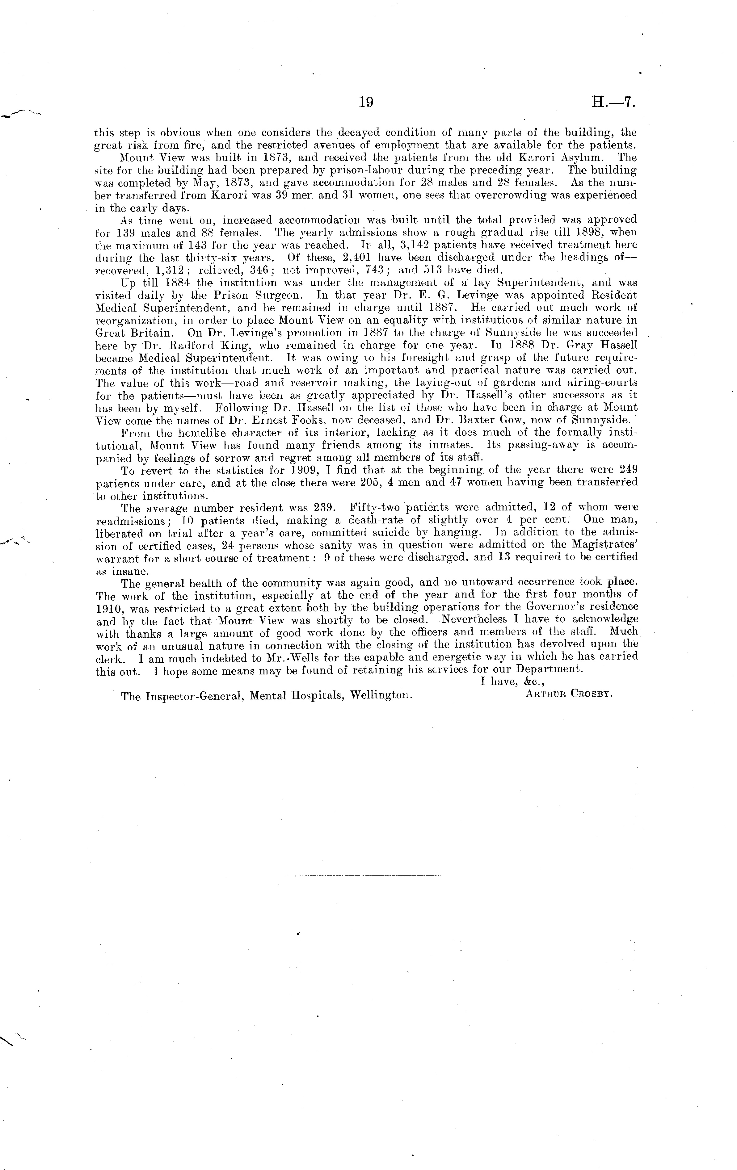 this step is obvious when one considers the decayed condition of many parts of the building, the great risk from fire, and the restricted avenues of employment that are available for the patients. Mount View was built in 1873, and received the patients from the old Karori Asylum. The site for the building had been prepared by prison-labour during the preceding year. The building was completed by May, 1873, and gave accommodation for 28 males and 28 females. As the number transferred from Karori was 39 men and 31 women, one sees that overcrowding was experienced in the early days. As time went on, increased accommodation was built until the total provided was approved for 139 males and 88 females. The yearly admissions show a rough gradual rise till 1898, when the maximum of 143 for the year was reached. In all, 3,142 patients have received treatment here during the last thirty-six years. Of these, 2,401 have been discharged under the headings of— recovered, 1,312; relieved, 346; not improved, 743; and 513 have died. Up till 1884 the institution was under the management of a lay Superintendent, and was visited daily by the Prison Surgeon. In that 3-ear Dr. E. G. Levinge was appointed Resident Medical Superintendent, and he remained in charge until 1887. He carried out much work of reorganization, in order to place Mount View on an equality with institutions of similar nature in Great Britain. On Dr. Levinge's promotion in 1887 to the charge of Sunnyside he was succeeded here by Dr. Radford King, who remained in charge for one year. In 1888 Dr. Gray Hassell became Medical Superintendent. It was owing to his foresight and grasp of the future requirements of the institution that much work of an important and practical nature was carried out. The value of this work —road and reservoir making, the laying-out of gardens and airing-courts for the patients—must have been as greatly appreciated by Dr. Hassell's other successors as it has been by myself. Following Dr. Hassell on the list of those who have been in charge at Mount View come the names of Dr. Ernest Fooks, now deceased, and Dr. Baxter Gow, now of Sunnyside. From the homelike character of its interior, lacking as it does much of the formally institutional, Mount View has found many friends among its inmates. Its passing-away is accompanied by feelings of sorrow and regret among all members of its staff. To revert to the statistics for 1909, I find that at the beginning of the year there were 249 patients under care, and at the close there were 205, 4 men and 47 women having been transferred to other institutions. The average number resident was 239. Fifty-two patients were admitted, 12 of whom were readmissions ;10 patients died, making a death-rate of slightly over 4 per cent. One man, liberated on trial after a year's care, committed suicide by hanging. In addition to the admission of certified cases, 24 persons whose sanity was in question were admitted on the Magistrates' warrant for a short course of treatment : 9 of these were discharged, and 13 required to be certified as insane. The general health of the community was again good, and no untoward occurrence took place. The work of the institution, especially at the end of the year and for the first four months of 1910, was restricted to a great extent both by the building operations for the Governor's residence and by the fact that Mount View was shortly to be closed. Nevertheless I have to acknowledge with thanks a large amount of good work done by the officers and members of the staff. Much work of an unusual nature in connection with the closing of the institution has devolved upon the clerk. lam much indebted to Mr.-Wells for the capable and energetic way in which he has carried this out. I hope some means may be found of retaining his services for our Department. I have, &c, The Inspector-General, Mental Hospitals, Wellington. Arthur Crosby.