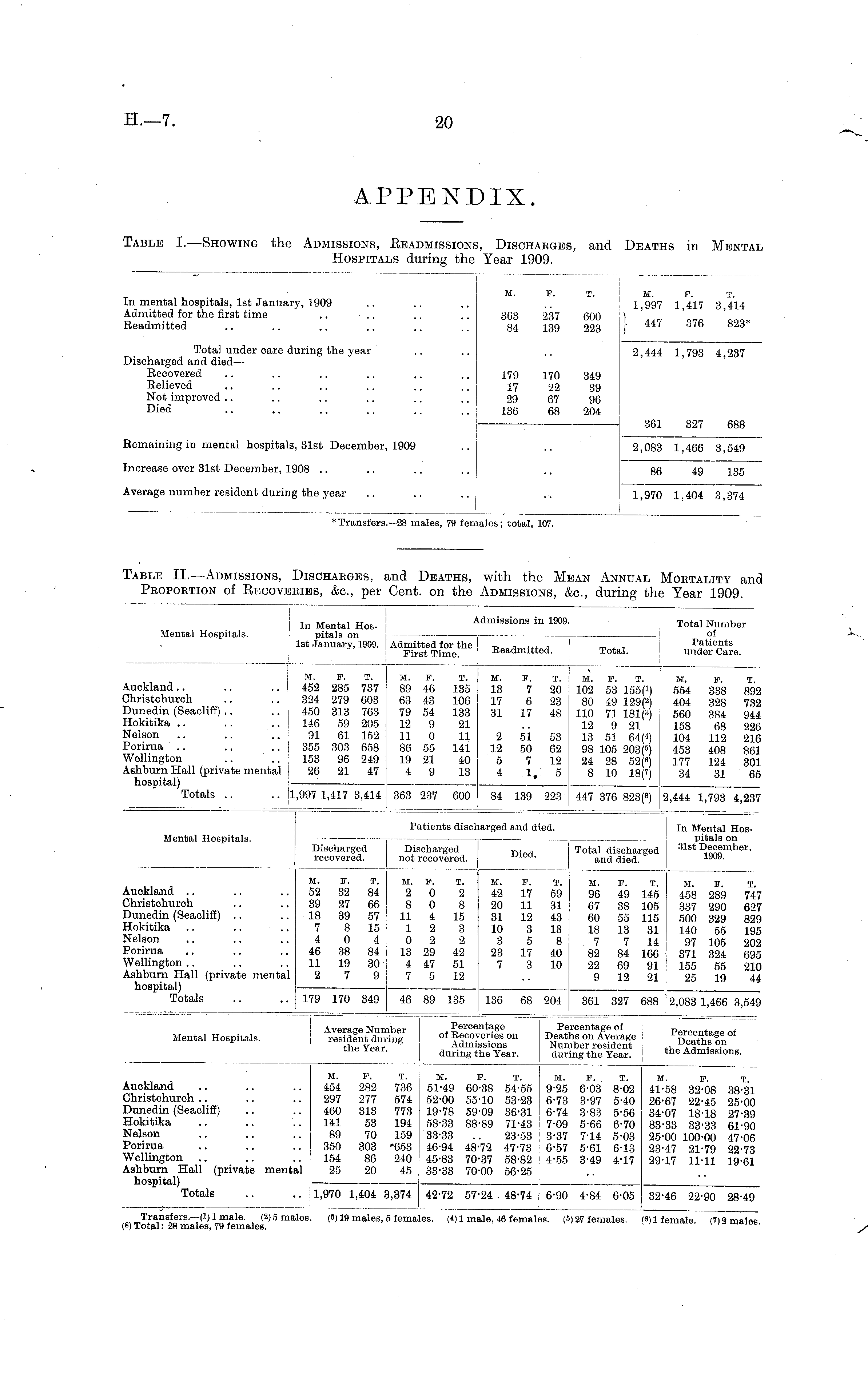 Admissions in 1909. Mental Hospitals. In Mental Hospitals on 1st January, 1909. Total Number of Patients under Care. Admitted for the j First Time. Readmitted. Total. M. F. T. Auckland.. .. .. ! 452 285 737 mristchurch .. 324 279 603 Dunedin (Seacliff) .. ... I 450 313 763 Hokitika .. .. .. I 146 59 205 kelson .. .. .. 91 61 152 3 orirua .. .. .. j 355 303 658 Wellington .. ..153 96 249 lshburn Hall (private mental : 26 21 47 hospital) : Totals .. .. 11,997 1,417 3,414 .1 M. F. 89 46 63 43 79 54 12 9 11 0 86 55 19 21 4 9 T. 135 106 133 21 11 141 40 13 M. 13 17 31 2 12 5 4 F. 7 6 17 51 50 7 i. T. 20 23 48 53 62 12 5 M. F. T. 102 53 155P) 80 49 129( 2 ) 110 71 181( 8 ) 12 9 21 13 51 64(4) 98 105 203( 5 ) 24 28 52( 6 ) 8 10 18(7) M. 554 404 560 158 104 453 177 34 F. 338 328 384 68 112 408 124 31 T. 892 732 944 226 216 861 301 65 363 237 600 84 139 223 447 376 823( 8 ) 2,444 1,793 4,237 Mental Hospitals. Discharged recovered. Patients disc] larged and died. Total discharged and died. In Mental Hospitals on 31st December, 1909. Discharged not recovered. Died. M. F. T. oickland .. .. .. 52 32 84 Jhristchurch .. .. 39 27 66 )unedin (Seacliff) .. .. 18 39 57 lokitika .. .. .. 7 8 15 Ielson .. .. .. 4 0 4 'orirua .. .. .. 46 38 84 Wellington.. .. .. 11 19 30 Lshburn Hall (private mental 2 7 9 hospital) ■ Totals .. ..179 170 349 M. F. T. 2 0 2 8 0 8 11 4 15 12 3 0 2 2 13 29 42 4 47 51 7 5 12 M. 42 20 31 10 3 23 7 F. 17 11 12 3 5 17 3 T. 59 31 43 13 8 40 10 M. 96 67 60 18 7 82 22 9 F. T. 49 145 38 105 55 115 13 31 7 14 84 166 69 91 12 21 M. F. 458 289 337 290 500 329 140 55 97 105 371 324 155 55 25 19 T. 747 627 829 195 202 695 210 44 179 170 349 46 89 135 136 68 204 361 327 688 2,083 1,466 3,549 Mental Hospitals. Average Num resident dur: the Year. iber ing Percentage of Recoveries on Admissions during the Year. Pe Deat] Nun dur: 3rcentage of ;hs on Average nber resident •ing the Year. Percentage of Deaths on ;he Admissions. .uckland 'hristchurch .. )unedin (Seacliff) lokitika Jelson 'orirua Wellington .shburn Hall (private mental hospital) Totals M. 454 297 460 141 89 350 154 25 F. 282 277 313 53 70 303 86 20 T. 736 574 773 194 159 '653 240 45 M. F. T. 51-49 60-38 54-55 52-00 55-10 53-23 19-78 59-09 36-31 58-33 88-89 71-43 33-33 .. 23-53 46-94 48-72 47-73 45-83 70-37 58-82 33-33 70-00 56-25 M. F. T. 9-25 6-03 8-02 6-73 3-97 5-40 6-74 3-83 5-56 7-09 5-66 6-70 3-37 7-14 5-03 6-57 5-61 6-13 4-55 3-49 4-17 M. F. T. 41-58 32-08 38-31 26-67 22-45 25-00 34-07 18-18 27-39 83-33 33-33 61-90 25-00 100-00 47-06 23-47 21-79 22-73 29-17 11-11 19-61 1,970 1,404 3,374 42-72 57-24 . 48-74 6-90 4-84 6-05 32-46 22-90 28-49 Transfers.—(1) 1 male. (2) 5 males. (8)Total: 28 males, 79 females. (3) 19 males, 5 females. (4)1 male, 46 females. (5) 27 females. ( 6 )1 female. (1)2 males.