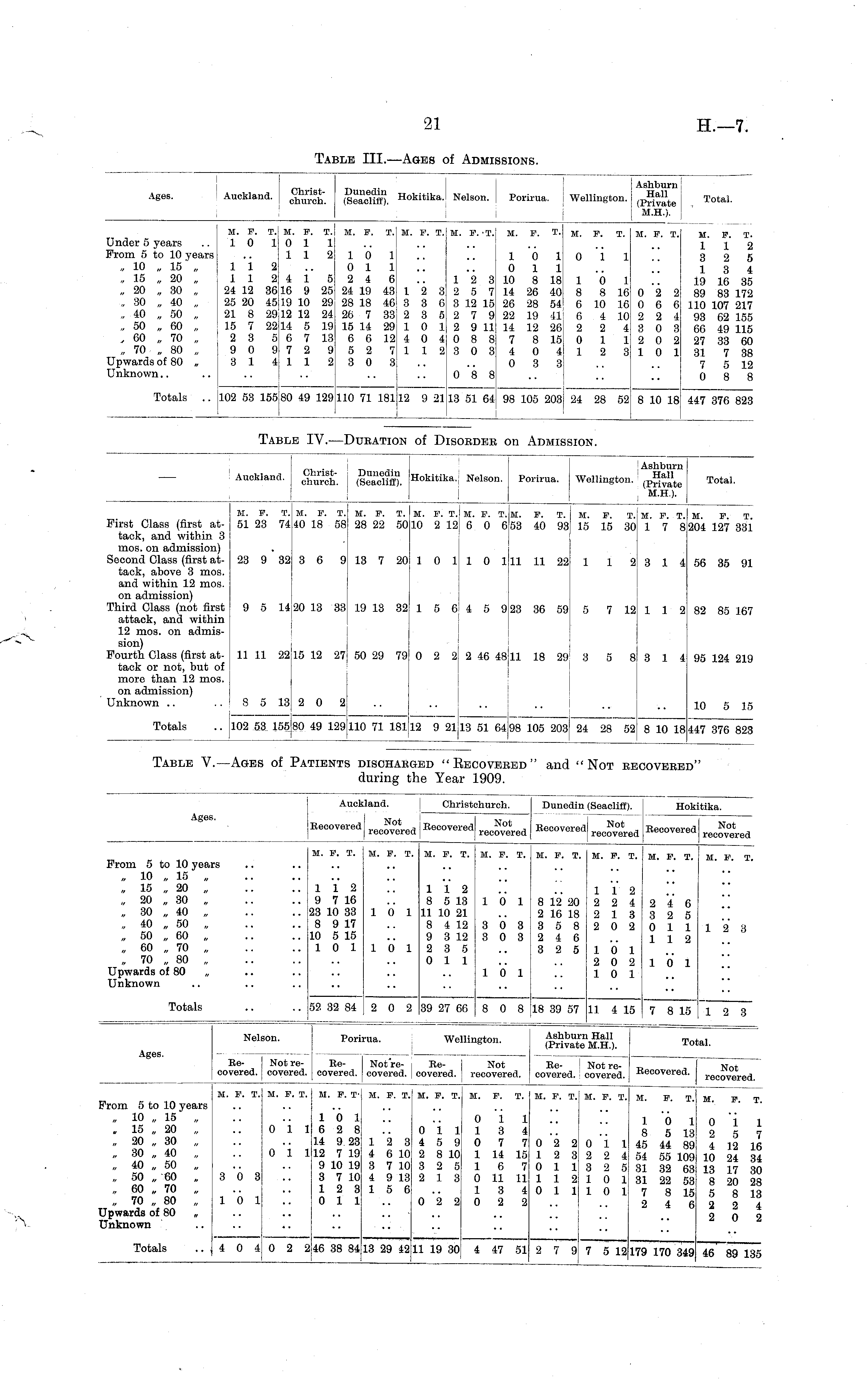 Table V.—Ages of Patients discharged "Recovered" and "Not recovered" during the Year 1909.