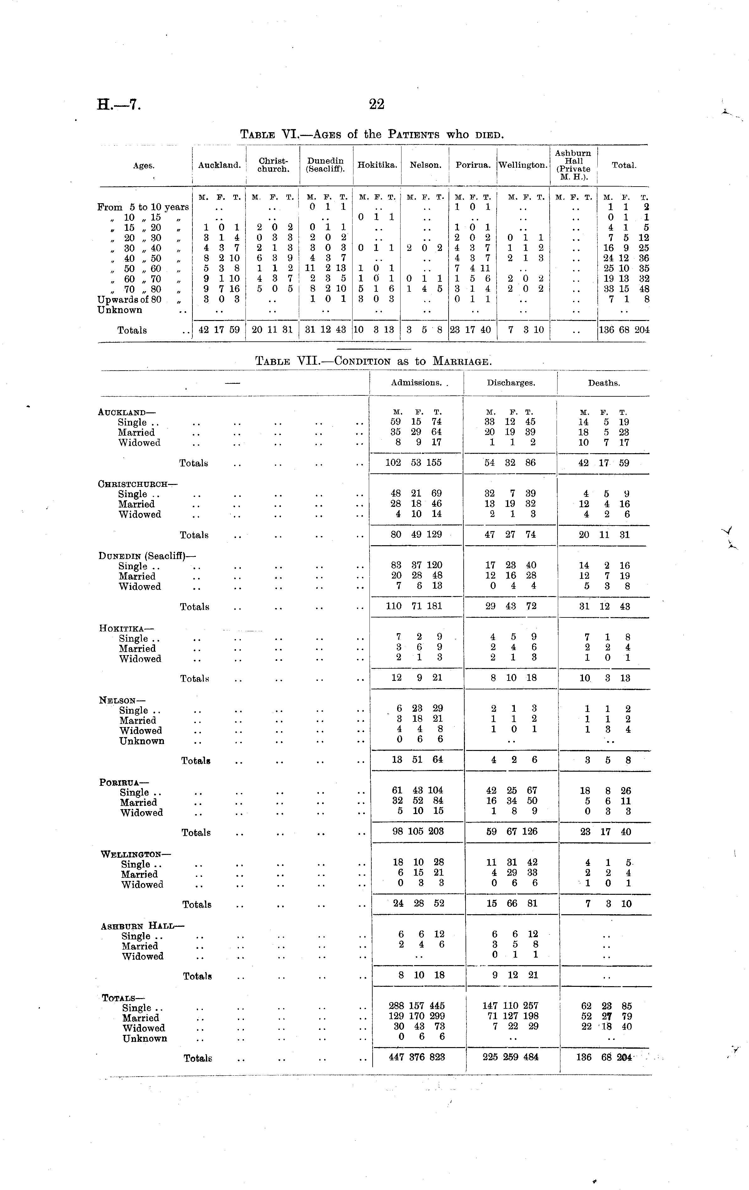 Admissions. . Discharges. Deaths. Auckland— Single Married Widowed M. F. T. 59 15 74 35 29 64 8 9 17 M. F. T. 33 12 45 20 19 39 112 M. 14 18 10 F. T. 5 19 5 23 7 17 Totals 102 53 155 54 32 86 42 17 59 Ghristchurch — Single Married Widowed 48 21 69 28 18 46 4 10 14 32 7 39 13 19 32 2 13 4 12 4 5 9 4 16 2 6 Totals 80 49 129 47 27 74 20 11 31 Dunedin (Seacliff) — Single Married Widowed 83 37 120 20 28 48 7 6 13 17 23 40 12 16 28 0 4 4 14 12 5 2 16 7 19 3 8 Totals 110 71 181 29 43 72 31 12 43 HOKITIKA— Single Married Widowed 7 3 i 2 6 1 9 9 3 4 2 2 5 4 1 9 6 3 7 2 1 1 2 0 8 i 1 Totals 12 9 21 8 10 18 10 3 13 Nelson— Single Married Widowed Unknown 6 23 29 3 18 21 4 4 8 0 6 6 2 1 1 1 1 0 3 2 1 1 1 1 1 1 3 2 2 4 Totals 13 51 64 4 2 6 3 5 8 PORIRTJA — Single Married Widowed 61 43 104 32 52 84 5 10 15 42 25 67 16 34 50 18 9 18 5 0 8 26 6 11 3 3 Totals 98 105 203 59 67 126 23 17 40 Wellington— Single Married Widowed 18 10 28 6 15 21 0 3 3 11 31 42 4 29 33 0 6 6 4 2 1 1 2 0 5 4 1 Totals 24 28 52 15 66 81 7 3 10 Ashburn Hall — Single Married Widowed 6 2 6 12 4 6 6 3 0 6 12 5 8 1 1 Totals 8 10 18 9 12 21 Totals— Single Married Widowed Unknown 288 157 445 129 170 299 30 43 73 0 6 6 147 110 257 71 127 198 7 22 29 62 23 85 52 27 79 22 18 40 Totals 447 376 823 225 259 484 136 68 204