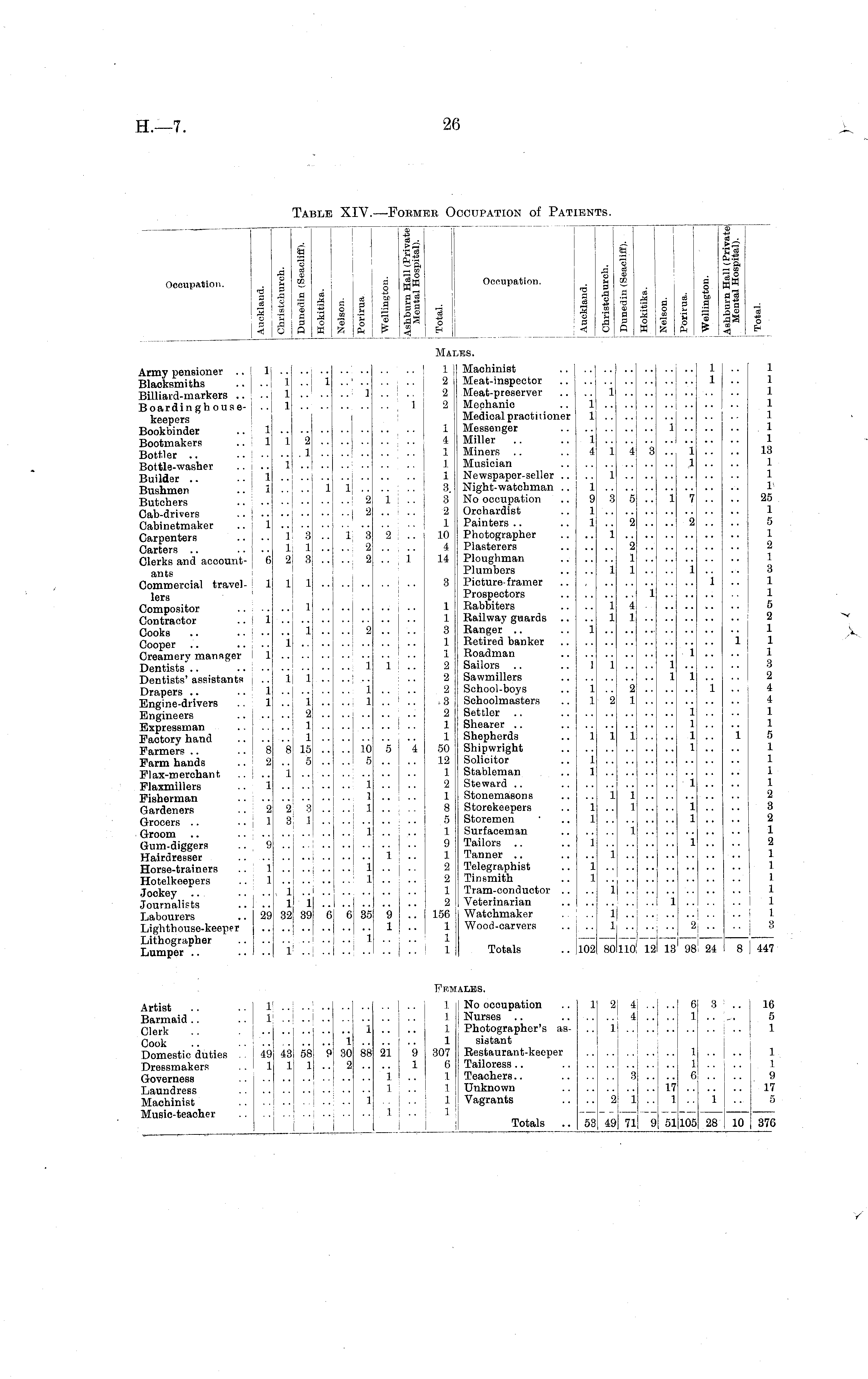 fl o Occupation. . >» a fl M : £ fl u 1 I fl '• s x ' £ a u 0 : a < ; o CO a s Q 3 • >s ■aj ™ p, ~H CO 0 3k I S ™" cS ! M a £ s s ; g a? • fc £ £ 3 & Occupation. IS a (3 o s fl o --, S fl 0 "S fl o S es 03 GO '5 a s P -2 03 . >S g g .3 3a a I (2 & I JH_ e6 a 3 o K M 3 o M -M fl o : u a : * < ; o Mai. .ES. ..; .. 1 .. 1 .. .. 1 .. 1 :::': :: :: I 1 1 . 1 1 .. 1 .. .. 13 .. 1 .. .. 1 1 V 17.. .. 25 1 .. 2 .. .. 5 1 ; 2 i 1 .. 1 .. .. ! 3 .... 1 .. 1 1 ! 5 : 2 1 1 1 .. 1 .. .. 1 1 3 11.... 2 .. .. 1 .. 4 4 .. 1 .. .. 1 .. 1 .. .. 1 .. 1 .. 1 5 .. 1 .. .. 1 1 1 .. 1 .. .. 1 2 .. 1 .. .. 3 .. 1 .. .. 2 1 .. 1 .. .. 2 1 1 i 1. I 1 1 i 1 .. ..I .. .. : 1 .. 2j .. .. j 8 Army pensioner .. I II .. Blacksmiths .. I .. I 1 Billiard-markers .... 1 Boardinghouse-j .. 1 keepers Bookbinder .. 1 • • Bootmakers .. I 1 1 Bottler .. ...... Bottle-washer .. .. 1 Builder .. .. J 1 .. Bushmen .. 1 Butchers • • • • Cab-drivers .. .. Cabinetmaker .. 1 Carpenters .. j .. 1 Carters .. .. I .. 1 Clerks and account- j 6 2 ants 1 i 2 .1 i ..:..'.. .. ! 1 j ..: ...... i 2 ..: 1 .. ' .. 2 1 2 .. 1 I .. 4 .. j 1 . . : j 1 'i! '.'. '.'. . '.'. ! 3. ..: 2 1 .. 3 :: ! . 2 :: ::| I 13 2.. 10 ..: 2 4 ..: 2 .. 1 14 Machinist Meat-inspector Meat-preserver Meohanic Medical practitioner Messenger Miller Miners Musician Newspaper-seller .. Night-watchman .. No occupation Orchardist Painters Photographer Plasterers Ploughman Plumbers Picture-framer Prospectors Rabbiters Railway guards Ranger Retired banker Roadman Sailors Sawmillers School-boys Schoolmasters Settler Shearer Shepherds Shipwright Solicitor Stableman Steward Stonemasons Storekeepers Storemen Surfaceman Tailors Tanner Telegraphist Tinsmith Tram-conductor .. Veterinarian Watchmaker Wood-carvers 1. 1 1 4 1 | ■ • 1 .. 1 4 3 '.'. i 1 1 1 '4 '3 i i 1 9 1 1 1 3 5 '.'. i "l 3 5 i '.'. "2 '.'. '.'. "2 '2 1 1 2 3 1 3 1 .. 2 .. 1 11.... 1 1 i Commercial travel- ' 1 1 lers Compositor .. . ■. Contractor .. I 1 Cooks .. ..;.... Cooper .. .. .. 1 Creamery manager I 1 .. Dentists .. ..:.... Dentists' assistants .. 1 Drapers .. .. 1 .. Engine-drivers .. 1 .. Engineers .... Expressman .. j .. Factory hand .... I ... Farmers .. .. j 8 8 Farm hands .. \ 2 .. Flax-merchant .. j .. 1 Flaxmillers .. 1 .. Fisherman .... Gardeners .. 2 2 Grocers .. ..13 Groom .. .. I .. Gum-diggers .. 9 Hairdresser Horse-trainers .. 1 .. Hotelkeepers .. 1 Jockey .. .. .. > 1 Journalists .. .. 1 Labourers .. 29 32 Lighthouse-keeper .. Lithographer Lumper .. .. . ■ 1 ..j .. .. I .. 3 '' 1 i 1 ........ 1 i .... .. I .. 1 ! ..I 2 .. I .. 3 .. .. .. ; .. 1 .. .. .. 1 .. 1 ..11 11 .. 2 . . j . . : . . 2 I ..' 1 .. ; .. 2 1 .. 1 .. .. 3 : .. 1 .. 10 5 4 50 .. 5 .. .. 12 1 .. 1 .. .. 2 .., 1 .. .. 1 ..I 1 8 ..! .. .. ! .. 5 .. 1 .. .. 1 9 .. .. 1 .. 1 .. 1 .. .. 2 .. 1 .. .. 2 1 2 6 35 9 .. 156 I .. .. 1 ! .. 1 .. l .. I .. I 1 j .. 1 • •! ' 2 .. .. 1 .. .. 14. .. .. 1 1 i 1 i 1 i i .. 1 '.'.] 1 ..: 1 '.'. '.'. .. '.'. i 1 1 1 i| .... ..: 1 .. ..! 2 .. .: 1 .. .. 1 .. 8 15 .. .. 5 .. i; 1 1 1 .. .. 1 .. 11 .. 2 2 1 1 1 11.... 1 1 2 '8 1 " 10 ..I 5 1 1 1 1 1 2 3 1 .. .. '2 3 .. 3 1.. 1 1 .. 1 .. 1 ..: 1 1 1 1 1 1 .. 1 .. .. 1 1 .. 1 1 1 .. 1 1 " i .. 1 1 1 , 1 1 32 1 .. .. 11.. 32 39 6 i 0 6 35 .. 1 1 1 .. 1 ..; 1 1 .. ..! .. 2j 80 lio! 12! 13 1 98! i ! Totals 102 13 981 24 8 j 447 1 1 ..; .. Fem ales. 21 4 .. .. 6 ..! 4 .. .. 1 1 .. 6 3 ! .. 16 .. 1 .. \. 5 .. 1 I' .. 1 .. .. 1 .. 1 .. .. 1 .. 6 .. .. 9 17 17 1 .. 1 .. 5 51105 28 10 376 Artist .. ..11.. Barmaid .. .. j 1 .. Clerk .. ...... Cook .. ..'.... Domestic duties .. 49 43 Dressmakers .. 1 1 Governess Laundress Machinist Music-teacher .. 1 1 49 1 1 '.'. ..j '.. 43 58 9 1 1 .. 1 1 .. 1 .. .. 1 1 1 30 88 21 9 307 2 .. .. 1 6 .. .. 1 .. 1 .... 1 .. 1 .. 1 .. .. 1 .... 1 ; .. !• 1 1 HO 2 1 88 21 9 1 1 .. 1 .. No occupation j Nurses Photographer's assistant Restaurant-keeper Tailoress Teachers Unknown Vagrants 1 .. ..I .. .. 1 1 .. 3 .. .. 6 17 .. 2 1.. 1 .. 49| 71 9 51105 1 1 j .. Totals .. 53 i