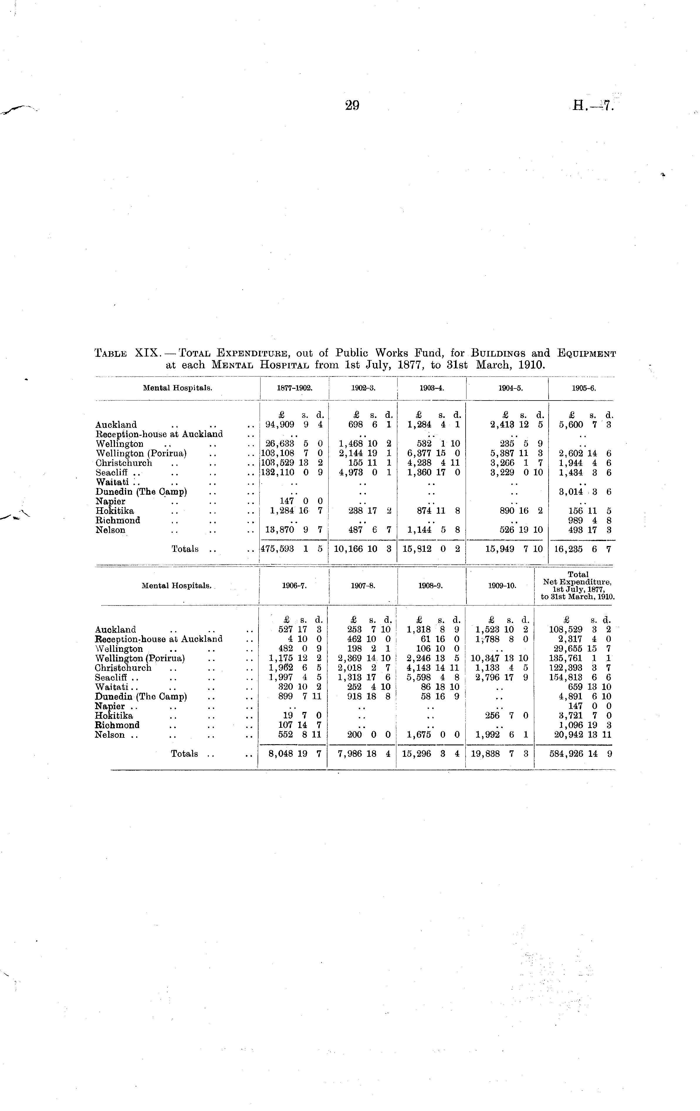Table XIX.—Total Expenditure, out of Public Works Fund, for Buildings and Equipment at each Mental Hospital from 1st July, 1877, to 31st March, 1910.