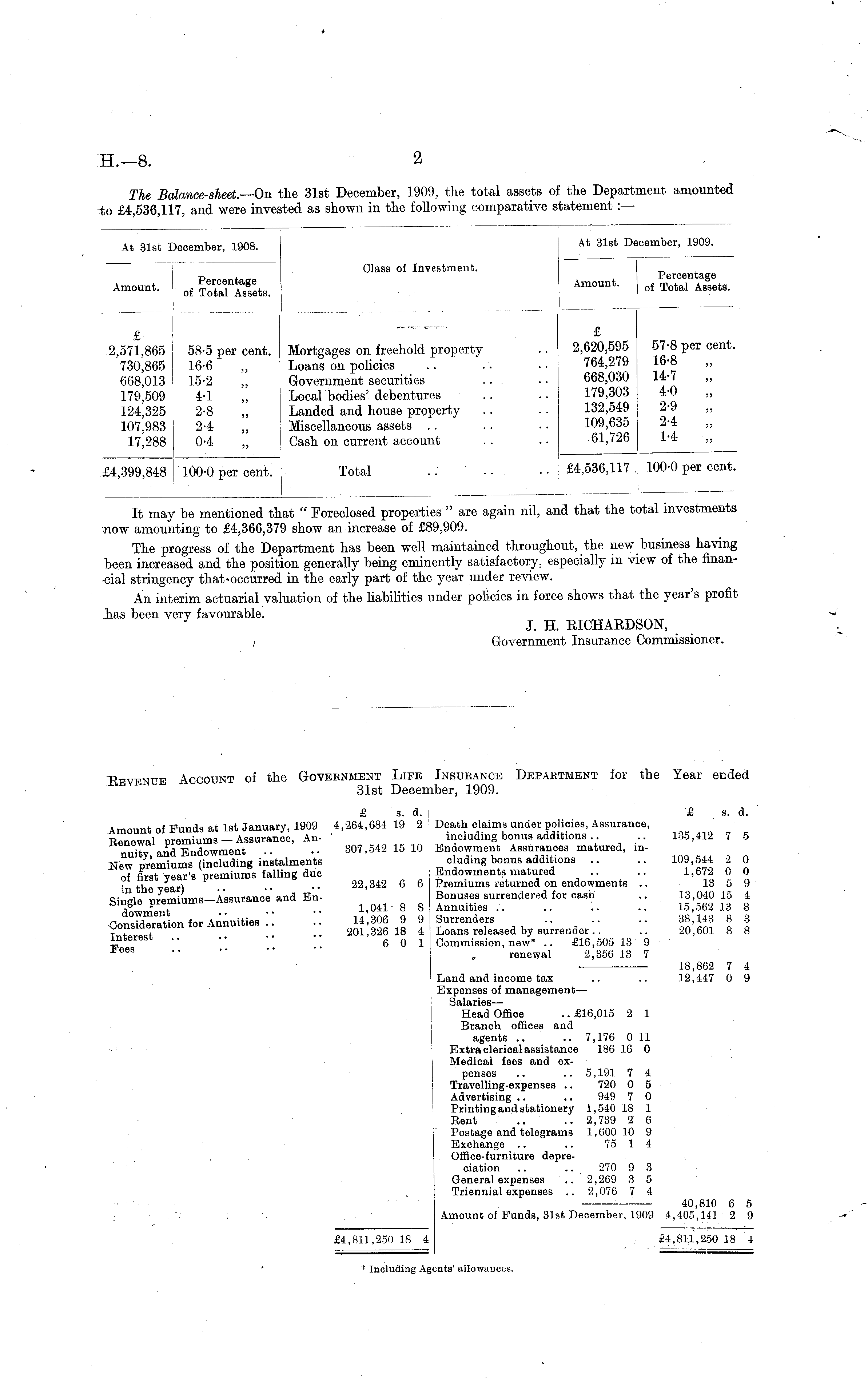 The Balance-sheet— -On the 31st December, 1909, the total assets of the Department amounted to £4,536,117, and were invested as shown in the following comparative statement :—