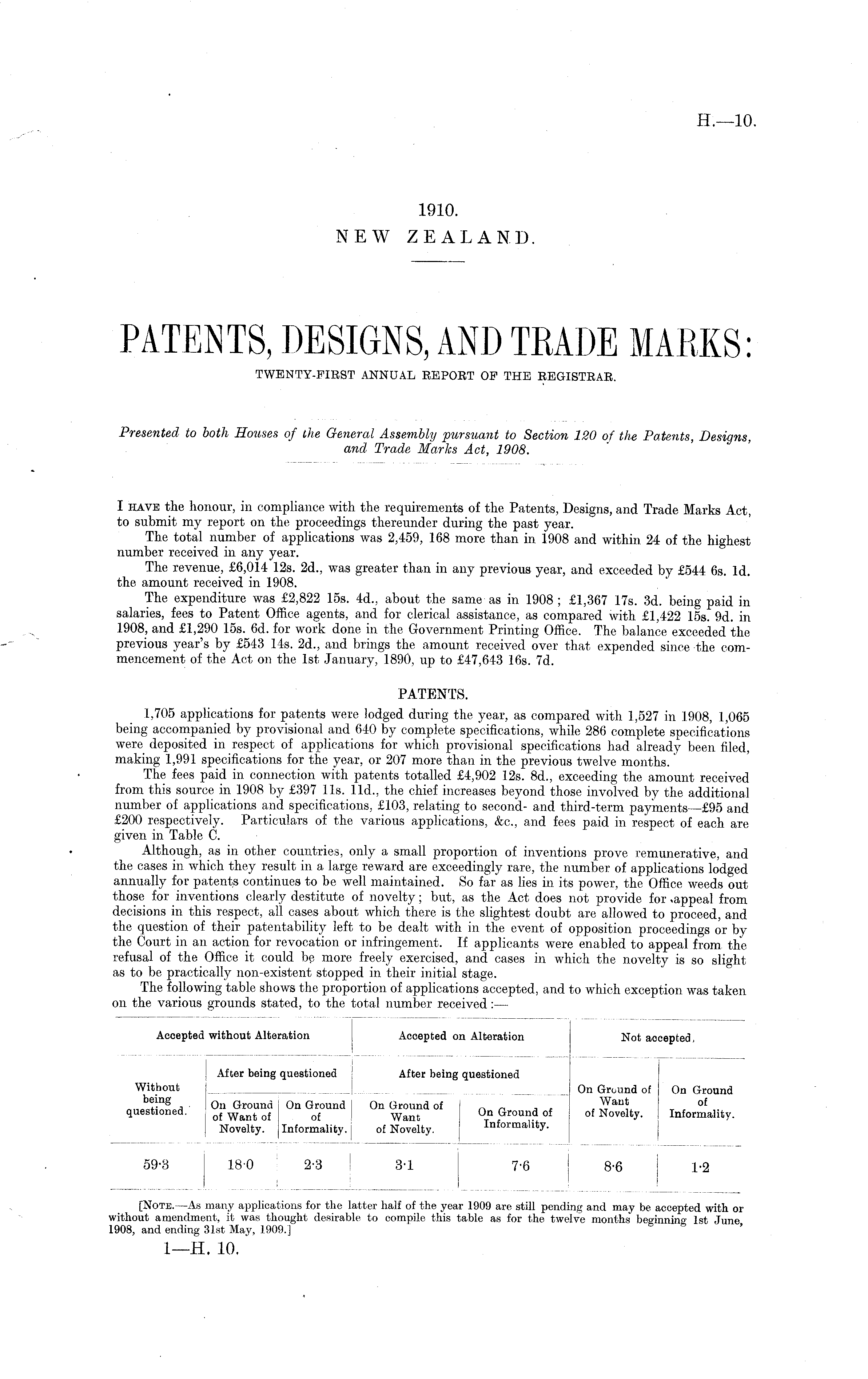 Presented to both Houses of the General Assembly pursuant to Section 120 of the Patents, Designs, and Trade Marks Act, 1908. I have the honour, in compliance with the requirements of the Patents, Designs, and Trade Marks Act, to submit my report on the proceedings thereunder during the past year. The total number of applications was 2,459, 168 more than in 1908 and within 24 of the highest number received in any year. The revenue, £6,014 12s. 2d., was greater than in any previous year, and exceeded by £544 6s. Id. the amount received in 1908. The expenditure was £2,822 15s. 4d., about the same as in 1908 ; £1,367 17s. 3d. being paid in salaries, fees to Patent Office agents, and for clerical assistance, as compared with £1,422 15s. 9d. in 1908, and £1,290 15s. 6d. for work done in the Government Printing Office. The balance exceeded the previous year's by £543 14s. 2d., and brings the amount received over that expended since the commencement of the Act on the Ist January, 1890, up to £47,643 16s. 7d. PATENTS. 1,705 applications for patents were lodged during the year, as compared with 1,527 in 1908, 1,065 being accompanied by provisional and 640 by complete specifications, while 286 complete specifications were deposited in respect of applications for which provisional specifications had already been filed, making 1,991 specifications for the year, or 207 more than in the previous twelve months. The fees paid in connection with patents totalled £4,902 12s. Bd., exceeding the amount received from this source in 1908 by £397 11s. lid., the chief increases beyond those involved by the additional number of applications and specifications, £103, relating to second- and third-term payments —£95 and £200 respectively. Particulars of the various applications, &c, and fees paid in respect of each are given in Table C. Although, as in other countries, only a small proportion of inventions prove remunerative, and the cases in which they result in a large reward are exceedingly rare, the number of applications lodged annually for patents continues to be well maintained. So far as lies in its power, the Office weeds out those for inventions clearly destitute of novelty; but, as the Act does not provide for .appeal from decisions in this respect, all cases about which there is the slightest doubt are allowed to proceed, and the question of their patentability left to be dealt with in the event of opposition proceedings or by the Court in an action for revocation or infringement. If applicants were enabled to appeal from the refusal of the Office it could be more freely exercised, and cases in which the novelty is so slight as to be practically non-existent stopped in their initial stage. The following table shows the proportion of applications accepted, and to which exception was taken on the various grounds stated, to the total number received: —