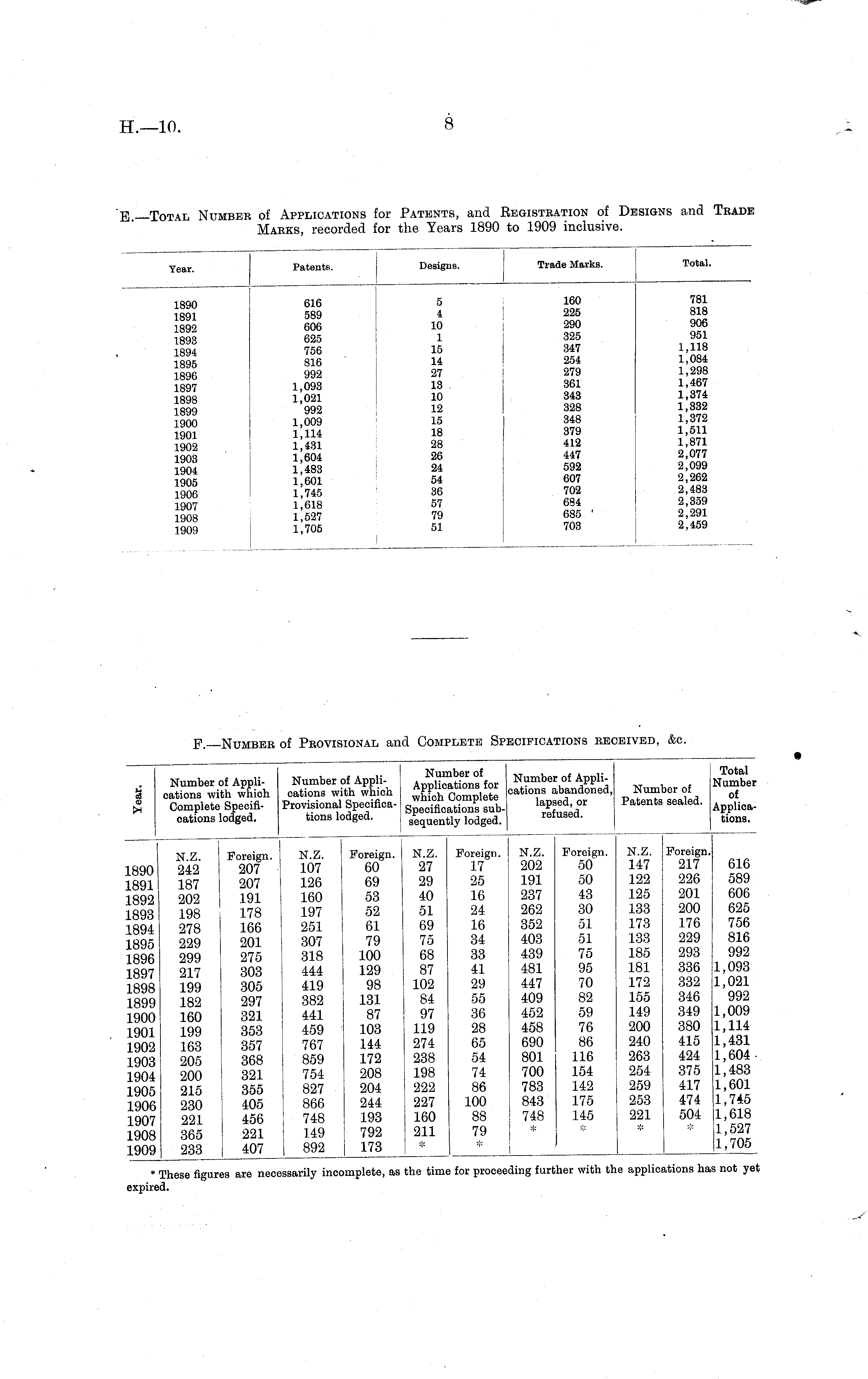 E.—Total Number of Applications for Patents, and Registration of Designs and Trade Marks, recorded for the Years 1890 to 1909 inclusive.