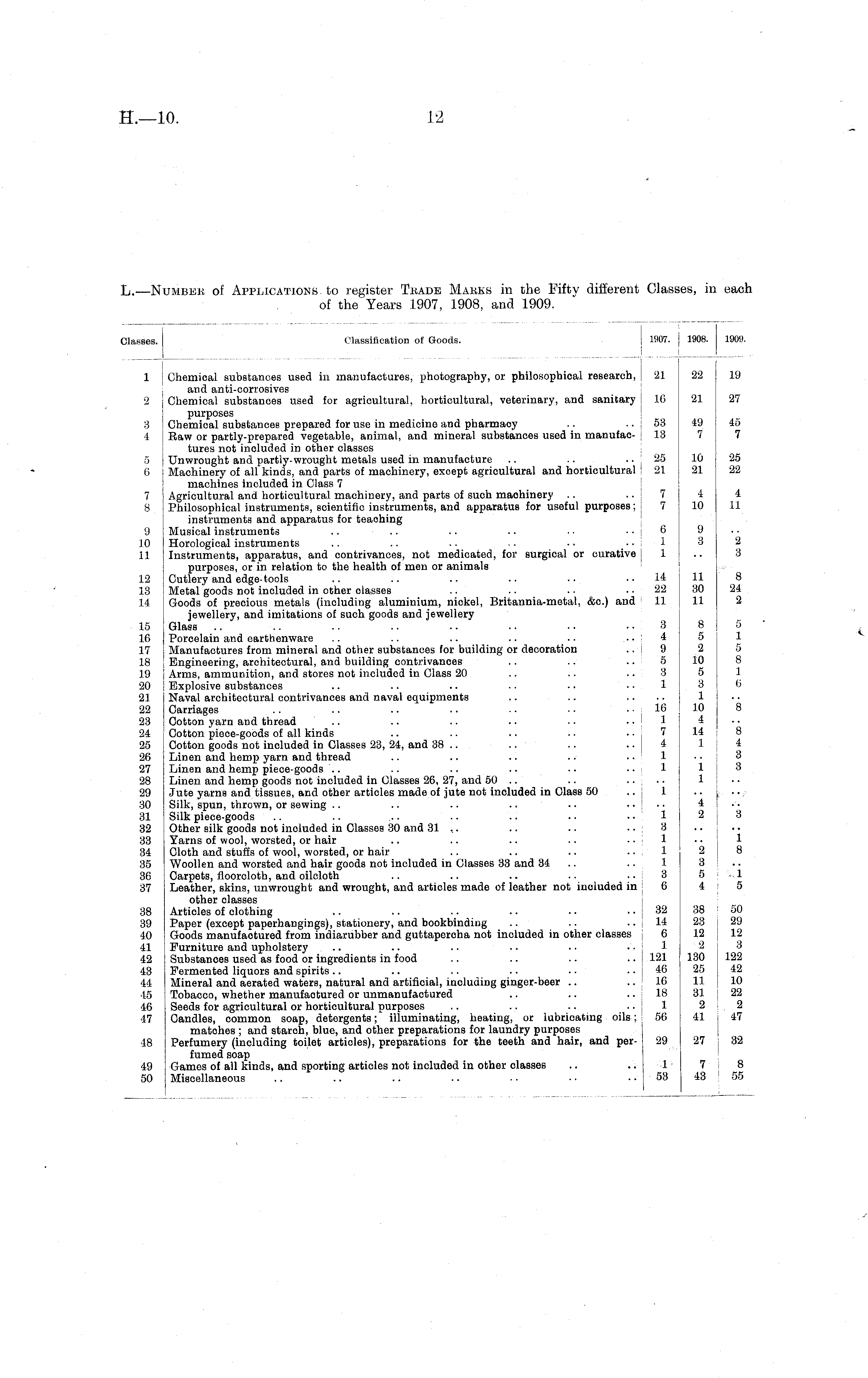 L.—Number of Applications to register Trade Marks in the Fifty different Classes, in each of the Years 1907, 1908, and 1909.