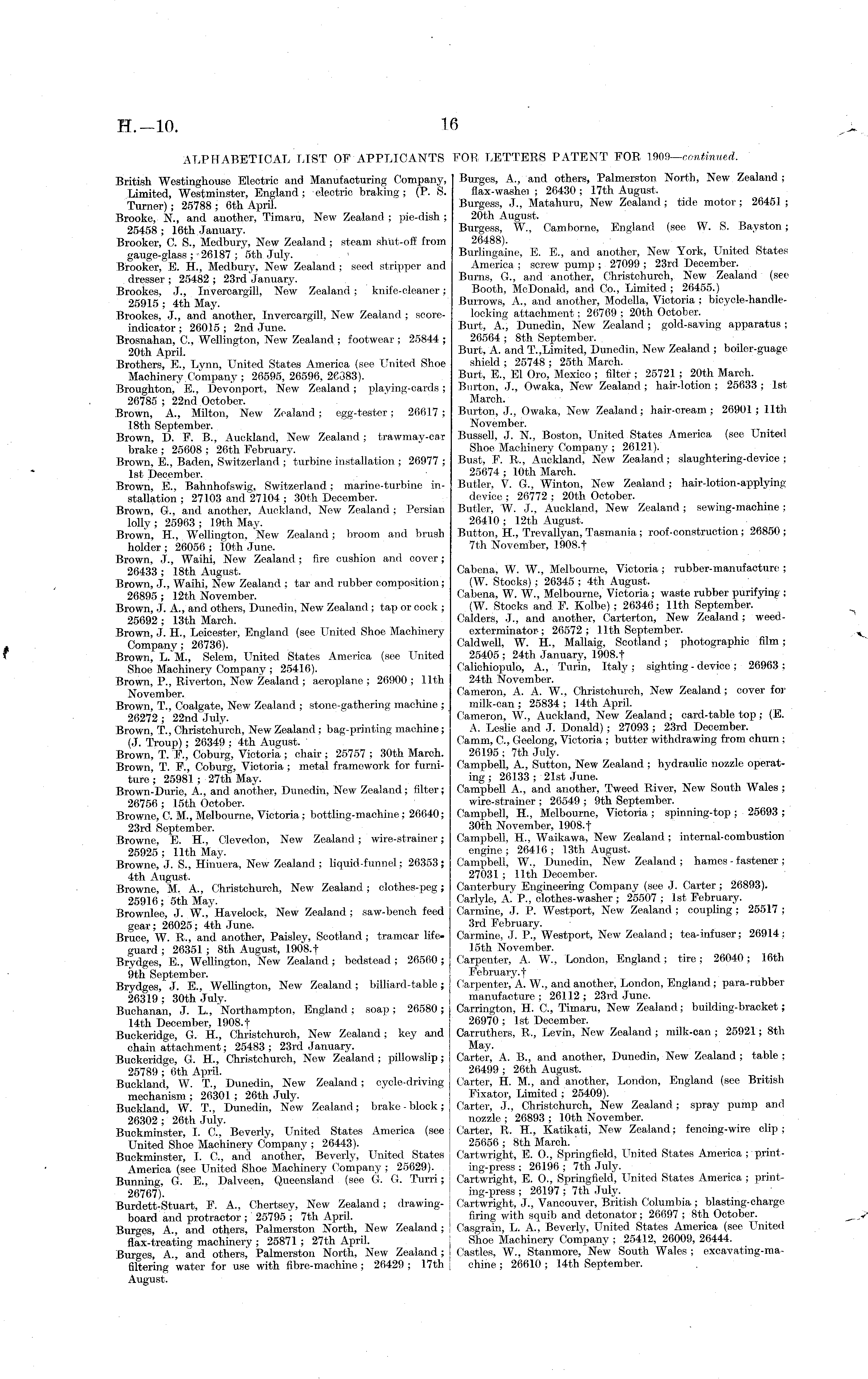 Burges, A., and others, Palmerston North, New Zealand ; flax-washei ; 26430 ; 17th August, Burgess, J., Matahuru, New Zealand ; tide motor ; 26451 ; 20th August, Burgess, W., Camborne, England (see W. S. Bayston ; 26488). Burlingaine, E. E., and another, New York, United States America ; screw pump ; 27099 ; 23rd December. Burns, G., and another, Christchurch, New Zealand (see Booth, McDonald, and Co., Limited ; 26455.) Burrows, A., and another, Modella, Victoria ; bicycle-handle-locking attachment; 26769 ; 20th October. Burt, A., Dunedin, New Zealand ; gold-saving apparatus ; 26564 ; Bth September. Burt, A. and T.,Limited, Dunedin, New Zealand ; boiler-guage shield ; 25748 ; 25th March. Burt, E., El Oro, Mexico ; filter ; 25721 ; 20th March. Burton, J., Owaka, New Zealand ; hair-lotion ; 25633 ; Ist March. Burton, J., Owaka, New Zealand ; hair-cream ; 26901 ; 11th November. Bussell, J. N., Boston, United States America (see United Shoe Machinery Company ; 26121). Bust, F. R., Auckland, New Zealand; slaughtering-device ; 25674 ; 10th March. Butler, V. G., Winton, New Zealand: hair-lotion-applying device ; 26772 ; 20th October. Butler, W. J., Auckland, New Zealand; sewing-machine; 26410 ; 12th August. Button, H., Trevallyan, Tasmania ; roof-construction; 26850 ; 7th November, 1908.t Cabena, W. W., Melbourne, Victoria ; rubber-manufacture ; (W. Stocks) ; 26345 ; 4th August. Cabena, W. W., Melbourne, Victoria; waste rubber purifying ; (W. Stocks and F. Kolbe) ; 26346; 11th September. Calders, J., and another, Carterton, New Zealand; weedexterminator ; 26572; 11th September. Caldwell, W. H., Mallaig, Scotland; photographic film; 25405; 24th January, 1908.t Calichiopulo, A., Turin, Italy; sighting - device; 26963; 24th November. Cameron, A. A. W., Christchurch, New Zealand ; cover for milk-can ; 25834 ; 14th April. Cameron, W., Auckland, New Zealand; card-table top; (E. A. Leslie and J. Donald); 27093 ; 23rd December. Camm, C, Geelong, Victoria ; butter withdrawing from churn ; 26195 ; 7th July. Campbell, A., Sutton, New Zealand ; hydraulic nozzle operating ; 26133 ; 21st June. Campbell A., and another, Tweed River, New South Wales ; wire-strainer ; 26549 ; 9th September. Campbell, H., Melbourne, Victoria ; spinning-top ; 25693 ; 30th November, 1908.f Campbell, H., Waikawa, New Zealand ; internal-combustion engine ; 26416 ; 13th August, Campbell, W., Dunedin, New Zealand ; names - fastener ; 27031 ; 11th December. Canterbury Engineering Company (see J. Carter ; 26893). Cariyle, A. P., clothes-washer; 25507 ; Ist February. Carmine, J. P. Westport, New Zealand ; coupling ; 25517 ; 3rd February. Carmine, J. P., Westport, New Zealand; tea-infuser; 26914; 15th November. Carpenter, A. W., London, England; tire; 26040; 16th February, f Carpenter, A. W., and another, London, England ; para-rubber manufacture; 26112; 23rd June. Carrington, H. C, Timaru, New Zealand; building-bracket; 26970 ; Ist December. Carruthers, R., Levin, New Zealand ; milk-can ; 25921; Bth May. Carter, A. 8., and another, Dunedin, New Zealand ; table ; 26499 ; 26th August. Carter, H. M., and another, London, England (see British Fixator, Limited ; 25409). Carter, J., Christchurch, New Zealand; spray pump and nozzle ; 26893 ; 10th November. Carter, R. H., Katikati, New Zealand; fencing-wire clip; 25656 ; Bth March. ' Cartwright, E. 0., Springfield, United States America ; print-ing-press ; 26196 ; 7th July. Cartwright, E. 0., Springfield, United States America ; print-ing-press ; 26197 ; 7th July. Cartwright, J., Vancouver, British Columbia ; blasting-charge firing with squib and detonator; 26697 ; Bth October. Casgrain, L. A., Beverly, United States America (see United Shoe Machinery Company ; 25412, 26009, 26444. Castles, W., Stanmore, New South Wales ; excavating-ma-chine ; 26610 ; 14th September.