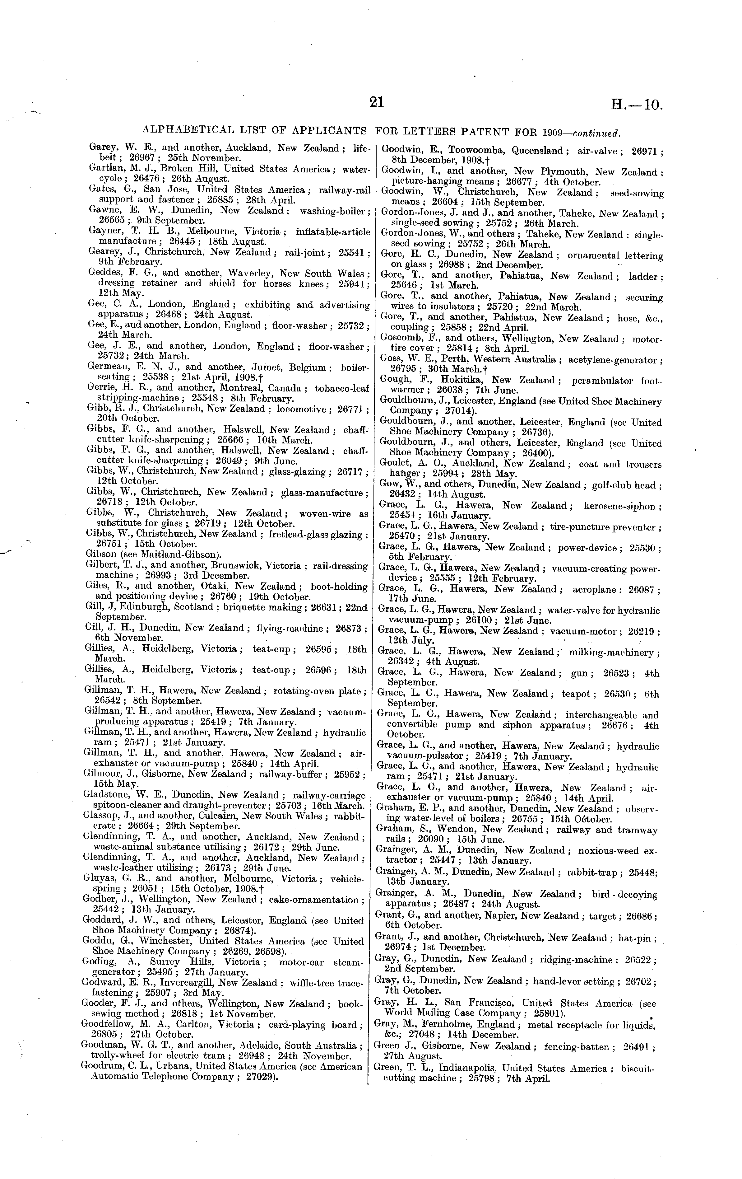 Garey, W. E., and another, Auckland, New Zealand; lifebelt ; 26967 ; 25th November. Gartlan, M. J., Broken Hill, United States America ; watercycle ; 26476; 26th August. Gates, G., San Jose, United States America; railway-rai support and fastener ; 25885 ; 28th April. Gawne, E. W., Dunedin, New Zealand; washing-boiler ■ 26565 ; 9th September. Gayner, T. H. 8., Melbourne, Victoria; inflatable-article manufacture ; 26445 ; 18th August. Gearey, J., Christchurch, New Zealand ; rail-joint; 25541 ; 9th February. Geddes, F. G., and another, Waverley, New South Wales ; dressing retainer and shield for horses knees; 25941; 12th May. Gee, C. A., London, England; exhibiting and advertising apparatus ; 26468 ; 24th August. Gee, E., and another, London, England ; floor-washer ; 25732 ; 24th March. Gee, J. E., and another, London, England ; floor-washer • 25732; 24th March. Germeau, E. N. J., and another, Jumet, Belgium ; boilerseating ; 25538 ; 21st April, 1908. f Gerrie, H. R., and another, Montreal, Canada ; tobacco-leaf stripping-machine ; 25548 ; Bth February. Gibb, R. J., Christchurch, New Zealand ; locomotive ; 26771 ; 20th October. Gibbs, F. G., and another, Halswell, New Zealand; chaffcutter knife-sharpening ; 25666 ; 10th March. Gibbs, F. G., and another, Halswell, New Zealand ; chaffcutter knife-sharpening ; 26049 ; 9th June. Gibbs, W., Christchurch, New Zealand ; glass-glazing ; 26717 ■ 12th October. Gibbs, W., Christchurch, New Zealand ; glass-manufacture ; 26718 ; 12th October. Gibbs, W., Christchurch, New Zealand; woven-wire as substitute for glass ;, 26719 ; 12th October. Gibbs, W., Christchurch, New Zealand ; fretlead-glass glazing ; 26751 ; 15th October. Gibson (see Maitland-Gibson). Gilbert, T. J., and another, Brunswick, Victoria ; rail-dressing machine ; 26993 ; 3rd December. Giles, R., and another, Otaki, New Zealand ; boot-holding and positioning device ; 26760 ; 19th October. Gill, J, Edinburgh, Scotland ; briquette making ; 26631; 22nd September. Gill, J. H., Dunedin, New Zealand ; flying-machine ; 26873 ; 6th November. Gillies, A., Heidelberg, Victoria; teat-cup; 26595; 18th March. Gillies, A., Heidelberg, Victoria; teat-cup; 26596; 18th March. Gillman, T. H., Hawera, New Zealand ; rotating-oven plate ; 26542 ; Bth September. Gillman, T. H., and another, Hawera, New Zealand ; vacuumproducing apparatus ; 25419 ; 7th January. Gillman, T. H., and another, Hawera, New Zealand ; hydraulic ram ; 25471 ; 21st January. Gillman, T. H., and another, Hawera, New Zealand ; airexhauster or vacuum-pump ; 25840 ; 14th April. Gilmour, J., Gisborne, New Zealand ; railway-buffer ; 25952 ; 15th May. Gladstone, W. E., Dunedin, New Zealand ; railway-carriage spitoon-cleaner and draught-preventer; 25703; 16th March. Glassop, J., and another, Culcairn, New South Wales ; rabbitcrate ; 26664 ; 29th September. Glendinning, T. A., and another, Auckland, New Zealand ; waste-animal substance utilising ; 26172 ; 29th June. Glendinning, T. A., and another, Auckland, New Zealand ; waste-leather utilising ; 26173 ; 29th June. Gluyas, G. R., and another, Melbourne. Victoria; vehiclespring ; 26051 ; 15th October, 1908. f Godber, J., Wellington, New Zealand ; cake-ornamentation ; 25442 ; 13th January. Goddard, J. W., and others, Leicester, England (see United Shoe Machinery Company ; 26874). Goddu, G., Winchester, United States America (see United Shoe Machinery Company ; 26269, 26598). Goding, A., Surrey Hills, Victoria; motor-car steamgenerator ; 25495 ; 27th January. Godward, E. R., Invercargill, New Zealand ; wiffle-tree tracefastening ; 25907 ; 3rd May. Gooder, F. J., and others, Wellington, New Zealand ; booksewing method ; 26818 ; Ist November. Goodfellow, M. A., Carlton, Victoria ; card-playing board ; 26805 ; 27th October. Goodman, W. G. T., and another, Adelaide, South Australia ; trolly-wheel for electric tram ; 26948 ; 24th November. Goodrum, C. L., Urbana, United States America (see American Automatic Telephone Company ; 27029).