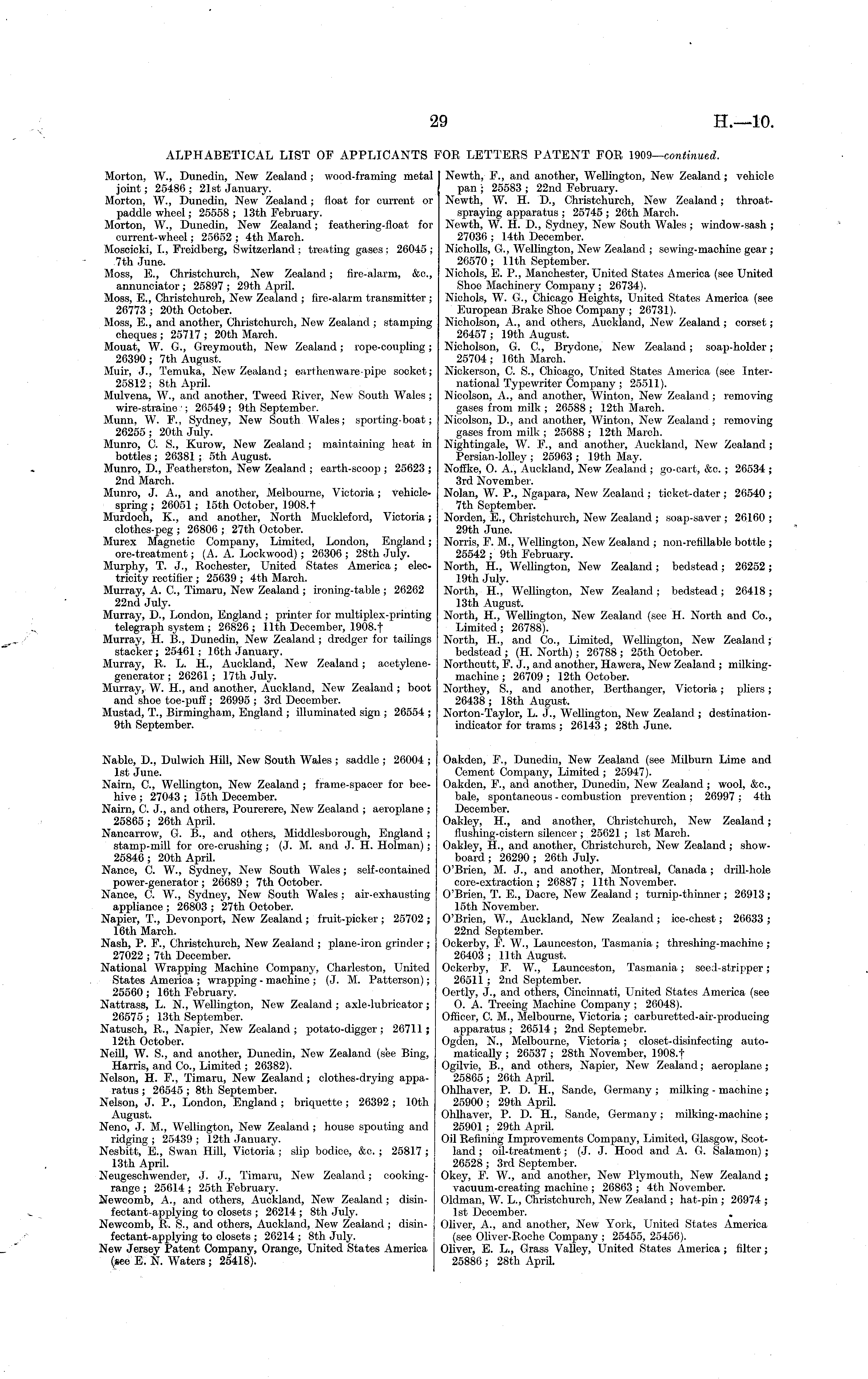 Newth, F., and another, Wellington, New Zealand; vehicle pan ; 25583 ; 22nd February. Newth, W. H. D., Christchurch, New Zealand; throatspraying apparatus ; 25745 ; 26th March. Newth, W. H. D., Sydney, New South Wales ; window-sash ; 27036 ; 14th December. Nicholls, G., Wellington, New Zealand ; sewing-machine gear ; 26570; 11th September. Nichols, E. P., Manchester, United States America (see United Shoe Machinery Company ; 26734). Nichols, W. G., Chicago Heights, United States America (see European Brake Shoe Company ; 26731). Nicholson, A., and others, Auckland, New Zealand ; corset; 26457; 19th August. Nicholson, G. C, Brydone, New Zealand ; soap-holder; 25704 ; 16th March. Nickerson, C. S., Chicago, United States America (see International Typewriter Company; 25511). Nicolson, A., and another, Winton, New Zealand ; removing gases from milk ; 26588 ; 12th March. Nicolson, D., and another, Winton, New Zealand; removing gases from milk ; 25688 ; 12th March. Nightingale, W. F., and another, Auckland, New Zealand ; Persian-lolley ; 25963 ; 19th May. Noffke, 0. A., Auckland, New Zealand ; go-cart, &c. ; 26534 ; 3rd November. Nolan, W. P., Ngapara, New Zealand ; ticket-dater ; 26540 ; 7th September. Norden, E., Christchurch, New Zealand ; soap-saver ; 26160 ; 29th June. Norris, F. M., Wellington, New Zealand ; non-refillable bottle ; 25542 ; 9th February. North, H., Wellington, New Zealand; bedstead; 26252 ; 19th July. North, H., Wellington, New Zealand; bedstead; 26418; 13th August. North, H., Wellington, New Zealand (see H. North and Co., Limited; 26788). North, H., and Co., Limited, Wellington, New Zealand; bedstead ; (H. North); 26788 ; 25th October. Northcutt, F. J., and another, Hawera, New Zealand ; milkingmachine ; 26709 ; 12th October. Northey, S., and another, Berthanger, Victoria; pliers; 26438 ; 18th August. Norton-Taylor, L. J., Wellington, New Zealand; destinationindicator for trams ; 26143 ; 28th June. Oakden, F., Dunedin, New Zealand (see Milburn Lime and Cement Company, Limited ; 25947). Oakden, F., and another, Dunedin, New Zealand ; wool, &c, bale, spontaneous - combustion prevention ; 26997 ; 4th December. Oakley, H., and another, Christchurch, New Zealand; flushing-cistern silencer ; 25621 ; Ist March. Oakley, H., and another, Christchurch, New Zealand; showboard ; 26290 ; 26th July. O'Brien, M. J., and another, Montreal, Canada ; drill-hole core-extraction; 26887; 11th November. O'Brien, T. E., Dacre, New Zealand ; turnip-thinner ; 26913 ; loth November. O'Brien, W., Auckland, New Zealand ; ice-chest; 26633 ; 22nd September. Ockerby, F. W., Launceston, Tasmania ; threshing-machine ; 26403 ; 11th August. Oekerby, F. W., Launceston, Tasmania; seed-stripper; 26511 ; 2nd September. Oertly, J., and others, Cincinnati, United States America (see 0. A. Treeing Machine Company ; 26048). Officer, C. M., Melbourne, Victoria ; carburetted-air-produeing apparatus ; 26514 ; 2nd Septemebr. Ogden, N., Melbourne, Victoria; closet-disinfecting automatically ; 26537 ; 28th November, 1908.f Ogilvie, 8., and others, Napier, New Zealand; aeroplane; 25865; 26th April. Ohlhaver, P. D. H., Sande, Germany ; milking - machine ; 25900 ; 29th April. Ohlhaver, P. D. H., Sande, Germany: milking-machine; 25901 ; 29th April. Oil Refining Improvements Company, Limited, Glasgow, Scotland ; oil-treatment; (J. J. Hood and A. G. Salamon) ; 26528 ; 3rd September. Okey, F. W., and another. New Plymouth, New Zealand; vacuum-creating machine ; 26863 ; 4th November. Oldman, W. L., Christchurch, New Zealand ; hat-pin ; 26974 ; Ist December. Oliver, A., and another, New York, United States America (see Oliver-Roche Company ; 25455, 25456). Oliver, E. L., Grass Valley, United States America; filter; 25886; 28th April.