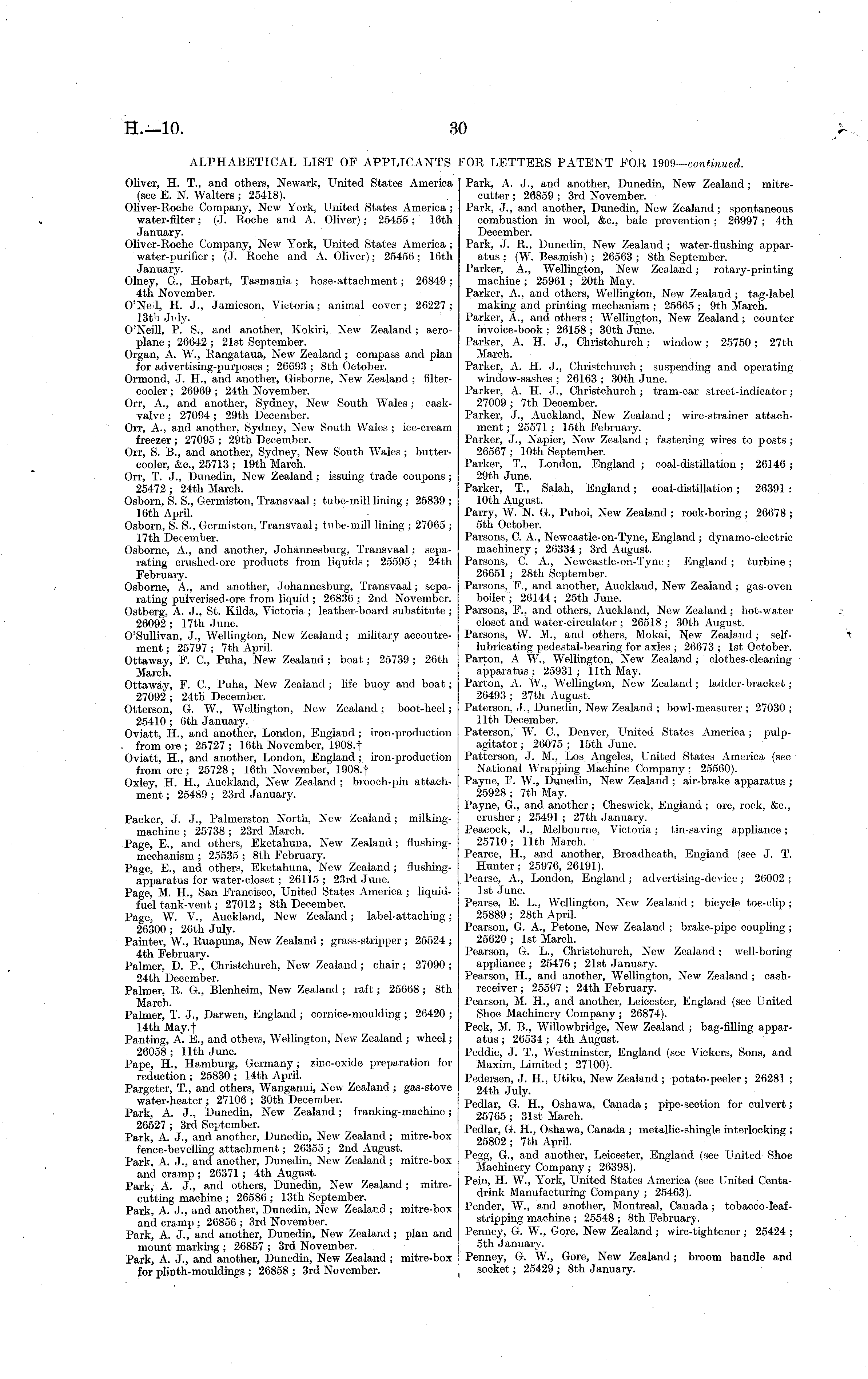 Oliver, H. T., and others, Newark, United States America (see E. N. Walters ; 25418). Oliver-Roche Company, New York, United States America ; water-filter; (J. Roche and A. Oliver); 25455; 16th January. Oliver-Roche Company, New York, United States America ; water-purifier; (J. Roche and A. Oliver); 25456; 16th January. Olney, G., Hobart, Tasmania; hose-attachment; 26849 ; 4th November. O'Nel, H. J., Jamieson, Victoria; animal cover; 26227; 13th Jidy. O'Neill, P. S., and another, Kokiri, New Zealand; aeroplane ; 26642 ; 21st September. Organ, A. W., Rangataua, New Zealand ; compass and plan for advertising-purposes ; 26693 ; Bth October. Ormond, J. H., and another, Gisborne, New Zealand ; filtercooler ; 26969 ; 24th November. Orr, A., and another, Sydney, New South Wales; caskvalve ; 27094 ; 29th December. Orr, A., and another, Sydney, New South Wales ; ice-cream freezer ; 27095 ; 29th December. Orr, S. 8., and another, Sydne3', New South Wales ; buttercooler, &c, 25713 ; 19th March. Orr, T. J., Dunedin, New Zealand ; issuing trade coupons ; 25472 ; 24th March. Osborn, S. S., Germiston, Transvaal; tube-mill lining ; 25839 ; 16th April. Osborn, S. S., Germiston, Transvaal; tube-mill lining ; 27065 ; 17th December. Osborne, A., and another, Johannesburg, Transvaal; separating crushed-ore products from liquids ; 25595 ; 24th February. Osborne, A., and another, Johannesburg, Transvaal; separating pulverised-ore from liquid ; 26836 ; 2nd November. Ostberg, A. J., St. Kilda, Victoria ; leather-board substitute ; 26092 ; 17th June. O'Sullivan, J., Wellington, New Zealand ; military accoutrement ; 25797 ; 7th April. Ottaway, F. C, Puha, New Zealand ; boat; 25739 ; 26th March. Ottaway, F. C, Puha, New Zealand ; life buoy and boat; 27092 ; 24th December. Otterson, G. W., Wellington, New Zealand ; boot-heel; 25410 ; 6th January. Oviatt, H., and another, London, England; iron-production from ore ; 25727 ; 16th November, 1908-t Oviatt, H., and another, London, England ; iron-production from ore ; 25728 ; 16th November, 1908. f Oxley, H. H., Auckland, New Zealand ; brooch-pin attachment ; 25489 ; 23rd January. Packer, J. J., Palmerston North, New Zealand; milkingmachine ; 25738 ; 23rd March. Page, E., and others, Eketahuna, New Zealand.; flushingmechanism ; 25535 ; Bth February. Page, E., and others, Eketahuna, New Zealand; flushingapparatus for water-closet; 26115 ; 23rd June. Page, M. H., San Francisco, United States America ; liquidfuel tank-vent; 27012 ; Bth December. Page, W. V., Auckland, New Zealand; label-attaching; 26300 ; 26th July. Painter, W., Ruapuna, New Zealand ; grass-stripper ; 25524 ; 4th February. Palmer, D. P., Christchurch, New Zealand ; chair ; 27090 ; 24th December. Palmer, R. G., Blenheim, New Zealand; raft; 25668; Bth March. Palmer, T. J., Darwen, England; cornice-moulding; 26420; 14th May.f Panting, A. E., and others, Wellington, New Zealand ; wheel; 26058; 11th June. Pape, H., Hamburg, Germany ; zinc-oxide preparation for reduction ; 25830 ; 14th April. Pargeter, T., and others, Wanganui, New Zealand ; gas-stove water-heater ; 27106 ; 30th December. Park, A. J., Dunedin, New Zealand ; franking-machine; 26527 ; 3rd September. Park, A. J., and another, Dunedin, New Zealand ; mitre-box fence-bevelling attachment; 26355 ; 2nd August. Park, A. J., and another, Dunedin, New Zealand ; mitre-box and cramp ; 26371 ; 4th August. Park, A. J., and others, Dunedin, New Zealand; mitrecutting machine ; 26586 ; 13th September. Park, A. J., and another, Dunedin, New Zealand ; mitre-box and cramp ; 26856 ; 3rd November. Park, A. J., and another, Dunedin, New Zealand ; plan and mount marking ; 26857 ; 3rd November. Park, A. J., and another, Dunedin, New Zealand; mitre-box for plinth-mouldings ; 26858 ; 3rd November.