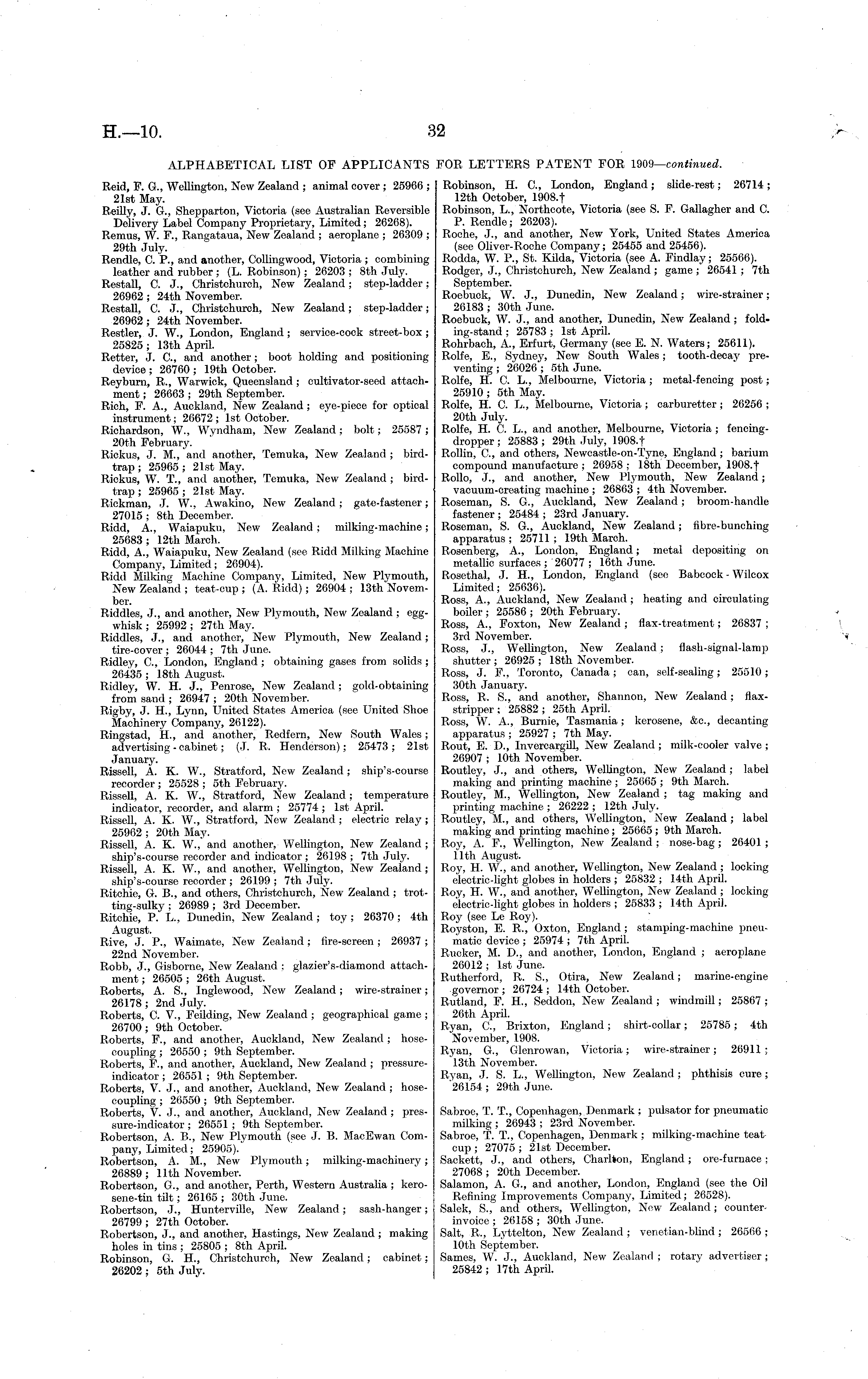 Robinson, H. C, London, England; slide-rest; 26714; 12th October, 1908.t Robinson, L., Northcote, Victoria (see S. F. Gallagher and C. P. Rendle; 26203). Roche, J., and another, New York, United States America (see Oliver-Roche Company; 25455 and 25456). Rodda, W. P., St. Kilda, Victoria (see A. Findlay; 25566). Rodger, J., Christchurch, New Zealand ; game ; 26541 ; 7th September. Roebuck, W. J., Dunedin, New Zealand; wire-strainer; 26183 ; 30th June. Roebuck, W. J., and another, Dunedin, New Zealand; fold-ing-stand ; 25783 ; Ist April. Rohrbach, A., Erfurt, Germany (see E. N. Waters; 25611). Rolfe, E., Sydney, New South Wales; tooth-decay preventing ; 26026 ; sth June. Rolfe, H. C. L., Melbourne, Victoria; metal-fencing post; 25910 ; sth May. Rolfe, H. C. L., Melbourne, Victoria ; carburetter ; 26256 ; 20th July. Rolfe, H. 0. L., and another, Melbourne, Victoria ; fencingdropper ; 25883 ; 29th July, 1908. t Rollin, C, and others, Newcastle-on-Tyne, England ; barium compound manufacture ; 26958 ; 18th December, 1908.f Rollo, J., and another, New Plymouth, New Zealand; vacuum-creating machine ; 26863 ; 4th November. Roseman, S. G., Auckland, New Zealand; broom-handle fastener ; 25484 ; 23rd January. Roseman, S. G., Auckland, New Zealand; fibre-bunching apparatus ; 25711 ; 19th March. Rosenberg, A., London, England; metal depositing on metallic surfaces ; 26077 ; 16th June. Rosethal, J. H., London, England (see Babcock - Wiloox Limited; 25636). Ross, A., Auckland, New Zealand ; heating and circulating boiler ; 25586 ; 20th February. Ross, A., Foxton, New Zealand ; flax-treatment; 26837 ; 3rd November. Ross, J., Wellington, New Zealand ; flash-signal-lamp shutter ; 26925 ; 18th November. Ross, J. F., Toronto, Canada; can, self-sealing; 25510; 30th January. Ross, R. S., and another, Shannon, New Zealand ; flaxstripper : 25882 ; 25th April. Ross, W. A., Burnie, Tasmania; kerosene, &c, decanting apparatus ; 25927 ; 7th May. Rout, E. D., Invercargill, New Zealand ; milk-cooler valve ; 26907 ; 10th November. Routley, J., and others, Wellington, New Zealand; label making and printing machine ; 25665 ; 9th March. Routley, M., Wellington, New Zealand ; tag making and printing machine ; 26222 ; 12th July. Routley, M., and others, Wellington, New Zealand; label making and printing machine; 25665 ; 9th March. Roy, A. F., Wellington, New Zealand ; nose-bag ; 26401 ; 11th August. Roy, H. W., and another, Wellington, New Zealand ; locking electric-light globes in holders ; 25832 ; 14th April. Roy, H. W., and another, Wellington, New Zealand ; locking electric-light globes in holders ; 25833 ; 14th April. Roy (see Le Roy). Royston, E. R., Oxton, England ; stamping-machine pneumatic device ; 25974 ; 7th April. Rucker, M. D., and another, London, England ; aeroplane 26012 ; Ist June. Rutherford, R. S., Otira, New Zealand ; marine-engine governor ; 26724 ; 14th October. Rutland, F. H., Seddon, New Zealand ; windmill; 25867 ; 26th April. Ryan, C, Brixton, England ; shirt-collar; 25785; 4th November, 1908. Ryan, G., Glenrowan, Victoria; wire-strainer; 26911; 13th November. Ryan, J. S. L., Wellington, New Zealand; phthisis cure; 26154 ; 29th June. Sabroe, T. T., Copenhagen, Denmark ; pulsator for pneumatic milking ; 26943 ; 23rd November. Sabroe, T. T., Copenhagen, Denmark ; milking-machine teat cup ; 27075 ; 21st December. Sackett, J., and others, Charlton, England; ore-furnace; 27068 ; 20th December. Salamon, A. G., and another, London, England (see the Oil Refining Improvements Company, Limited; 26528). Salek, S., and others, Wellington, New Zealand; counterinvoice ; 26158 ; 30th June. Salt, R., Lyttelton, New Zealand ; venetian-blind ; 26566 : 10th September. Sames, W. J., Auckland, New Zealand ; rotary advertiser ; 25842 ; 17th April,