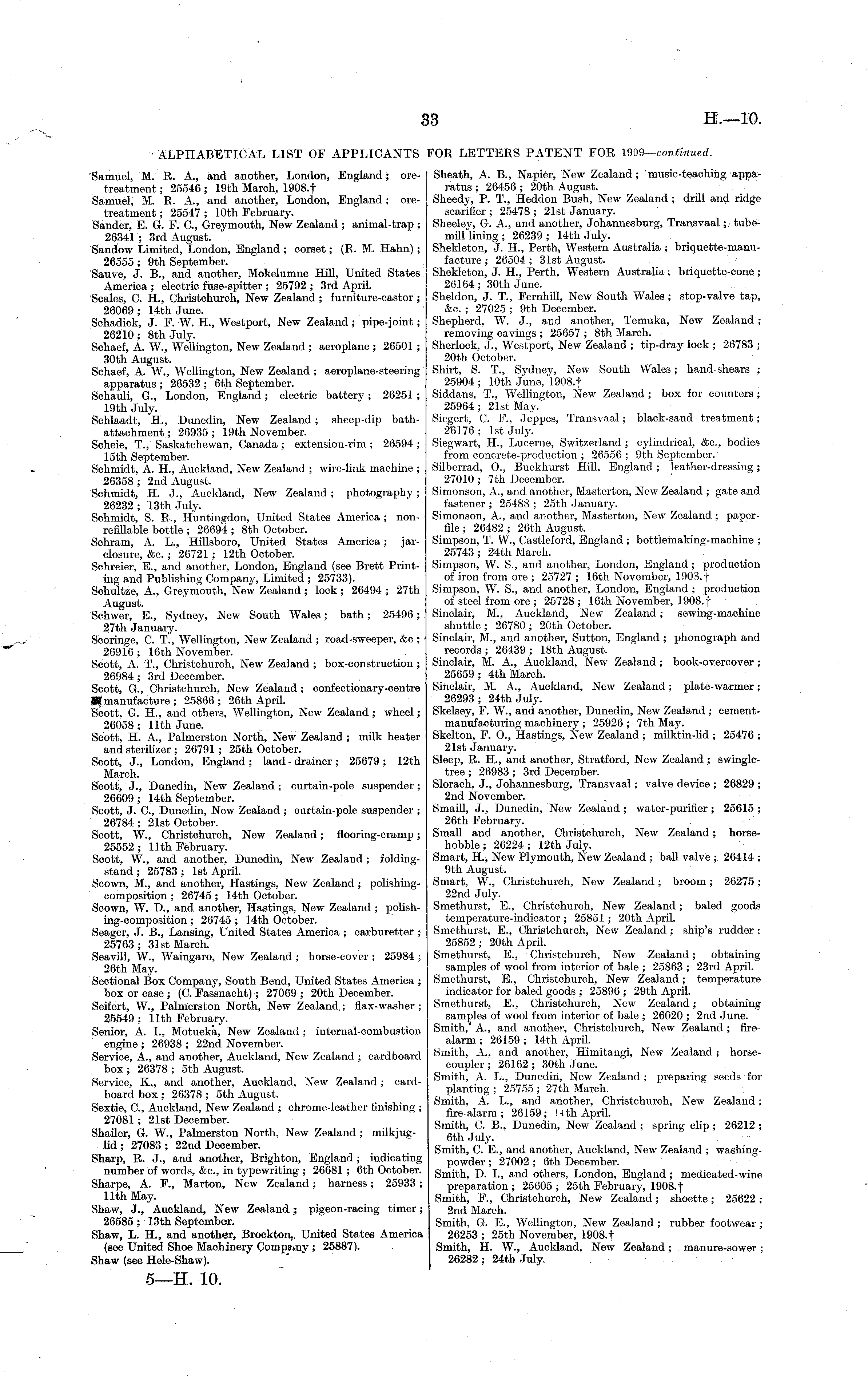 Sheath, A. 8., Napier, New Zealand; music-teaching apparatus ; 26456 ; 20th August. Sheedy, P. T., Heddon Bush, New Zealand ; drill and ridge scarifier ; 25478 ; 21st January. Sheeley, G. A., and another, Johannesburg, Transvaal;. tubemill lining ; 26239; 14th July. Shekleton, J. H., Perth, Western Australia ; briquette-manu-facture ; 26504 ; 31st August. Shekleton, J. H., Perth. Western Australia; briquette-cone ; 26164 ; 30th June. Sheldon, J. T., Fernhill, New South Wales; stop-valve tap, &c. ; 27025 ; 9th December. Shepherd, W. J., and another, Temuka, New Zealand ; removing cavings ; 25657 ; Bth March. Sherlock, J., Westport, New Zealand ; tip-dray lock ; 26783 ; 20th October. Shirt, S. T., Sydney, New South Wales; hand-shears ; 25904 ; 10th June, 1908.t Siddans, T., Wellington, New Zealand; box for counters ; 25964 ; 21st May. Siegert, C. F., Jeppes, Transvaal; black-sand treatment; 28176 ; Ist July. Siegwart, H., Lucerne, Switzerland ; cylindrical, &c, bodies from concrete-production ; 26556 ; 9th September. Silberrad, 0., Buckhurst Hill, England; leather-dressing; 27010 ; 7th December. Simonson, A., and another, Masterton, New Zealand ; gate and fastener ; 25488 ; 25th January. Simonson, A., and another, Masterton, New Zealand.; paperfile ; 26482 ; 26th August. Simpson, T. W., Castleford, England ; bottlemaking-machine ; 25743 ; 24th March. Simpson, W. S., and another, London, England ; production of iron from ore ; 25727 ; 16th November, 1903. f Simpson, W. S., and another, London, England ; production of steel from ore ; 25728 ; 16th November, 1908. f Sinclair, M., Auckland, New Zealand; sewing-machine shuttle ; 26780 ; 20th October. Sinclair, M., and another, Sutton, Engla,nd ; phonograph and records ; 26439 ; 18th August. Sinclair, M. A., Auckland, New Zealand ; book-overcover ; 25659 ; 4th March. Sinclair, M. A., Auckland, New Zealand; plate-warmer; 26293; 24th July. Skelsey, F. W., and another, .Dunedin, New Zealand ; cementmanufacturing machinery ; 25926 ; 7th May. Skelton, F. 0., Hastings, New Zealand ; milktin-lid ; 25476 ; 21st January. Sleep, R. H., and another, Stratford, New Zealand ; swingletree ; 26983 ; 3rd December. Slorach, J., Johannesburg, Transvaal; valve device ; 26829 ; 2nd November. Sinaill, J., Dunedin, New Zealand ; water-purifier ; 25615 ; 26th February. Small and another, Christchurch, New Zealand; horsehobble; 26224; 12th July. Smart, H., New Plymouth, New Zealand ; ball valve ; 26414 ; 9th August. Smart, W., Christehurch, New Zealand ; broom ; 26275 ; 22nd July. Smethurst, E., Christchurch, New Zealand; baled goods temperature-indicator ; 25851 ; 20th April. Smethurst, E., Christchurch, New Zealand ; ship's rudder ; 25852; 20th April. Smethurst, E., Christohurch, New Zealand; obtaining samples of wool from interior of bale ; 25863 ; 23rd April. Smethurst, E., Christchurch, New Zealand; temperature indicator for baled goods ; 25896 ; 29th April. Smethurst, E., Christchurch, New Zealand; obtaining samples of wool from interior of bale ; 26020 ; 2nd June. Smith," A., and another, Christchurch, New Zealand ; firealarm ; 26159 ; 14th April. Smith, A., and. another, Himitangi, New Zealand; horsecoupler ; 26162 ; 30th June. Smith, A. L., Dunedin, New Zealand ; preparing seeds for planting ; 25755 ; 27th March. Smith, A. L., and another, Christchuroh, New Zealand: fire-alarm; 26159; I ith April. Smith, C. 8., Dunedin, New Zealand ; spring clip ; 26212 ; 6th July. Smith, C. E., and another, Auckland, New Zealand ; washingpowder ; 27002 ; 6th December. Smith, D. 1., and others, London, England ; medicated-wine preparation ; 25605 ; 25th February, 1908. f Smith, F., Christchurch, New Zealand; shoette: 25622 ; 2nd March. Smith, G. E., Wellington, New Zealand; rubber footwear; 26253 ; 25th November, 1908. t Smith, H. W., Auckland, New Zealand; manure-sower; 26282; 24tb July.