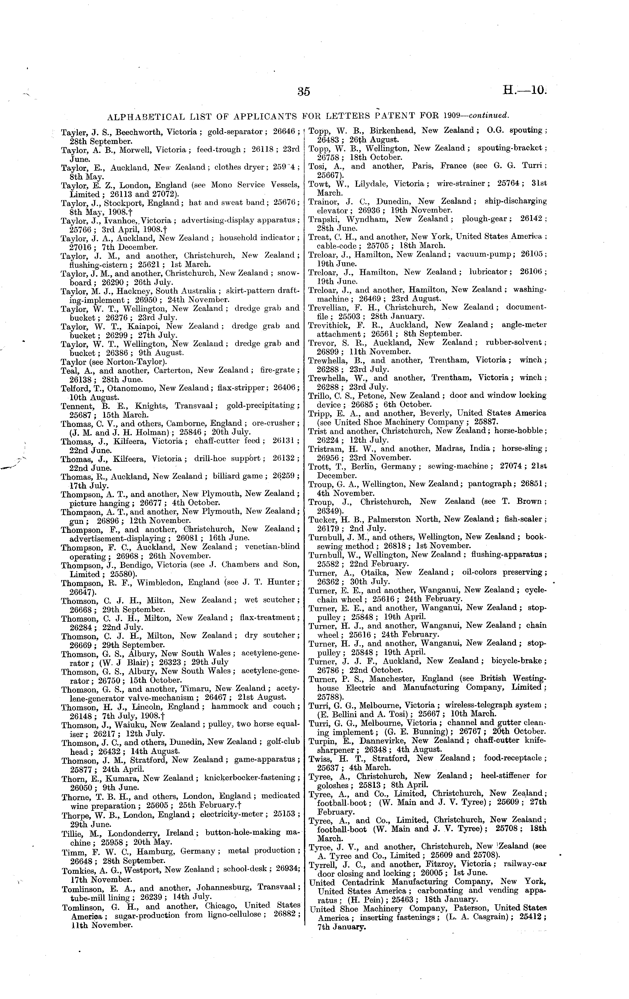 Tayler, J. S., Beech worth, Victoria : gold-separator ; 26646 ; 28th September. Taylor, A. 8., Morwell, Victoria; feed-trough; 26118; 23rd June. Taylor, E., Auckland, New Zealand; clothes dryer; 259 "4; Bth May. Taylor, E. Z., London, England (see Mono Service Vessels, Limited ; 26113 and 27072). Taylor, J., Stockport, England; hat and sweat band; 25676; Bth May, 1908. f Taylor, J., Ivanhoe,,Victoria ; advertising-display apparatus ; 25766 ; 3rd April, 1908. t Taylor, J. A., Auckland, New Zealand ; household indicator ; 27016 ; 7th December. Taylor, J. M., and another, Christchurch, New Zealand; flushing-cistern ; 25621 ; Ist March. Taylor, J. M., and another, Christchurch, New Zealand ; snowboard ; 26290 ; 26th July. Taylor, M. J., Hackney, South Australia ; skirt-pattern draft-ing-implement ; 26950 ; 24th November. Taylor, W. T., Wellington, New Zealand ; dredge grab and bucket; 26276 ; 23rd July. Taylor, W. T., Kaiapoi, New Zealand ; dredge grab and bucket; 26299 ; 27th July. Taylor, W. T., Wellington, New Zealand ; dredge grab and bucket; 26386 ; 9th August. Taylor (see Norton-Taylor). Teal, A., and another, Carterton, New Zealand ; fire-grate ; 26138 ; 28th June. Telford, T., Otanomomo, New Zealand; flax-stripper; 26406; 10th August. Tennent, B. E., Knights, Transvaal; gold-precipitating; 25687 ; 15th March. Thomas, C. V., and others, Camborne, England ; ore-crusher ; (J. M. and J. H. Holman); 25846 ; 20th July. Thomas, J., Kilfeera, Victoria ; chaff-cutter feed ; 26131 ; 22nd June. Thomas, J., Kilfeera, Victoria ; drill-hoe support; 26132 ; 22nd June. Thomas, R., Auckland, New Zealand ; billiard game ; 26259 ; 17th July. Thompson, A. T., and another, New Plymouth, New Zealand ; picture hanging ; 26677 ; 4th October. Thompson, A. T., and another, New Plymouth, New Zealand; gun ; 26896 ; 12th November. Thompson, F., and another, Ohristchurch, New Zealand; advertisement-displaying ; 26081 ; 16th June. Thompson, F. C, Auckland, New Zealand ; venetian-blind operating ; 26968 ; 26th November. Thompson, J., Bendigo, Victoria (see J. Chambers and Son, Limited; 25580). Thompson, R. F., Wimbledon, England (see J. T. Hunter; 26647). Thomson, C. J. H., Milton, New Zealand; wet scutcher; 26668 ; 29th September. Thomson, C. J. H., Milton, New Zealand ; flax-treatment; 26284 ; 22nd July. Thomson, C. J. H., Milton, New Zealand; dry scutcher; 26669; 29th September. Thomson, G. 8., Albury, New South Wales ; acetylene-gene-rator ; (W. J Blair); 26323 ; 29th July Thomson, G. S., Albury, New South Wales ; acetylene-gene-rator ; 26750 ; 15th October. Thomson, G. S., and another, Timaru, New Zealand; acety-lene-generator valve-mechanism ; 26467 ; 21st August. Thomson, H. J., Lincoln, England ; hammock and couch ; 26148 ; 7th July, 1908. f Thomson, J., Waiuku, New Zealand ; pulley, two horse equaliser ; 26217 ; 12th July. Thomson, J. C, and others, Dunedin, New Zealand ; golf-club head; 26432; 14th August. Thomson, J. M., Stratford, New Zealand ; game-apparatus ; 25877 ; 24th April. Thorn, E., Kumara, New Zealand ; knickerbocker-fastening ; 26050; 9th June. Thorne, T. B. H., and others, London, England ; medicated wine preparation ; 25605 ; 25th February, f Thorpe, W. 8., London, England ; electricity-meter ; 25153 ; 29th June. Tillie, M., Londonderry, Ireland; button-hole-making machine ; 25958 ; 20th May. Timm, F. W. C, Hamburg, Germany ; metal production ; 26648; 28th September. Tomkies, A. G., Westport, New Zealand ; school-desk ; 26934; 17th November. Tomlinson, E. A., and another, Johannesburg, Transvaal; tube-mill lining ; 26239 ; 14th July. Tomlinson, G. H., and another, Chicago, United States America ; sugar-production from ligno-cellulose ; 26882 ; 11th November.