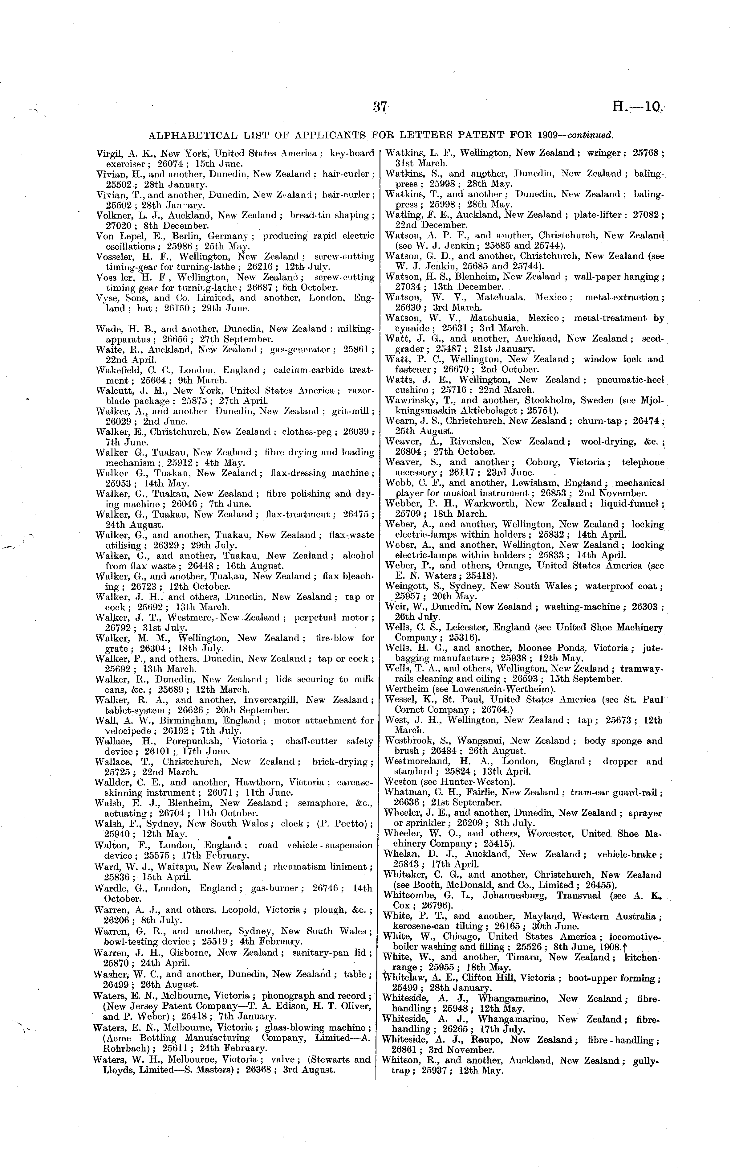 Watkins, L. F., Wellington, New Zealand; wringer; 25768 ; 31st March. Watkins, S., and another, Dunedin, New Zealand ; balingpress ; 25998 ; 28th May. Watkins, T., and another ; Dunedio, New Zealand ; balingpress ; 25998 ; 28th May. Watling, F. E., Auckland, New Zealand ; plate-lifter ; 27082 ; 22nd December. Watson, A. P. F., and another, Christchurch, New Zealand (see W. J. Jenkin; 25685 and 25744). Watson, G. D., and another, Christchni-oh, New Zealand (see W. J. Jenkin, 25685 and 25744). Watson, H. S., Blenheim, New Zealand ; wall-paper hanging ; 27034; 13th December. Watson, W. V., Matohuala, Mexico: metal'extraction; 25630 ; 3rd March. Watson, W. V., Matehuala, Mexico; metal-treatment by cyanide ; 25631 ; 3rd March. Watt, J. G. s and another, Auckland, Now Zealand ; seedgrader ; 25487 ; 21st January. Watt, P. C, Wellington, New Zealand ; window lock and fastener ; 26670 ; 2nd October. Watts, J. E., Wellington, New Zealand; pneumatic-heel cushion ; 25716 ; 22nd March. Wawrinsky, T-, and another, Stockholm, Sweden (see Mjolkningsmaskin Aktiebolaget; 25751). Wearn, J. S., Christchurch, New Zealand ; churn-tap ; 26474 ; 25th August. Weaver, A., Eiverslea, New Zealand; wool-drying, &c. ; 26804 ; 27th October. Weaver, S., and another; Ooburg, Victoria; telephone accessory ; 26117 ; 23rd June. Webb, C. F., and another, Lewisham, England; mechanical player for musical instrument; 26853 ; 2nd November. Webber, P. H., Warkworth, Now Zealand; liquid-funnel; 25709 ; 18th March. Weber, A., and another, Wellington, New Zealand; locking electric-lamps within holders ; 25832 ; 14th April. Weber, A., and another, Wellington, New Zealand ; locking electric-lamps within holders ; 25833 ; 14th April. Weber, P., and others, Orange, United States America (see E. N. Waters; 25418). Weingott, S., Sydney, New South Wales ; waterproof coat: 25957 ; 20th May. Weir, W., Dunedin, New Zealand ; washing-machine ; 26303 ; 26th July. Wells, C. S., Leicester, England (see United Shoe Machinery Company; 25316). Wells, H. G., and another, Moonee Ponds, Victoria; jutebagging manufacture ; 25938 ; 12th May. Wells, T. A., and others, Wellington, New Zealand ; tramwayrails cleaning and oiling ; 26593 ; 15th September. Wertheim (see Lowenstein-Wertheim). Wessel, X., St. Paul, United States America (see St. Paul Cornet Company ; 26764.) West, J. H., Wellington, New Zealand ; tap ; 25673 ; 12th March. Westbrook, S., Wanganui, New Zealand.; body sponge and brash ; 26484 ; 26th August. Westmoreland, H. A., London, England; dropper and standard ; 25824 ; 13th April. Weston (see Hunter-Weston). Whatman, C. H., Fairlie, New Zealand ; tram-car guard-rail; 26636 ; 21st September. Wheeler, J. E., and another, Dunedin, New Zealand ; sprayer or sprinkler ; 26209 ; Bth July. Wheeler, W. 0., and others, Worcester, United Shoe Machinery Company ; 25415). Whelan, D. J., Auckland, New Zealand; vehicle-brake; 25843; 17th April. Whitaker, C. G., and another, Christchurch, New Zealand (see Booth, McDonald, and Co., Limited ; 26455). Whitcombe, G. L., Johannesburg, Transvaal (see A. K. Cox; 26796). White, P. T., and another, Mayland, Western Australia; kerosene-can tilting ; 26165 ; 30th June. White, W., Chicago, United States America; locomotiveboiler washing and filling ; 25526 ; Bth June, 1908.f White, W., and another, Timaru, New Zealand; kitchenrange ; 25955 ; 18th May. Whitelaw, A. E., Clifton Hill, Victoria ; boot-upper forming ; 25499; 28th January. Whiteside, A. J., Whangamarino, New Zealand; fibrehandling; 25948; 12th May. Whiteside, A. J., Whangamarino, New Zealand; fibrehandling ; 26265; 17th July. Whiteside, A. J., Raupo, New Zealand; fibre - handling; 26861; 3rd November. Whitson, R., and another, Auckland, New Zealand; gullytrap ; 25937 ; 12th May.