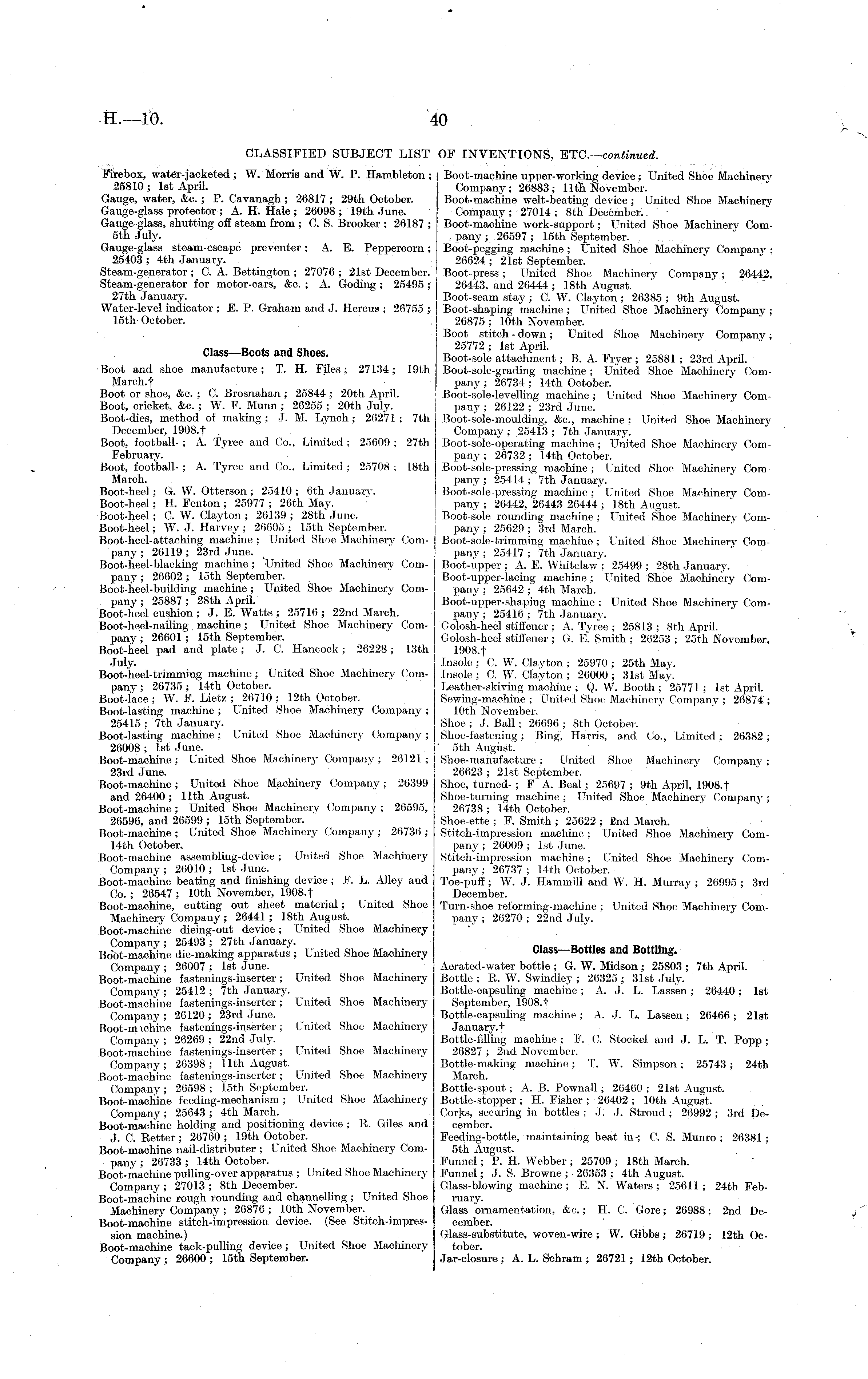 Firebox, water-jacketed ; W. Morris and W. P. Hambleton ; I 25810; Ist April. Gauge, water, &c. ; P. Cavanagh ; 26817 ; 29th October. Gauge-glass protector ; A. H. Hale ; 26098 ; 19th June. Gauge-glass, shutting off steam from ; C. S. Brooker ; 26187 ; | sth July. Gauge-glass steam-escape preventer; A. E. Peppercorn; 25403 ; 4th January. Steam-generator ; C. A. Bettington ; 27076 ; 21st December. Steam-generator for motor-cars, &c. ; A. Goding; 25495 ; 27th January. Water-level indicator ; E. P. Graham and J. Hercus ; 26755 ; 15th October. Class —Boots and Shoes. Boot and shoe manufacture; T. H. Files; 27134; 19th March, f Boot or shoe, &c. ; C. Brosnahan ; 25844 ; 20th April. Boot, cricket, &c. ; W. F. Munn ; 26255 ; 20th July. Boot-dies, method of making; J. M. Lynch; 26271 ; 7th December, 1908.t Boot, football- ; A. Tyree and Co.. Limited ; 25609 ; 27th February. Boot, football-; A. Tyree and Co., Limited; 25708; 18th March. Boot-heel; G. W. Otterson ; 25410 ; 6th January. Boot-heel; H. Fenton ; 25977 ; 26th May. Boot-heel; C. W. Clayton ; 26139 ; 28th June. Boot-heel; W. J. Harvey ; 26605 ; 15th September. Boot-heel-attaching machine ; United Shoe Machinery Company ; 26119; 23rd June. Boot-heel-blacking machine ; United. Shoe Company ; 26602 ; loth September. Boot-heel-building machine ; United Shoe Machinery Com- . pany ; 25887 ; 28th April. Boot-heel cushion ; J. E. Watts ; 25716; 22nd March. Boot-heel-nailing machine; United Shoe Machinery Company; 26601; 15th September. Boot-heel pad and plate; J. C. Hancock; 26228 ; 13th July. Boot-heel-trimming machine ; United Shoe Machinery Company : 26735 ; 14th October. Boot-lace ; W. F. Lietz ; 2671.0 ; 12th October. Boot-lasting machine ; United Shoe Machinery Company ; 25415 ; 7th January. Boot-lasting machine; United Shoe Machinery Company; 26008 ; Ist June. Boot-machine ; United Shoe Machinery Company ; 26121 ; 23rd June. Boot-machine; United Shoe Machinery Company; 26399 and 26400 ; 11th August. Boot-machine ; United Shoe Machinery Company ; 26595, 26596, and. 26599 ; 15th September. Boot-machine ; United Shoe Machinery Company ; 26736 ; 14th October. Boot-machine assembling-device; United Shoe Machinery Company ; 26010 ; Ist June. Boot-machine beating and finishing device ; F. L. Alley and Co. ; 26547 ; 10th November, 1908.f Boot-machine, cutting out sheet material; United Shoe Machinery Company ; 26441 ; 18th August. Boot-machine dieing-out device; United Shoe Machinery Company ; 25493 ; 27th January. Boot-machine die-making apparatus ; United Shoe Machinery Company ; 26007 ; Ist June. Boot-machine fastenings-inserter; United Shoe Machinery Company ; 25412 ; 7th January. Boot-machine fastenings-inserter; United Shoe Machinery Company ; 26120 ; 23rd June. Boot-miohine fastenings-inserter; United Shoe Machinery Company ; 26269 ; 22nd July. Boot-machine fastenings-inserter; United Shoe Machinery Company; 26398; 11th August. Boot-machine fastenings-inserter; United Shoe Machinery Company ; 26598 ; loth September. Boot-machine feeding-mechanism ; United Shoo Machinery Company ; 25643 ; 4th March. Boot-machine holding and positioning device ; R. Giles and J. C. Retter ; 26760 ; 19th October. Boot-machine nail-distributer ; United Shoe Machinery Company ; 26733 ; 14th October. Boot-machine pulling-over apparatus ; United Shoe Machinery Company ; 27013 ; Bth December. Boot-machine rough rounding and channelling ; United Shoe Machinery Company ; 26876 ; 10th November. Boot-machine stitch-impression device. (See Stitch-impres-sion machine.) Boot-machine tack-pulling device ; United Shoe Machinery Company ; 26600 ; 15th September.