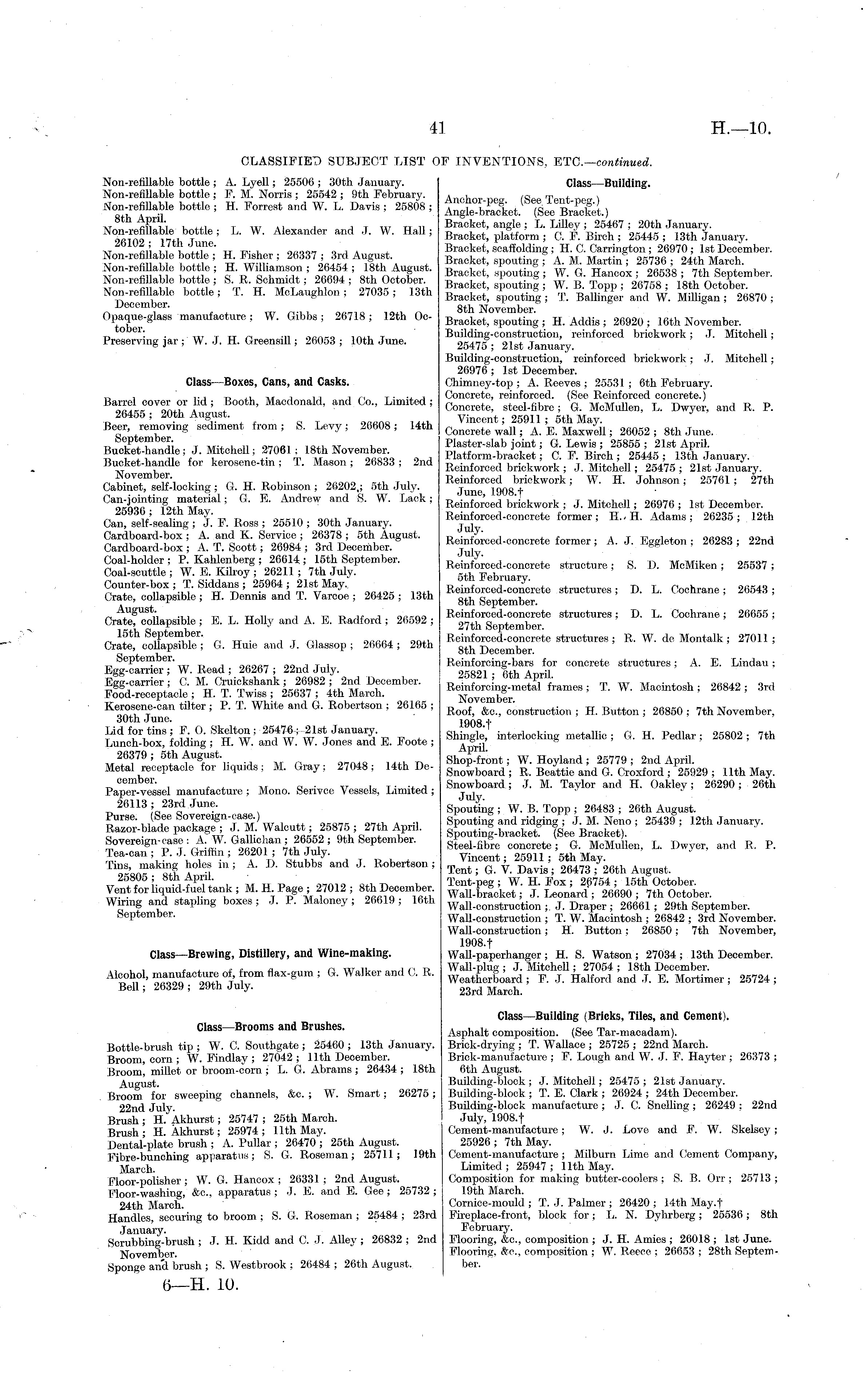 Class—Building. Anchor-peg. (See Tent-peg.) Angle-bracket. (See Bracket.) Bracket, angle ; L. Lilley ; 25467 ; 20th January. Bracket, platform ; C. E. Birch ; 25445 ; 13th January. Bracket, scaffolding ; H. C. Carrington ; 26970 ; Ist December. Bracket, spouting ; A. M. Martin ; 25736 ; 24th March. Bracket, spouting ; W. G. Haneox ; 26538 ; 7th September. Bracket, spouting ; W. B. Topp ; 26758 ; 18th October. Bracket, spouting ; T. Ballinger and W. Milligan ; 26870 ; Bth November. Bracket, spouting ; H. Addis ; 26920 ; 16th November. Building-construction, reinforced brickwork; J. Mitchell ; 25475 ; 21st January. Building-construction, reinforced brickwork; J. Mitchell; 26976 ; Ist December. Chimney-top ;A. Reeves ; 25531 ; 6th February. Concrete, reinforced. (See Reinforced concrete.) Concrete, steel-fibre; G. McMullen, L. Dwyer, and R. P. Vincent; 25911; sth May. Concrete wall; A. E. Maxwell; 26052 ; Bth June. Plaster-slab joint; G. Lewis ; 25855 ; 21st April. Platform-bracket; C. F. Birch ; 25445 ; 13th January. Reinforced brickwork ; J. Mitchell; 25475 ; 21st January. Reinforced brickwork; W. H. Johnson; 25761 ; 27th June, 1908.JReinforced brickwork ; J. Mitchell; 26976 ; Ist December. Reinforced-concrete former; H..H. Adams; 26235; 12th July. Reinforced-concrete former ; A. J. Eggleton ; 26283 ; 22nd July. Reinforced-concrete structure; S. I). McMiken ; 25537 ; sth February. Reinforced-concrete structures ; I). L. Cochrane ; 26543 ; Bth September. Reinforced-concrete structures ; D. L. Cochrane ; 26655 ; 27th September. Reinforced-eoncrete structures; R. W. dc Montalk ; 2701.1 ; Bth December. Reinforcing-bars for concrete structures; A. E. Lindau ; 25821 ; 6th April. Reinforeing-metal frames ; T. W. Macintosh ; 26842 ; 3rd November. Roof, &c, construction ; H. Button ; 26850 ; 7th November, 1908.t Shingle, interlocking metallic ; G. H. Pedlar ; 25802 ; 7th April. Shop-front; W. Hoyland ; 25779 ; 2nd April. Snowboard ; R. Beattie and G. Oroxford ; 25929 ; 11th May. Snowboard; J. M. Taylor and H. Oakley; 26290; 26th July. Spouting ; W. B. Topp ; 26483 ; 26th August. Spouting and ridging ; J. M. Neno ; 25439 ; 12th January. Spouting-bracket. (See Bracket). Steel-fibre concrete; G. McMullen, L. .Dwyer, and R. P. Vincent; 25911; sth May. Tent; G. V. Davis; 26473 ; 26th August. Tent-peg ; W. H. Fox ; 26754 ; 15th October. Wall-bracket; J. Leonard ; 26690 ; 7th October. Wall-construction ; J. Draper ; 26661 ; 29th September. Wall-construction ; T. W. Macintosh ; 26842 ; 3rd. November. Wall-construction; H. Button ; 26850; 7th November, 1908.t Wall-paperhanger ; H. S. Watson ; 27034 ; 13th December. Wall-plug ; J. Mitchell; 27054 ; 18th December. Weatherboard ; F. J. Halford and J. E. Mortimer ; 25724 ; 23rd March. Class —Building (Bricks, Tiles, and Cement). Asphalt composition. (See Tar-macadam). Brick-drying ; T. W T allace ; 25725 ; 22nd March. Brick-manufacture ; F. Lough and W. J. F. Hayter ; 26373 ; 6th August. Building-block ;J. Mitchell; 25475 ; 21st January. Building-block ; T. E. Clark ; 26924 ; 24th December. Building-block manufacture ; J. C. Snelling; 26249 : 22nd July, 1908. f Cement-manufacture; W. J. Love and F. W. Skelsey ; 25926 ; 7th May. Cement-manufacture ; Milburn Lime and Cement Company, Limited; 25947; 11th May. Composition for making butter-coolers; S. B. Orr ; 25713; 19th March. Cornice-mould ; T. J. Palmer ; 26420 ; 14th May.f Fireplace-front, block for; L. N. Dyhrberg; 25536; Bth February. Flooring, &c, composition ; J. H. Amies ; 26018 ; Ist June. Flooring, &c, composition ; W. Recce ; 26653 ; 28th September.