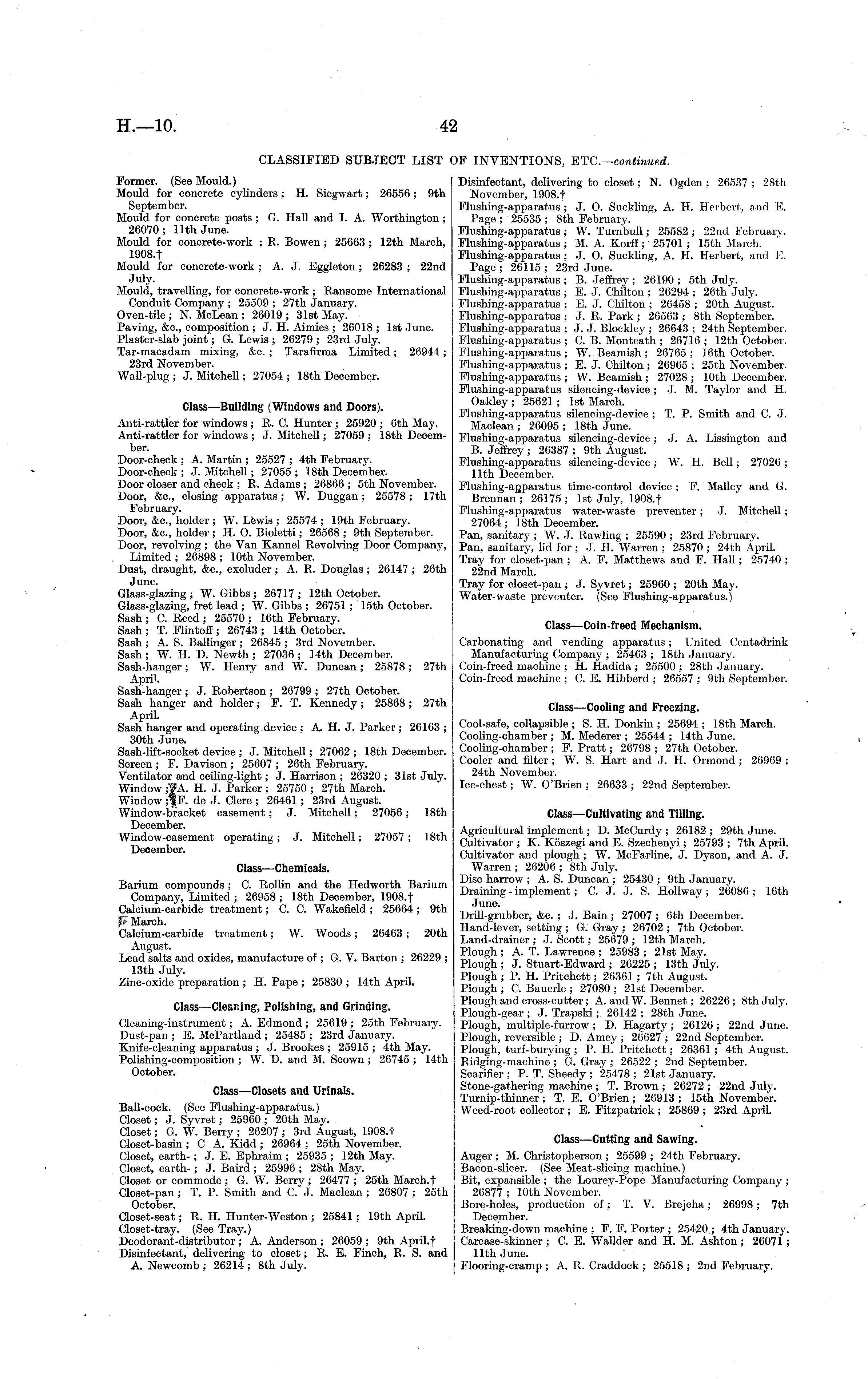 Former. (See Mould.) Mould for concrete cylinders; H. Siegwart; 26556 ; 9th September. Mould for concrete posts ; G. Hall and I. A. Worthington ; 26070; 11th June. Mould for concrete-work ; R. Bowen ; 25663 ; 12th March, 1908.f Mould for concrete-work ; A. J. Eggleton; 26283 ; 22nd JulyMould, travelling, for concrete-work ; Ransome International Conduit Company ; 25509 ; 27th January. Oven-tile ; N. McLean ; 26019 ; 31st May. Paving, &c, composition ; J. H. Aimies ; 26018 ; Ist June. Plaster-slab joint; G. Lewis ; 26279 ; 23rd July. Tar-macadam mixing, <fee. ; Tarafirma Limited; 26944; 23rd November. Wall-plug ; J. Mitchell; 27054 ; 18th December. Class —Building (Windows and Doors). Anti-rattler for windows ; R. C. Hunter ; 25920 ; 6th May. Anti-rattler for windows ; J. Mitchell; 27059 ; 18th December. Door-check ; A. Martin ; 25527 ; 4th February. Door-check ; J. Mitchell; 27055 ; 18th December. Door closer and check ; R. Adams ; 26866 ; sth November. Door, &c., closing apparatus ; W. Duggan ; 25578 ; 17th February. Door, &c., holder ; W. Lewis ; 25574 ; 19th February. Door, &c., holder ; H. O. Bioletti; 26568 ; 9th September. Door, revolving ; the Van Kannel Revolving Door Company, Limited ; 26898 ; 10th November. Dust, draught, &c, excluder ; A. R. Douglas ; 26147 ; 26th June. Glass-glazing ; W. Gibbs ; 26717 ; 12th October. Glass-glazing, fret lead ; W. Gibbs ; 26751 ; 15th October. Sash ; C. Reed ; 25570 ; 16th February. Sash ; T. Flintoff ; 26743 ; 14th October. Sash ; A. S. Ballinger ; 26845 ; 3rd November. Sash ; W. H. D. Newth ; 27036 ; 14th December. Sash-hanger; W. Henry and W. Duncan; 25878; 27th April. Sash-hanger ; J. Robertson ; 26799 ; 27th October. Sash hanger and holder; F. T. Kennedy; 25868; 27th April. Sash hanger and operating device ; A. H. J. Parker ; 26163 ; 30th June. Sash-lift-socket device ; J. Mitchell; 27062 ; 18th December. Screen ; F. Davison ; 25607 ; 26th February. Ventilator and ceiling-light; J. Harrison ; 26320 ; 31st July. Window ;f A. H. J. Parker ; 25750 ; 27th March. Window ;f F. de J. Clere ; 26461; 23rd August. Window-bracket casement; J. Mitchell; 27056; 18th December. Window-casement operating; J. Mitchell; 27057; 18th Deoember. Class —Chemicals. Barium compounds ; C. Rollin and the Hedworth Barium Company, Limited ; 26958 ; 18th December, 1908.f Calcium-carbide treatment; C. C. Wakefield; 25664; 9th f* March. Calcium-carbide treatment; W. Woods; 26463 ; 20th August. Lead salts and oxides, manufacture of ; G. V. Barton ; 26229 ; 13th July. Zinc-oxide preparation ; H. Pape ; 25830 ; 14th April. Class —Cleaning, Polishing, and Grinding. Cleaning-instrument; A. Edmond ; 25619 ; 25th February. Dust-pan ; E. McPartland ; 25485 ; 23rd January. Knife-cleaning apparatus ; J. Brookes ; 25915 ; 4th May. Polishing-composition ; W. D. and M. Scown ; 26745 ; 14th October. Class —Closets and Urinals. Ball-cock. (See Flushing-apparatus.) Closet; J. Syvret; 25960 ; 20th May. Closet; G. W. Berry ; 26207 ; 3rd August, 1908. f Closet-basin; C A.Kidd; 26964; 25th November. Closet, earth- ; J. E. Ephraim ; 25935 ; 12th May. Closet, earth- ; J. Baird ; 25996 ; 28th May. Closet or commode ; G. W. Berry ; 26477 ; 25th March.f Closet-pan ; T. P. Smith and C. J. Maclean ; 26807 ; 25th October. Closet-seat; R. H. Hunter-Weston ; 25841 ; 19th April. Closet-tray. (See Tray.) Deodorant-distributor ; A. Anderson ; 26059 ; 9th April, f Disinfectant, delivering to closet; R. E. Finch, R. S. and A. Newcomb ; 26214 ; Bth July.
