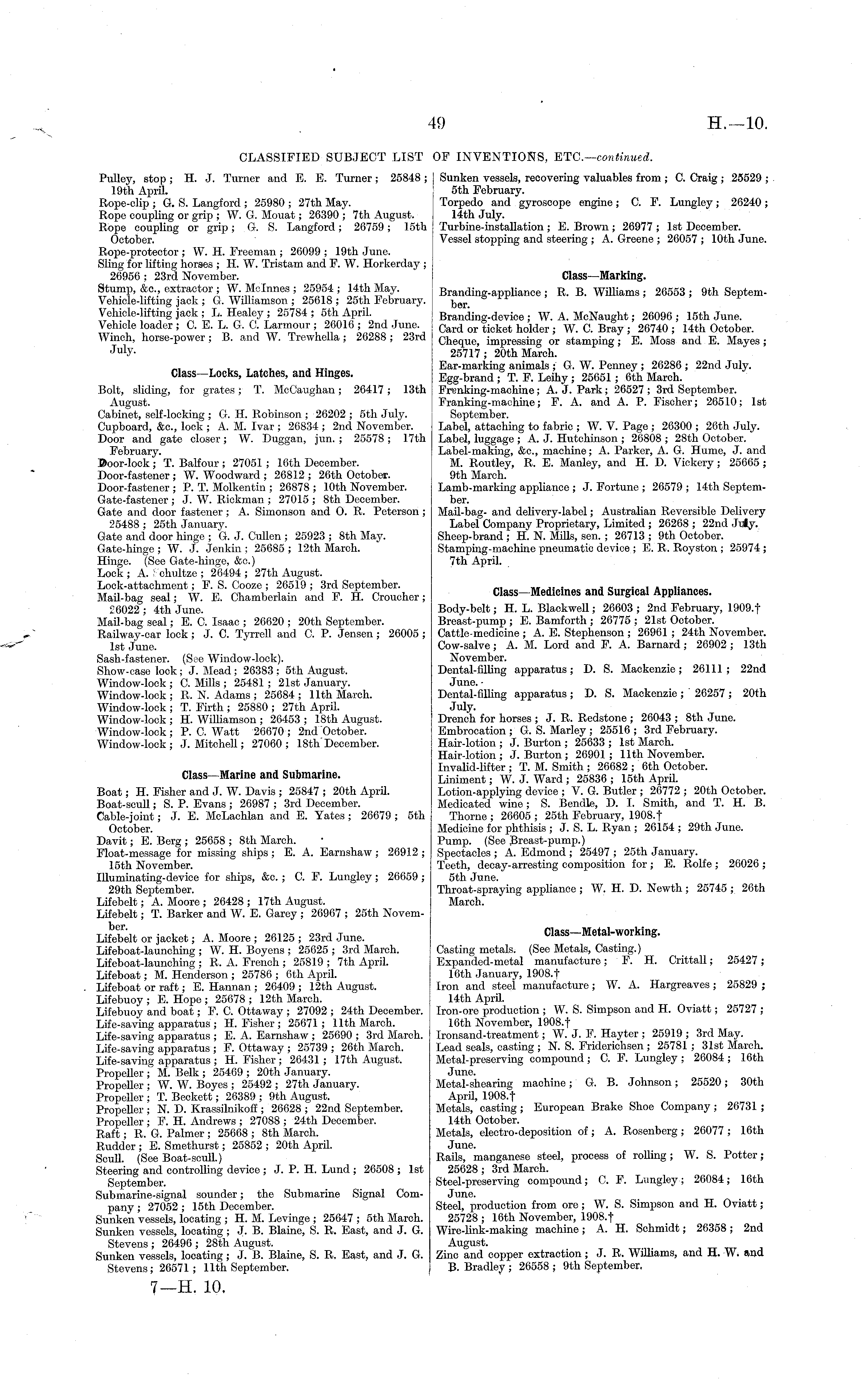 Sunken vessels, recovering valuables from ; C. Craig ; 25529 ; sth February. Torpedo and gyroscope engine; C. P. Lungley; 26240; 14th July. Turbine-installation ; E. Brown ; 26977 ; Ist December. Vessel stopping and steering ; A. Greene ; 26057 ; 10th June. Class —Marking. Branding-appliance ; R. B. Williams ; 26553 ; 9th September. Branding-device ; W. A. McNaught; 26096 ; 15th June. Card or ticket holder ; W. C. Bray ; 26740 ; 14th October. Cheque, impressing or stamping ; E. Moss and E. Mayes ; 25717; 20th March. Ear-marking animals ; G. W. Penney ; 26286 ; 22nd July. Egg-brand ; T. P. Leihy ; 25651 ; 6th March. Frenking-machine; A. J. Park; 26527 ; 3rd September. Franking -machine; F. A. and A. P. Fischer; 26510; Ist September. Label, attaching to fabric ; W. V. Page ; 26300 ; 26th July. Label, luggage ; A. J. Hutchinson ; 26808 ; 28th October. Label-making, &c, machine; A. Parker, A. G. Hume, J. and M. Routley, R. E. Manley, and H. D. Vickery; 25665 ; 9th March. Lamb-marking appliance ; J. Fortune ; 26579 ; 14th September. Mail-bag- and delivery-label; Australian Reversible Delivery Label Company Proprietary, Limited ; 26268 ; 22nd Jiiy. Sheep-brand ; H. N. Mills, sen. ; 26713 ; 9th October. Stamping-machine pneumatic device ; E. R. Royston ; 25974; 7th April. Class—Medicines and Surgical Appliances. Body-belt; H. L. Blackwell; 26603 ; 2nd February, 1909.t Breast-pump ; E. Bamforth ; 26775 ; 21st October. Cattle-medicine ; A. E. Stephenson ; 26961 ; 24th November. Cow-salve ; A. M. Lord and F. A. Barnard; 26902 ; 13th November. Dental-filling apparatus; D. S. Mackenzie; 26111; 22nd June. • Dental-filling apparatus; D. S. Mackenzie; 26257; 20th July. Drench for horses ; J. R. Redstone ; 26043 ; Bth June. Embrocation ; G. S. Marley ; 25516 ; 3rd February. Hair-lotion ; J. Burton ; 25633 ; Ist March. Hair-lotion ; J. Burton ; 26901 ; 11th November. Invalid-lifter ; T. M. Smith ; 26682 ; 6th October. Liniment; W. J. Ward ; 25836 ; 15th April. Lotion-applying device ; V. G. Butler ; 26772 ; 20th October. Medicated wine; S. Bendle, D. I. Smith, and T. H. B. Thome ; 26605 ; 25th February, 1908.f Medicine for phthisis ; J. S. L. Ryan ; 26154 ; 29th June. Pump. (See Breast-pump.) Spectacles ; A. Edmond ; 25497 ; 25th January. Teeth, decay-arresting composition for ; E. Rolfe ; 26026 ; sth June. Throat-spraying appliance ; W. H. D. Newth ; 25745 ; 26th March. Class—Metal-working. Casting metals. (See Metals, Casting.) Expanded-metal manufacture; F. H. Crittall; 25427; 16th January, 1908. f Iron and steel manufacture; W. A. Hargreaves ; 25829 ; 14th April. Iron-ore production ; W. S. Simpson and H. Oviatt; 25727 ; 16th November, 1908.t Ironsand-treatment; W. J. F. Hayter ; 25919 ; 3rd May. Lead seals, casting ; N. S. Friderichsen ; 25781 ; 31st March. Metal-preserving compound ; C. F. Lungley ; 26084 ; 16th June. Metal-shearing machine; G. B. Johnson; 25520; 30th April, 1908. t Metals, casting ; European Brake Shoe Company ; 26731 ; 14th October. Metals, electro-deposition of ; A. Rosenberg ; 26077 ; 16th June. Rails, manganese steel, process of rolling ; W. S. Potter; 25628; 3rd March. Steel-preserving compound; C. F. Lungley; 26084; 16th June. Steel, production from ore; W. S. Simpson and H. Oviatt; 25728 ; 16th November, 1908.t Wire-link-making machine; A. H. Schmidt; 26358; 2nd August. Zinc and copper extraction; J. R. Williams, and H. W. and B. Bradley ; 26558 ; 9th September,