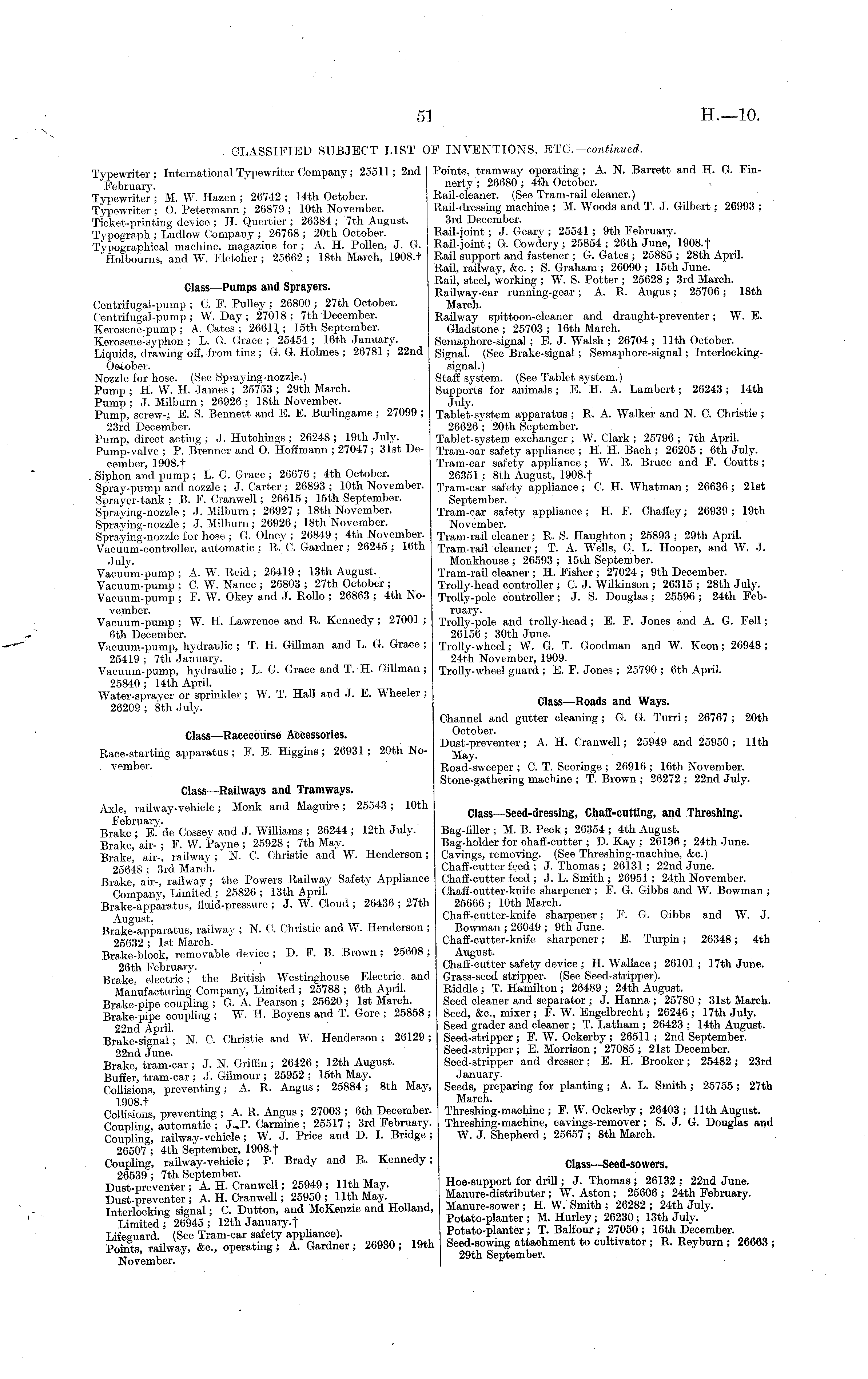 Typewriter; International Typewriter Company; 25511; 2nd 1 February. Typewriter; M. W. Hazen; 26742; 14th October. Typewriter ; O. Petermann ; 26879 ; 10th November. .1 Ticket-printing device ; H. Quertier ; 26384 ; 7th August. Typograph ; Ludlow Company ; 26768 ; 20th October. 1 Typographical machine, magazine for ; A. H. Pollen, J. G. '.Holbourns, and W. Fletcher; 25662; 18th March, 1908-t Class—Pumps and Sprayers. Centrifugal-pump ; C. F. Pulley ; 26800 ; 27th October. Centrifugal-pump ; W. Day ; 27018 ; 7th December. Kerosene-pump ; A. Gates ; 26611 ; 15th September. Kerosene-syphon ; L. G. Grace ; 25454 ; 16th January. Liquids, drawing off, from tins ; G. G. Holmes ; 26781 ; 22nd Ootober. Nozzle for hose. (See Spraying-nozzle.) Pump ; H. W. H. James ; 25753 ; 29th March. Pump ; J. Milburn ; 26926 ; 18th November. Pump, screw-; E. S. Bennett and E. E. Burlingame ; 27099 ; 23rd December. Pump, direct acting ; J. Hutchings ; 26248 ; 19th July. Pump-valve ; P. Brenner and O. Hoffmann ; 27047 ; 31st December, 1908. f . Siphon and pump ; L. G. Grace ; 26676 ; 4th October. Spray-pump and nozzle ; J. Carter ; 26893; 10th November. Sprayer-tank ; B. F. Cranwell; 26615 ; 15th September. Spraying-nozzle ; J. Milburn ; 26927 ; 18th November. Spraying-nozzle; J. Milburn; 26926 ; 18th November. Spraying-nozzle for hose ; G. Olney ; 26849 ; 4th November. Vacuum-controller, automatic ; R. C. Gardner ; 26245 ; 16th July. Vacuum-pump ; A. W. Reid ; 26419 ; 13th August. Vacuum-pump ; C. W. Nance ; 26803 ; 27th October ; Vacuum-pump ; F. W. Okey and J. Rollo ; 26863 ; 4th November. Vacuum-pump ; W. H. Lawrence and R. Kennedy ; 27001 ; 6th December. Vacuum-pump, hydraulic ; T. H. Gillman and L. G. Grace ; 25419 ; 7th January. Vacuum-pump, hydraulic; L. G. Grace and T. H. Gillman; 25840 ; 14th April. Water-sprayer or sprinkler ; W. T. Hall and J. E. Wheeler ; 26209 ; Bth July. Class — Racecourse Accessories. Race-starting apparatus ; F. E. Higgins ; 26931 ; 20th November. Class—Railways and Tramways. Axle, railway-vehicle ; Monk and Maguire ; 25543 ; 10th February. Brake; E. de Cossey and J. Williams ; 26244; 12th July. Brake, air- ; F. W. Payne ; 25928 ; 7th May. Brake, air-, railway ;' N. C. Christie and W. Henderson; 25648 ; 3rd March. Brake, air-, railway ; the Powers Railway Safety Appliance Company, Limited ; 25826 ; 13th April. Brake-apparatus, fluid-pressure ; J. W. Cloud ; 26436 ; 27th August. Brake-apparatu.s, railway ; N. C. Christie and W. Henderson ; 25632; Ist March. Brake-block, removable device ; D. F. B. Brown; 25608 ; 26th February. Brake, electric ; the British Westinghouse Electric and Manufacturing Company, Limited ; 25788 ; 6th April. Brake-pipe coupling ; G. A. Pearson ; 25620 ; Ist March. Brake-pipe coupling ; W. H. Boyens and T. Gore ; 25858 22nd April. Brake-signal; N. C. Christie and W. Henderson; 26129 22nd June. Brake, tram-car ; J. N. Griffin ; 26426 ; 12th August. Buffer, tram-car ; J. Gilmour ; 25952 ; 15th May. Collisions, preventing; A. R. Angus; 25884; Bth May 1908.t Collisions, preventing ; A. R. Angus ; 27003 ; 6th Decembei Coupling, automatic ; J..P. Carmine ; 25517 ; 3rd February Coupling, railway-vehicle; W. J. Price and D. I. Bridge 26507 ; 4th September, 1908. t Coupling, railway-vehicle; P. Brady and R. Kennedy 26539 ; 7th September. Dust-preventer ; A. H. Cranwell; 25949 ; 11th May. Dust-preventer ; A. H. Cranwell; 25950 ; 11th May. Interlocking signal; C. Dutton, and McKenzie and Holland Limited; 26945; 12th January, f Lifeguard. (See Tram-oar safety appliance). Points, railway, &c, operating ; A. Gardner ; 26930 ; 19t November.