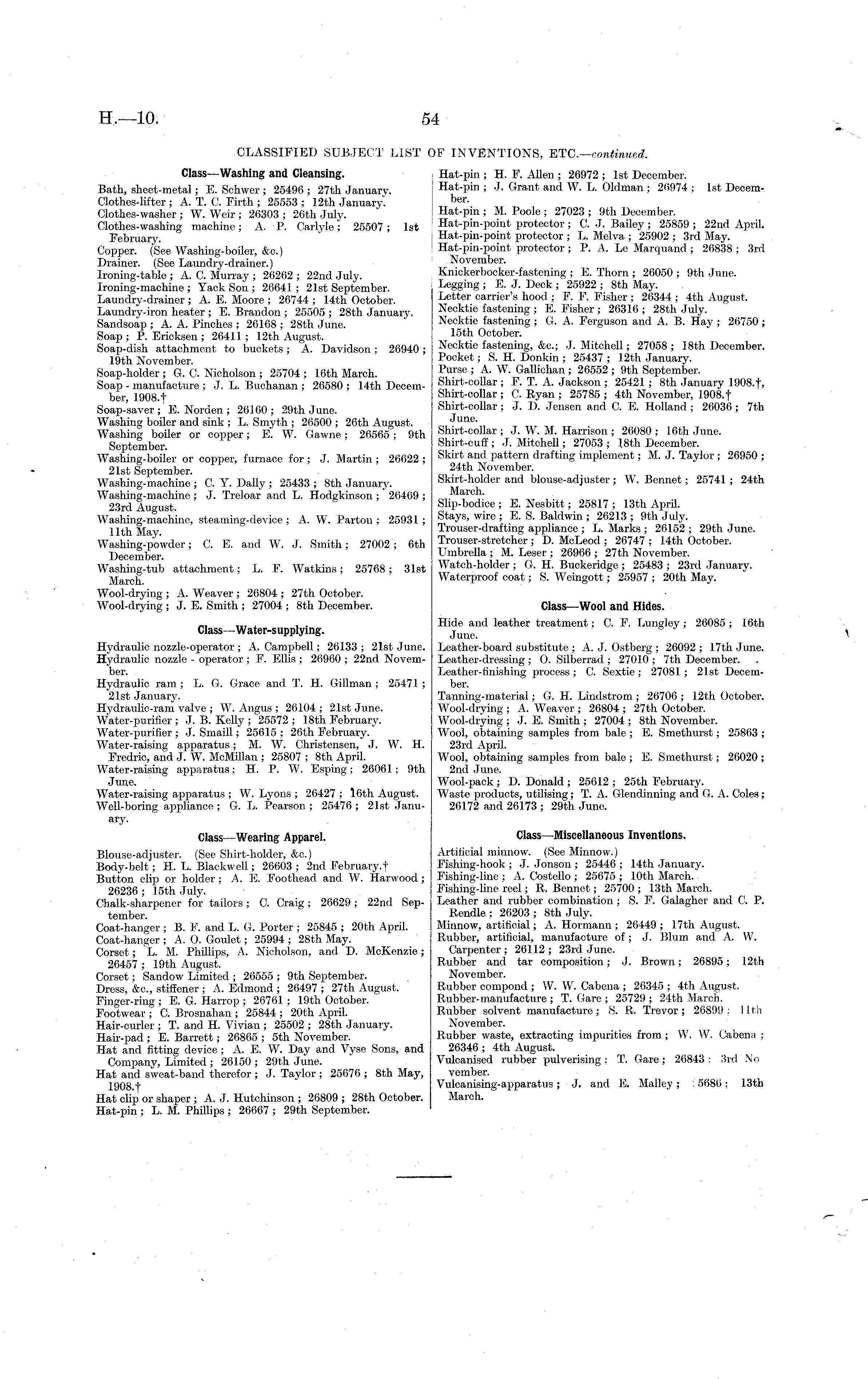 Hat-pin ; H. F. Allen ; 26972 ; Ist December. Hat-pin ; J. Grant and W. L. Oldman ; 26974 ; Ist December. Hat-pin ; M. Poole ; 27023 ; 9th December. Hat-pin-point protector ; C. J. Bailey ; 25859 ; 22nd April. Hat-pin-point protector ; L. Melva ; 25902 ; 3rd May. Hat-pin-point protector; P. A. Lo Marquand ; 20838 ; 3rd November. Knickerbocker-fastening ; E. Thorn ; 26050 ; 9th June. Legging ; E. J. Deck ; 25922 ; Bth May. Letter carrier's hood ; F. F. Fisher ; 26344 ; 4th August. Necktie fastening ; E. Fisher ; 26316 ; 28th July. Necktie fastening ; G. A. Ferguson and A. B. Hay ; 26750 ; 15th October. Necktie fastening, &c; J. Mitchell; 27058 ; 18th December. Pocket; S. H. Donkin ; 25437 ; 12th January. Purse ; A. W. Gallichan ; 26552 ; 9th September. Shirt-collar ; F. T. A. Jackson ; 25421 ; Bth January 1908. f, Shirt-collar ; G. Ryan ; 25785 ; 4th November, 1908.t Shirt-collar ; J. D. Jensen and C. E. Holland ; 26036 ; 7th June. Shirt-collar ; J. W. M. Harrison ; 26080 ; 16th June. Shirt-cuff ; J. Mitchell; 27053 ; 18th December. Skirt and pattern drafting implement; M. J. Taylor ; 26950 ; 24th November. Skirt-holder and blouse-adjuster ; W. Bennet; 25741 ; 24th March. Slip-bodice ; E. Nesbitt; 25817 ; 13th April. Stays, wire ; E. S. Baldwin ; 26213 ; 9th July. Trouser-drafting appliance ; L. Marks ; 26152 ; 29th June. Trouser-stretcher ; D. McLeod ; 26747 ; 14th October. Umbrella ; M. Leser ; 26966 ; 27th November. Watch-holder ; G. H. Buokeridge ; 25483 ; 23rd January. Waterproof coat; S. Weingott; 25957 ; 20th May. Class—Wool and Hides. Hide and leather treatment; C. F. Lungley ; 26085 ; 16th June. Leather-board substitute ; A. J. Ostberg ; 26092 ; 17th June. Leather-dressing ; 0. Silberrad ; 27010 ; 7th December. Leather-finishing process ; C. Sextie ; 27081 ; 21st December. Tanning-material; G. H. Lindstrom ; 26706 ; 12th October. Wool-drying ; A. Weaver ; 26804 ; 27th October. Wool-drying ; J. E. Smith ; 27004 ; Bth November. Wool, obtaining samples from bale; E. Smethurst; 25863 ; 23rd April. Wool, obtaining samples from bale ; E. Smethurst; 26020 ; 2nd June. Wool-pack ; D. Donald ; 25612 ; 25th February. Waste products, utilising; T. A. Glendinning and G. A. Coles; 26172 and 26173 ; 29th June. Class—Miscellaneous Inventions. Artificial minnow. (See Minnow.) Fishing-hook ; J. Jonson ; 25446 ; 14th January. Fishing-line ; xV. Costello ; 25675 ; 10th March. Fishing-line reel; R. Bennet; 25700 ; 13th March. Leather and rubber combination ; S. F. Galagher and C. P. Rendle ; 26203 ; Bth July. Minnow, artificial; A. Hormann ; 26449 ; 17th August. Rubber, artificial, manufacture of; J. Blum and A. W. Carpenter ; 26112 ; 23rd June. Rubber and tar composition; J. Brown: 26895; 12th November. Rubber compond ; W. W. Cabena ; 26345 ; 4th August. Rubber-manufacture ; T. Gare ; 25729 ; 24th March. Rubber solvent manufacture ; S. R. Trevor ; 26899 ; 1 It'n November. Rubber waste, extracting impurities from ; W. W. Cabena : 26346 ; 4th August. Vulcanised rubber pulverising; T. Gare; 26843 : 3rd No vember. Vuloanising-apparatus; J. and B. Malley ; '. 5686: 13th March.