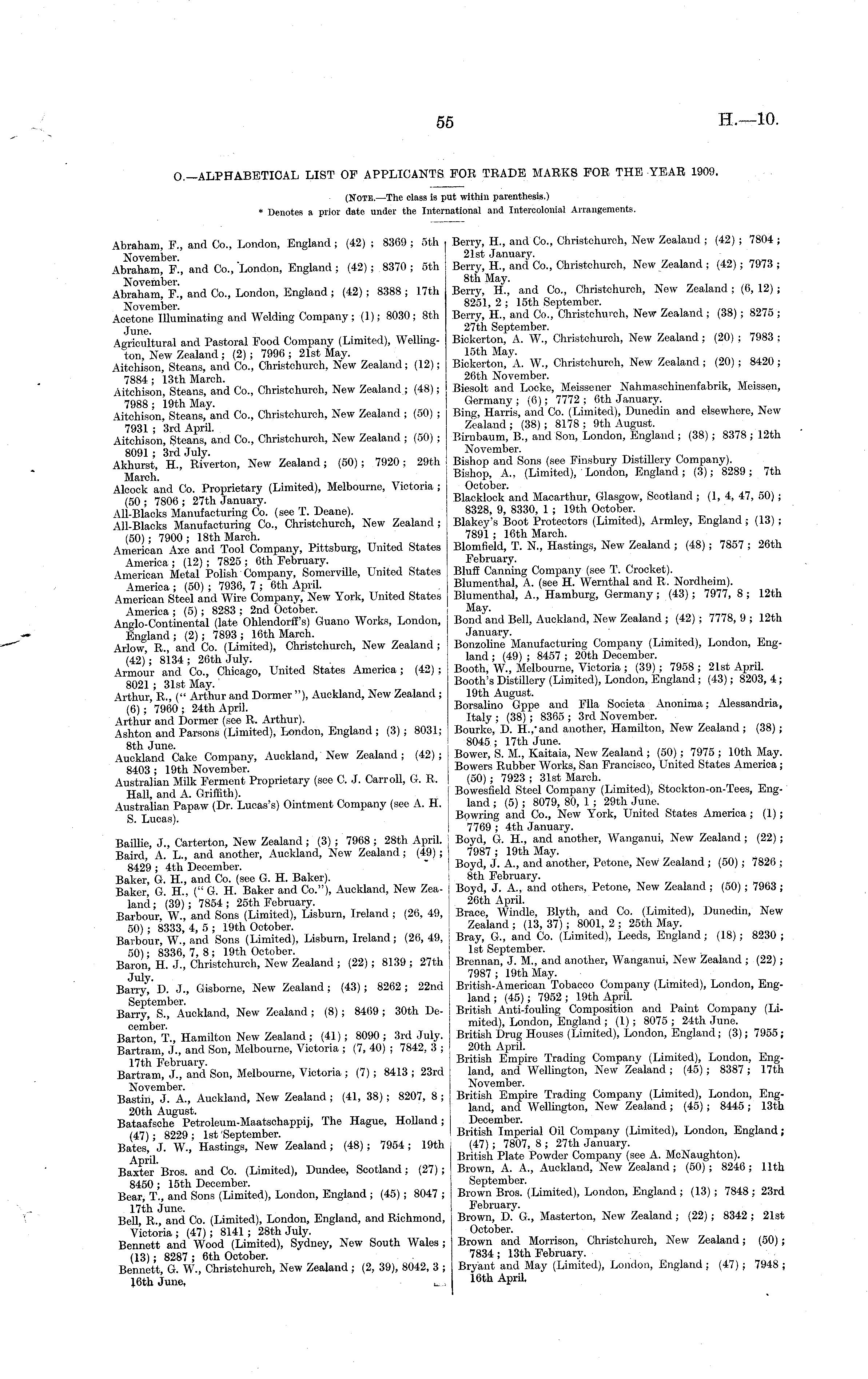 Berry, H., and Co., Christehurch, New Zealand ; (42) ; 7804 ; 21st January. Berry, H., and Co., Christehurch, New Zealand ; (42); 7973; Bth May. Berry, H., and Co., Christehurch, New Zealand; (6, 12) ; 8251, 2 ; 15th September. Berry, H., and Co., Christohurch, New Zealand ; (38); 8275 ; 27th September. Bickerton, A. W., Christehurch, New Zealand ; (20) ; 7983 : 15th May. Bickerton,"A. W., Christehurch, New Zealand; (20); 8420; 26th November. Biesolt and Locke, Meissener Nahmaschinenfabrik, Meissen, Germany; (6); 7772; 6th January. Bing, Harris, and Co. (Limited), Dunedin and elsewhere, New Zealand ; (38) ; 8178 ; 9th August. Birnbaum, 8., and Son, London, England ; (38); 8378 ; 12th November. Bishop and Sons (see Finsbury Distillery Company). Bishop, A., (Limited), London, England; (3); 8289; 7th October. Blacklock and Maearthur, Glasgow, Scotland ; (1, 4, 47, 50) ; 8328, 9, 8330, 1 ; 19th October. Blakey's Boot Protectors (Limited), Armley, England ; (13) ; 7891 ; 16th March. Blomfield, T. N., Hastings, New Zealand ; (48) ; 7857 ; 26th February. Bluff Canning Company (see T. Crocket). Blumenthal, A. (see H. Wernthal and R. Nordheim). Blumenthal, A., Hamburg, Germany; (43); 7977, 8 ; 12th May. Bond and Bell, Auckland, New Zealand ; (42) ; 7778, 9 ; 12th January. Bonzoline Manufacturing Company (Limited), London, England ; (49) ; 8457 ; 20th December. Booth, W., Melbourne, Victoria ; (39) ; 7958 ; 21st April. Booth's Distillery (Limited), London, England; (43); 8203, 4 ; 19th August. Borsalino Gppe and FUa Societa Anonima; Alessandria, Italy ; (38) ; 8365 ; 3rd November. Bourke, D. H.,'and another, Hamilton, New Zealand ; (38) ; 8045 ; 17th June. Bower, S. M., Kaitaia, New Zealand ; (50); 7975 ; 10th May. Bowers Rubber Works, San Francisco, United States America; (50) ; 7923 ; 31st March. Bowesfield Steel Company (Limited), Stockton-on-Tees, England ; (5) ; 8079, 80, 1 ; 29th June. Bo wring and Co., New York, United States America; (1); 7769 ; 4th January. Boyd, G. H., and another, Wanganui, New Zealand; (22) ; 7987 ; 19th May. Boyd, J. A., and another, Petone, New Zealand ; (50) ; 7826 ; Bth February. Boyd, J. A., and others, Petone, New Zealand ; (50) ; 7963 ; 26th April. Brace, Windle, Blyth, and Co. (Limited), Dunedin, New Zealand ; (13, 37) ; 8001, 2 ; 25th May. Bray, G., and Co. (Limited), Leeds, England ; (18); 8230 ; Ist September. Brennan, J. M., and another, Wanganui, New Zealand ; (22); 7987 ; 19th May. British-American Tobacco Company (Limited), London, England ; (45); 7952 ; 19th April. British Anti-fouling Composition and Paint Company (Limited), London, England ; (1); 8075 ; 24th June. British Drug Houses (Limited), London, England; (3); 7955; 20th April. British Empire Trading Company (Limited), London, England, and Wellington, New Zealand ; (45) ; 8387 ; 17th November. British Empire Trading Company (Limited), London, England, and Wellington, New Zealand; (45) ; 8445 ; 13th December. British Imperial Oil Company (Limited), London, England; j (47); 7807, 8 ; 27th January. British Plate Powder Company (see A. McNaughton). Brown, A. A., Auckland, New Zealand ; (50) ; 8246 ; 11th September. Brown Bros. (Limited), London, England ; (13); 7848 ; 23rd February. Brown, D. G., Masterton, New Zealand ; (22) ; 8342 ; 21st October. Brown and Morrison, Christehurch, New Zealand; (50); 7834; 13th February. Bryant and May (Limited), London, England ; (47) ; 7948 ; 16th April.