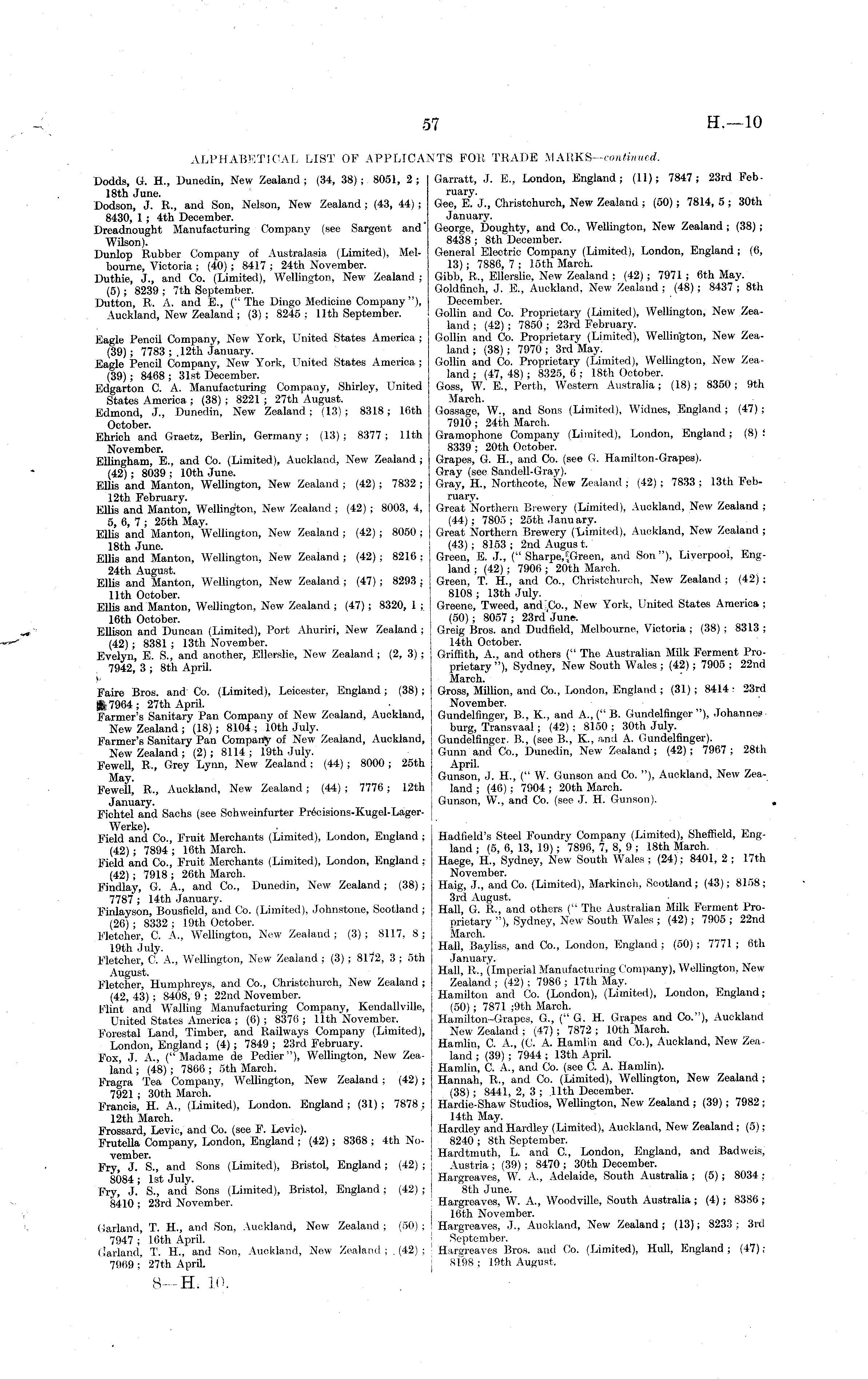Dodds, G. H., Dunedin, New Zealand; (34, 38) ; 8051, 2 ; 18th June. Dodson, J. R., and Son, Nelson, New Zealand; (43, 44) ; 8430, 1 ; 4th December. Dreadnought Manufacturing Company (see Sargent and Wilson). Dunlop Rubber Company of Australasia (Limited), Melbourne, Victoria ; (40) ; 8417 ; 24th November. Dttthie, J., and Co. (Limited), Wellington, New Zealand ; (5); 8239 ; 7th September. Dutton, R. A. and E., (" The Dingo Medicine Company "), Auckland, New Zealand ; (3) ; 8245 ; 11th September. Eagle Pencil Company, New York, United States America ; (39); 7783 ; ,12th January. Eagle Pencil Company, New York, United States America ; (39); 8468 ; 31st December. Edgarton C. A. Manufacturing Company, Shirley, United States America ; (38) ; 8221 ; 27th August. Edmond, J., Dunedin, New Zealand ; (13); 8318; 16th October. Enrich and Graetz, Berlin, Germany; (13) ; 8377; 11th November. Ellingham, E., and Co. (Limited), Auckland, New Zealand ; (42); 8039 ; 10th June. Ellis and Manton, Wellington, New Zealand ; (42) ; 7832 ; 12th February. Ellis and Manton, Wellington, New Zealand ; (42) ; 8003, 4, 5, 6, 7 ; 25th May. Ellis and Manton, Wellington, New Zealand ; (42) ; 8050 ; 18th June. Ellis and Manton, Wellington, New Zealand ; (42); 8216 ; 24th August. Ellis and Manton, Wellington, New Zealand ; (47) ; 8293 ; 11th October. Ellis and Manton, Wellington, New Zealand ; (47) ; 8320, 1 ; 16th October. Ellison and Duncan (Limited), Port Ahuriri, New Zealand ; (42) ; 8381 ; 13th November. Evelyn, E. S., and another, Ellerslie, New Zealand ; (2, 3); 7942, 3 ; Bth April. Faire Bros, and Co. (Limited), Leicester, England; (38); 817964; 27th April. Farmer's Sanitary Pan Company of New Zealand, Auckland, New Zealand ; (18); 8104 ; 10th July. Farmer's Sanitary Pan Company of New Zealand, Auckland, New Zealand ; (2) ; 8114 ; 19th July. Fewell, R., Grey Lynn, New Zealand ; (44) ; 8000 ; 25th May. Fewell, R., Auckland, New Zealand ; (44) ; 7776; 12th January. Fichtel and Sachs (see Schweinfurter Prfcisions-Kugel-Lager-Werke). Field and Co., Fruit Merchants (Limited), London, England ; (42) ; 7894 ; 16th March. Field and Co., Fruit Merchants (Limited), London, England ; (42) ; 7918 ; 26th March. Findlay, G. A., and Co., Dunedin, New Zealand; (38) ; 7787 ; 14th January. Finlayson, Bousliold, and Co. (Limited), Johnstone, Scotland ; (26) ; 8332 ; 19th October. Fletcher, C. A., Wellington, New Zealand ; (3) ; 8117, 8 ; 19th July. Fletcher, C. A., Wellington, New Zealand ; (3) ; 8172, 3 ; sth August. Fletcher, Humphreys, and Co., Christehuroh, New Zealand ; (42, 43) ; 8408, 9 ; 22nd November. Mint and Walling Manufacturing Company, Kendallville, United States America ; (6) ; 8376 ; 11th November. Forestal Land, Timber, and Railways Company (Limited), London, England ; (4); 7849 ; 23rd February. Fox, J. A., ("Madame de Pedier"), Wellington, New Zealand ; (48) ; 7866 ; sth March. Fragra Tea Company, Wellington, New Zealand; (42) ; 7921 ; 30th March. Francis, H. A., (Limited), London. England; (31); 7878; 12th March. Frossard, Levic, and Co. (see F. Levic). Frutella Company, London, England ; (42); 8368 ; 4th November. Fry, J. S., and Sons (Limited), Bristol, England; (42) ; 8084 ; Ist July. Fry, J. S., and Sons (Limited), Bristol, England ; (42) ; 8410 ; 23rd November. Garland, T. H., and Son, Auckland, New Zealand ; (50) ; 7947 ; 16th April. (Jarland. T. H., and Son, Auckland, New Zealand ; . (42) ; 7969 ; 27th April B—H. 10.