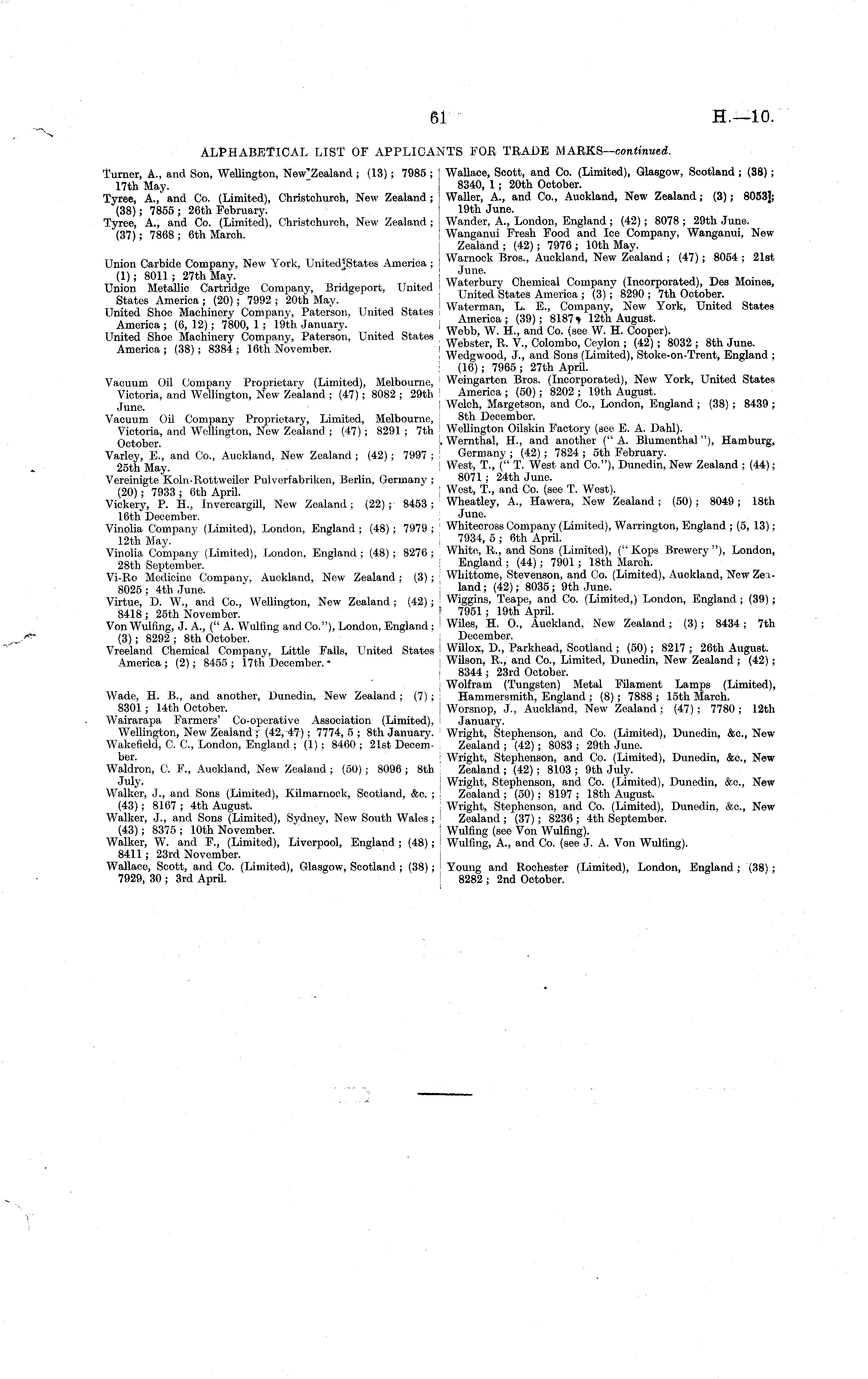 Wallace, Scott, and Co. (Limited), Glasgow, Scotland ; (38); 8340, 1; 20th October. Waller, A., and Co., Auckland, New Zealand; (3); 8053]; 19th June. Wander, A., London, England ; (42); 8078 ; 29th June. Wanganui Fresh Food and Ice Company, Wanganui, New Zealand ; (42); 7976 ; 10th May. Warnock Bros., Auckland, New Zealand ; (47); 8054 ; 21st June. Waterbury Chemical Company (Incorporated), Dcs Moines, United States America ; (3) ; 8290 ; 7th October. Waterman, L. E., Company, New York, United States America; (39); 12th August. Webb, W. H., and Co. (see W. H. Cooper). Webster, R. V., Colombo, Ceylon ; (42) ; 8032 ; Bth June. Wedgwood, J., and Sons (Limited), Stoke-on-Trent, England ; (16); 7965 ; 27th April. Weingarten Bros. (Incorporated), New York, United States America ; (50); 8202 ; 19th August. Welch, Margetson, and Co., London, England ; (38) ; 8439 ; Bth December. Wellington Oilskin Factory (see E. A. Dahl). Wernthal, H., and another (" A. Blumenthal"), Hamburg, Germany ; (42); 7824 ; sth February. West, T., (" T. West and Co."), Dunedin, New Zealand ; (44); 8071 ; 24th June. West, T., and Co. (see T. West). Wheatley, A., Hawera, New Zealand ; (50); 8049 ; 18th June. Whitecross Company (Limited), Warrington, England ; (5, 13); 7934, 5 ; 6th April. White, R., and Sons (Limited), (" Kops Brewery "), London, England ; (44); 7901 ; 18th March. Wluttome, Stevenson, and Co. (Limited), Auokland, New Zeiland; (42); 8035; 9th June. Wiggins, Teape, and Co. (Limited,) London, England.; (39) ; 7951 ; 19th April. Wiles, H. 0., Auckland, New Zealand; (3) ; 8434; 7th December. Willox, D., Parkhead, Scotland ; (50); 8217 ; 26th August. Wilson, R., and Co., Limited, Dunedin, New Zealand; (42); 8344; 23rd October. Wolfram (Tungsten) Metal Filament Lamps (Limited), Hammersmith, England ; (8); 7888 ; 15th March. Worsnop, J., Auckland, New Zealand; (47) ; 7780; 12th January. Wright, Stephenson, and Co. (Limited), Dunedin, &c, New Zealand ; (42); 8083 ; 29th June. Wright, Stephenson, and Co. (Limited), Dunedin, &c, New Zealand ; (42); 8103 ; 9th July. Wright, Stephenson, and Co. (Limited), Dunedin, &c, New Zealand ; (50); 8197 ; 18th August. Wright, Stephenson, and Co. (Limited), Dunedin, &c, New Zealand ; (37); 8236 ; 4th September. Wulfing (see Yon Wulfing). Wulfing, A., and Co. (see J. A. Yon Wulfing). Young and Rochester (Limited), London, England; (38) ; 8282; 2nd October.