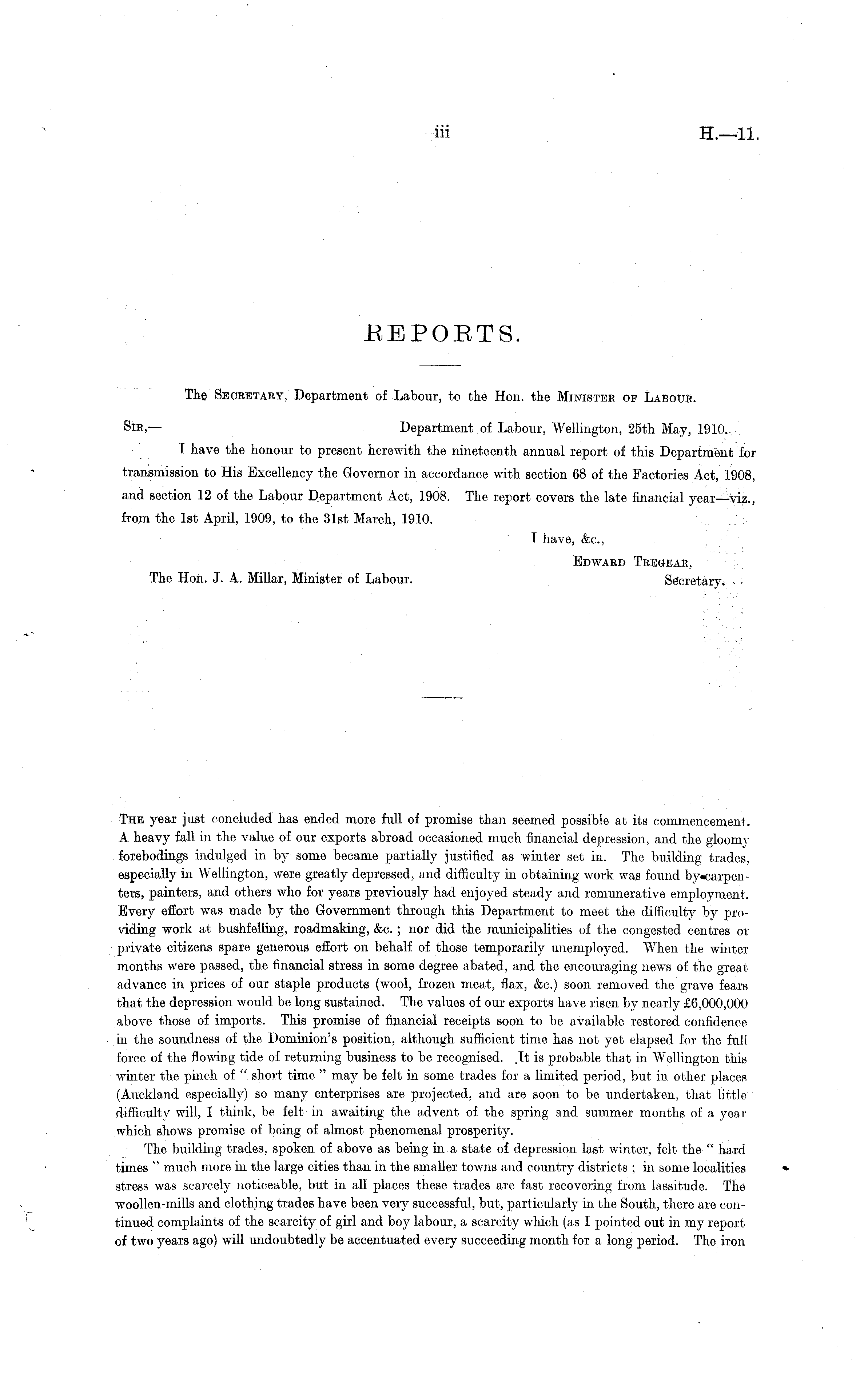 -RBPOETS. The Secretary, Department of Labour, to the Hon. the Minister of Labour. Sir,— Department of Labour, Wellington, 25th May, 1910. I have the honour to present herewith the nineteenth annual report of this Department for transmission to His Excellency the Governor in accordance with section 68 of the Factories Act, 1908, and section 12 of the Labour Department Act, 1908. The report covers the late financial year—viz., from the Ist April, 1909, to the 31st March, 1910. I have, &c, Edward Tregear, The Hon. J. A. Millar, Minister of Labour. Secretary, i