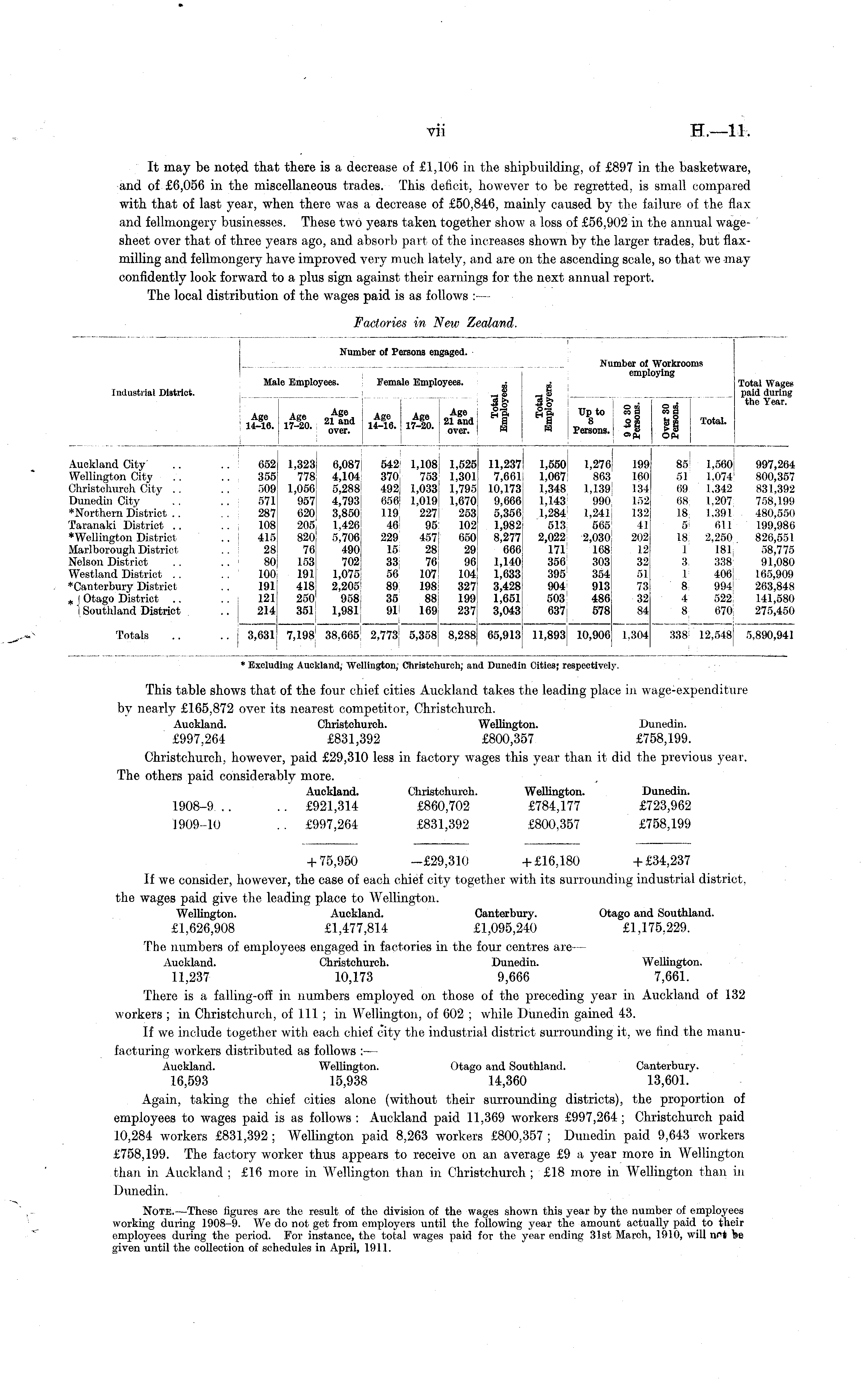 * Excluding Auckland, Wellington; Ohristchurch; and Dunedin Cities; respectively. This table shows that of the four chief cities Auckland takes the leading place in wage-expenditure by nearly £165,872 over its nearest competitor, Ohristchurch. Auckland. Ohristchurch. Wellington. Dunedin. £997,264 £831,392 £800,357 £758,199. Ohristchurch, however, paid £29,310 less in factory wages this year than it did the previous year. The others paid considerably more. Auckland. Christchurch. Wellington. Dunedin. 1908-9. .. .. £921,314 £860,702 £784,177 £723,962 1909-10 .. £997,264 £831,392 £800,357 £758,199 + 75,950 -£29,310 +£16,180 +£34,237 If we consider, however, the case of each chief city together with its surrounding industrial district, the wages paid give the leading place to Wellington. Wellington. Auckland. Canterbury. Otago and Southland. £1,626,908 £1,477,814 £1,095,240 £1,175,229. The numbers of employees engaged in factories in the four centres are — Auckland. Christchurch. Dunedin. Wellington. 11,237 10,173 9,666 7,661. There is a falling-off in numbers employed on those of the preceding year in Auckland of 132 workers ; in Christchurch, of 111 ; in Wellington, of 602 ; while Dunedin gained 43. If we include together with each chief city the industrial district surrounding it, we find the manufacturing workers distributed as follows ; — Auckland. Wellington. Otago and Southland. Canterbury. 16,593 15,938 14,360 13,601. Again, taking the chief cities alone (without their surrounding districts), the proportion of employees to wages paid is as follows : Auckland paid 11,369 workers £997,264; Christchurch paid 10,284 workers £831,392 ; Wellington paid 8,263 workers £800,357 ; Dunedin paid 9,643 workers £758,199. The factory worker thus appears to receive on an average £9 a year more in Wellington than in Auckland ; £16 more in Wellington than in Christchurch ; £18 more in Wellington than in Dunedin. Note.—These figures are the result of the division of the wages shown this year by the number of employees working during 1908-9. We do not get from employers until the following year the amount actually paid to their employees during the period. For instance, the total wages paid for the year ending 31st March, 1910, will nnt he given until the collection of schedules in April, 1911.