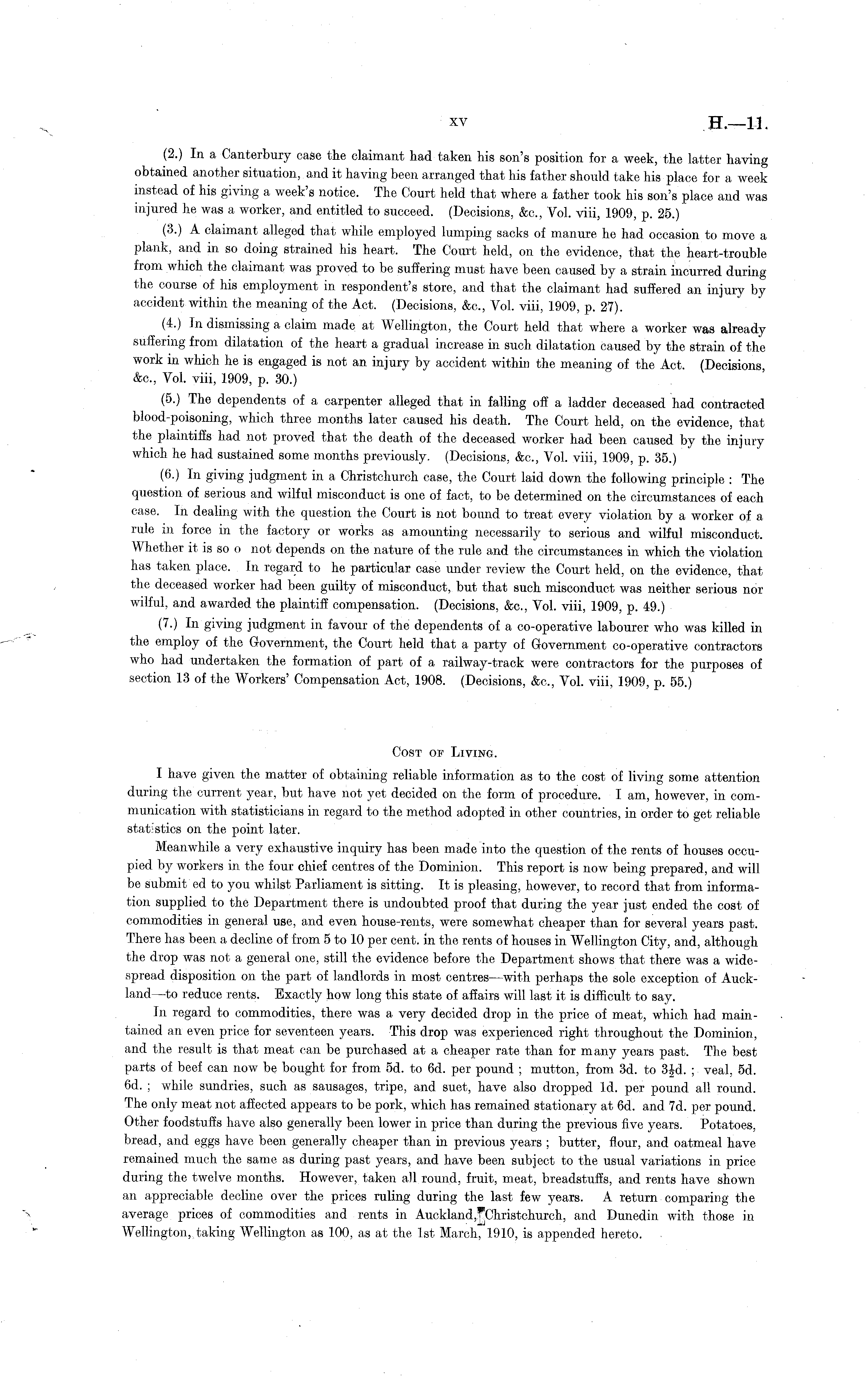 (2.) In a Canterbury case the claimant had taken his son's position for a week, the latter having obtained another situation, and it having been arranged that his father should take his place for a week instead of his giving a week's notice. The Court held that where a father took his son's place and was injured he was a worker, and entitled to succeed. (Decisions, &c, Vol. viii, 1909, p. 25.) (3.) A claimant alleged that while employed lumping sacks of manure he had occasion to move a plank, and in so doing strained his heart. The Court held, on the evidence, that the heart-trouble from which the claimant was proved to be suffering must have been caused by a strain incurred during the course of his employment in respondent's store, and that the claimant had suffered an injury by accident within the meaning of the Act. (Decisions, &c, Vol. viii, 1909, p. 27). (4.) In dismissing a claim made at Wellington, the Court held that where a worker was already suffering from dilatation of the heart a gradual increase in such dilatation caused by the strain of the work in which he is engaged is not an injury by accident within the meaning of the Act. (Decisions, &c, Vol. viii, 1909, p. 30.) (5.) The dependents of a carpenter alleged that in falling off a ladder deceased had contracted blood-poisoning, which three months later caused his death. The Court held, on the evidence, that the plaintiffs had not proved that the death of the deceased worker had been caused by the injury which he had sustained some months previously. (Decisions, &c, Vol. viii, 1909, p. 35.) (6.) In giving judgment in a Christchurch case, the Court laid down the following principle : The question of serious and wilful misconduct is one of fact, to be determined on the circumstances of each case. In dealing with the question the Court is not bound to treat every violation by a worker of a rule in force in the factory or works as amounting necessarily to serious and wilful misconduct. Whether it is so o not depends on the nature of the rule and the circumstances in which the violation has taken place. In regard to he particular case under review the Court held, on the evidence, that the deceased worker had been guilty of misconduct, but that such misconduct was neither serious nor wilful, and awarded the plaintiff compensation. (Decisions, &c, Vol. viii, 1909, p. 49.) (7.) In giving judgment in favour of the dependents of a co-operative labourer who was killed in the employ of the Government, the Court held that a party of Government co-operative contractors who had undertaken the formation of part of a railway-track were contractors for the purposes of section 13 of the Workers' Compensation Act, 1908. (Decisions, &c, Vol. viii, 1909, p. 55.) Cost of Living. I have given the matter of obtaining reliable information as to the cost of living some attention during the current year, but have not yet decided on the form of procedure. I am, however, in communication with statisticians in regard to the method adopted in other countries, in order to get reliable statistics on the point later. Meanwhile a very exhaustive inquiry has been made into the question of the rents of houses occupied by workers in the four chief centres of the Dominion. This report is now being prepared, and will be submit ed to you whilst Parliament is sitting. It is pleasing, however, to record that from information supplied to the Department there is undoubted proof that during the year just ended the cost of commodities in general use, and even house-rents, were somewhat cheaper than for several years past. There has been a decline of from 5 to 10 per cent, in the rents of houses in Wellington City, and, although the drop was not a general one, still the evidence before the Department shows that there was a widespread disposition on the part of landlords in most centres —with perhaps the sole exception of Auckland—to reduce rents. Exactly how long this state of affairs will last it is difficult to say. In regard to commodities, there was a very decided drop in the price of meat, which had maintained an even price for seventeen years. This drop was experienced right throughout the Dominion, and the result is that meat can be purchased at a cheaper rate than for many years past. The best parts of beef can now be bought for from sd. to 6d. per pound ; mutton, from 3d. to 3Jd. ; veal, sd. 6d. ; while sundries, such as sausages, tripe, and suet, have also dropped Id. per pound all round. The only meat not affected appears to be pork, which has remained stationary at 6d. and 7d. per pound. Other foodstuffs have also generally been lower in price than during the previous five years. Potatoes, bread, and eggs have been generally cheaper than in previous years ; butter, flour, and oatmeal have remained much the same as during past years, and have been subject to the usual variations in price during the twelve months. However, taken all round, fruit, meat, breadstuffs, and rents have shown an appreciable decline over the prices ruling during the last few years. A return comparing the average prices of commodities and rents in Auckland,fChristchurch, and Dunedin with those in Wellington, taking Wellington as 100, as at the Ist March, 1910, is appended hereto.